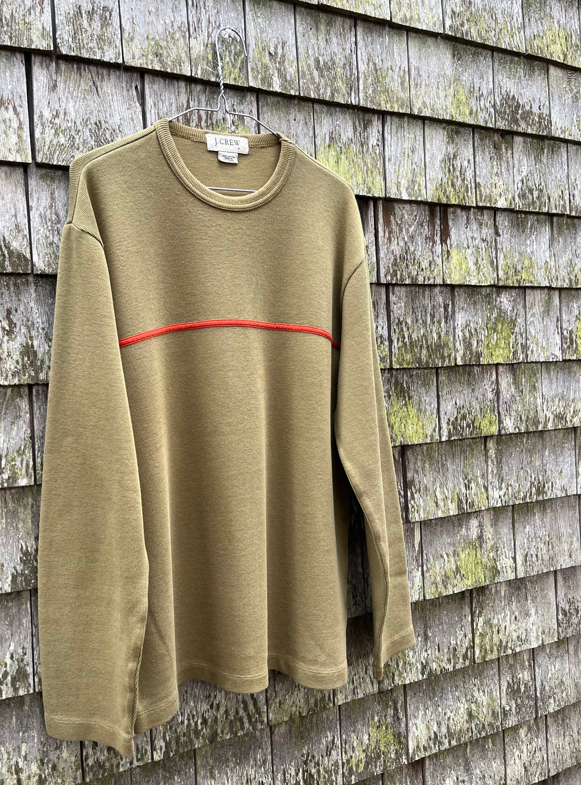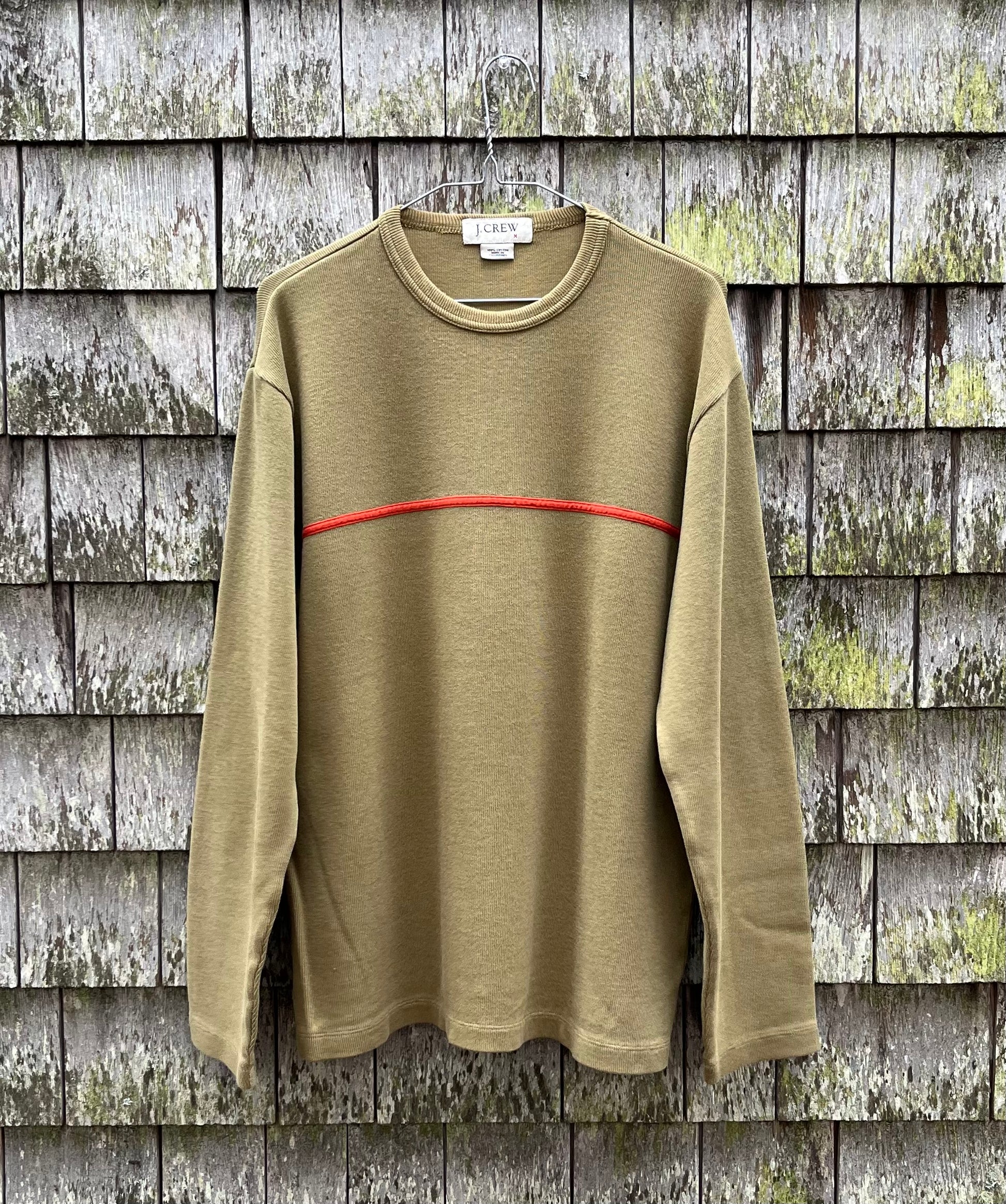 Early 00s J.Crew cotton pullover. Light olive drab green with narrow orange stripe across chest. Mid weight 100% cotton jersey weave.