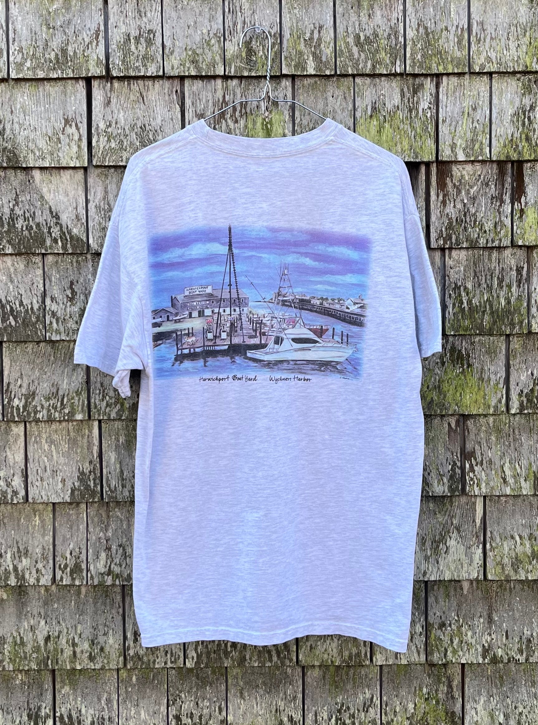 2000s Harwichport Boatyard Wychmere Harbor t-shirt. Light heather gray with multicolor prints on chest and rear. 100% cotton, Hanes Beefy-T blank.