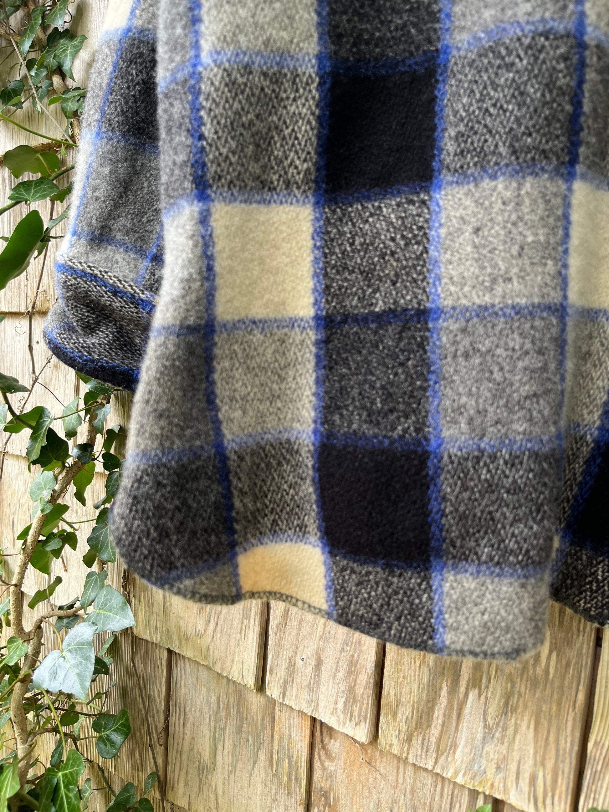 50s/60s Abercrombie & Fitch heavyweight wool shirt jacket. Black, white, blue & gray buffalo check pattern. Double flap/button close chest pockets. Twill lined collar and button placket. Twill gusset side seams. 100% wool.