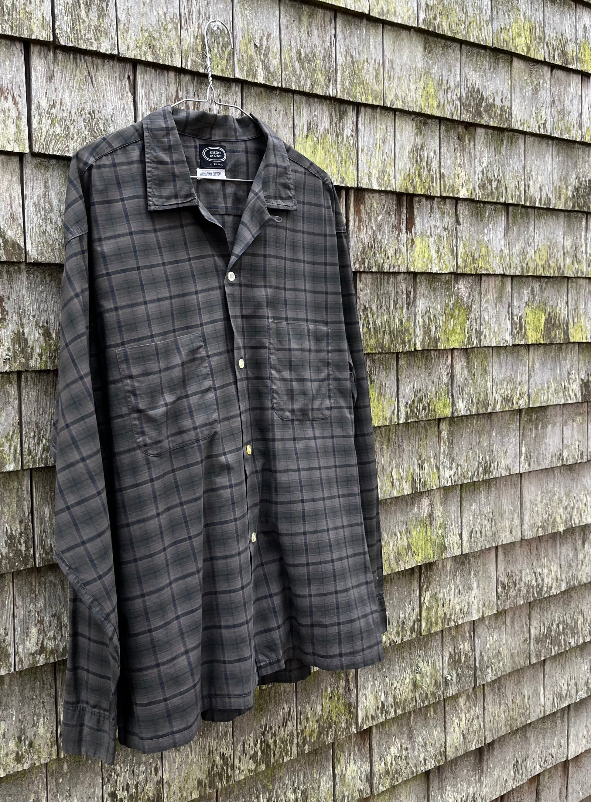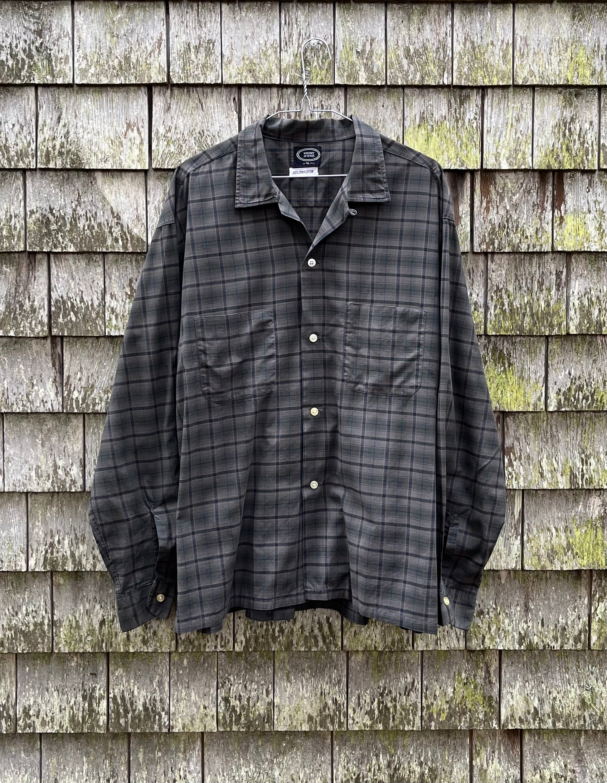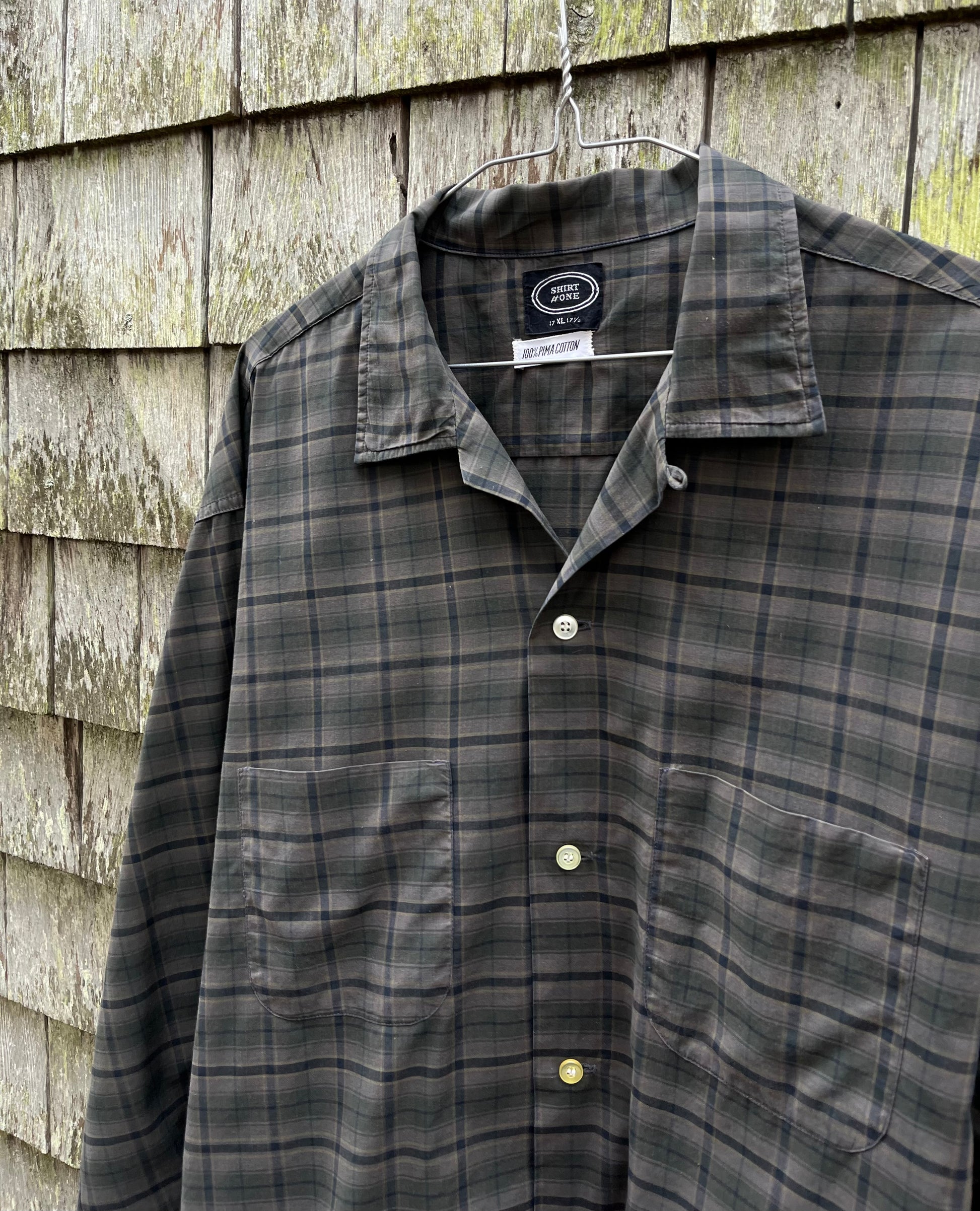 50/60s Shirt #One cotton loop collar shirt. Button front. Point collar. 100% Pima cotton. Ombre plaid pattern in shades of black, gray & brown. Made in the USA.