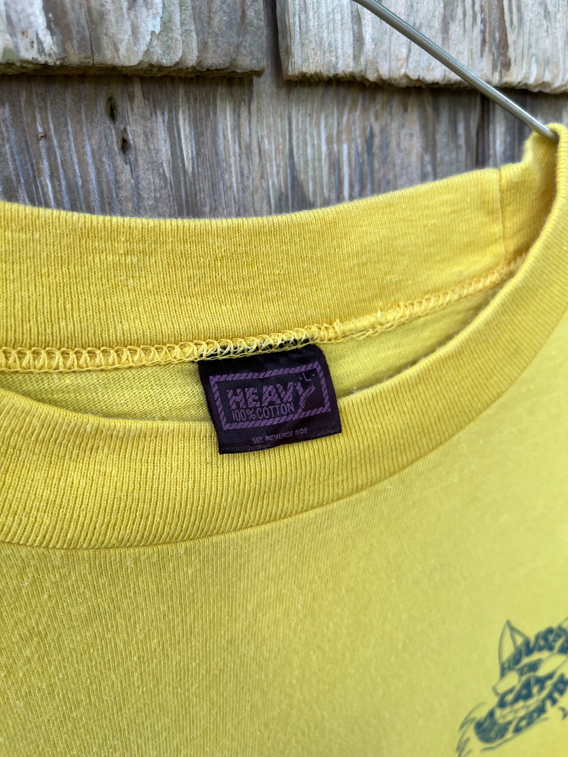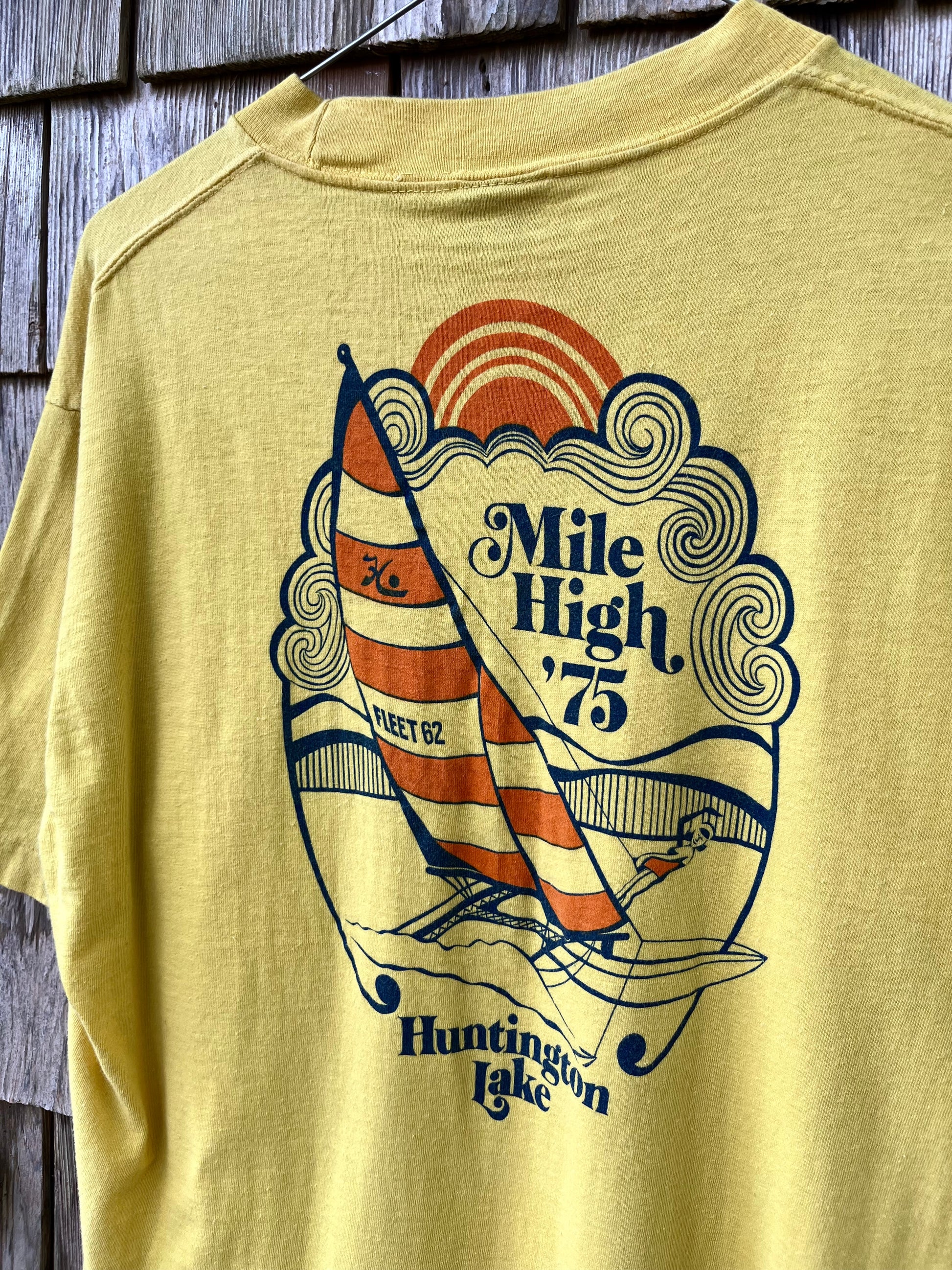 1975 House of the Cat Sailing Center Mile High Regatta t-shirt. Yellow with multicolor print on chest and rear. 100% cotton, made in the USA, Heavy blank.