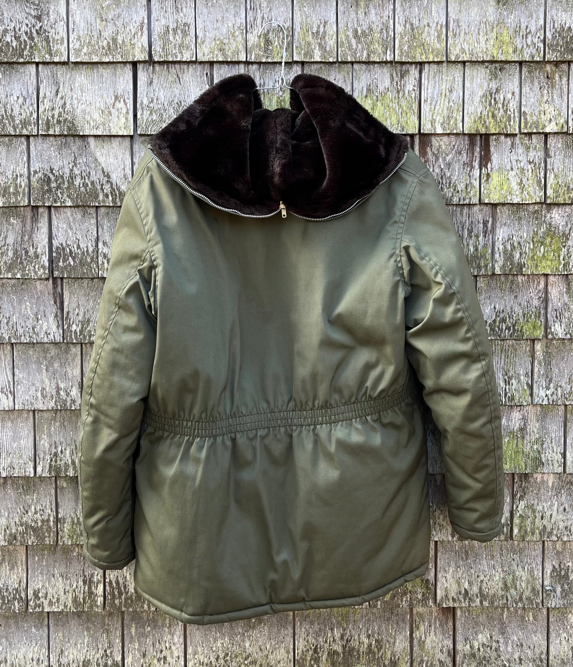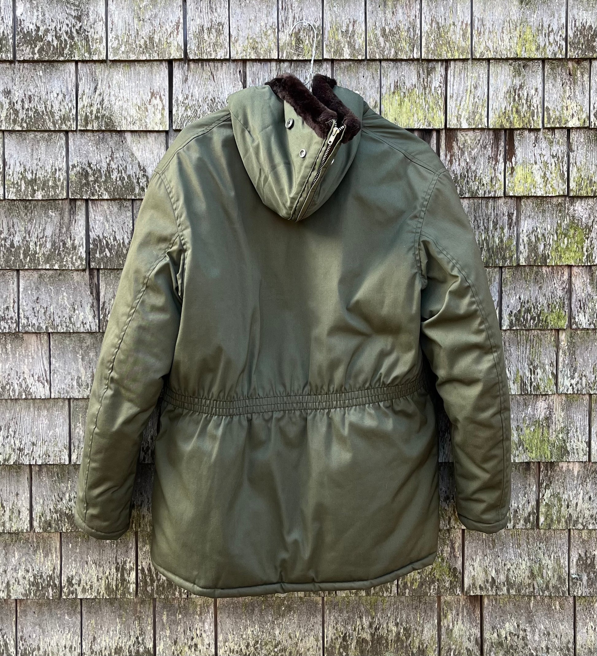 ~70s L.L. Bean Utility Jacket. Insulated. Weather proof poly twill outer. Army, olive drab green. Two way, full zip font with button down placket. Pile lined, split zip hood. Pile lined chin-strap. Gathered internal cuffs. Made in the USA.
