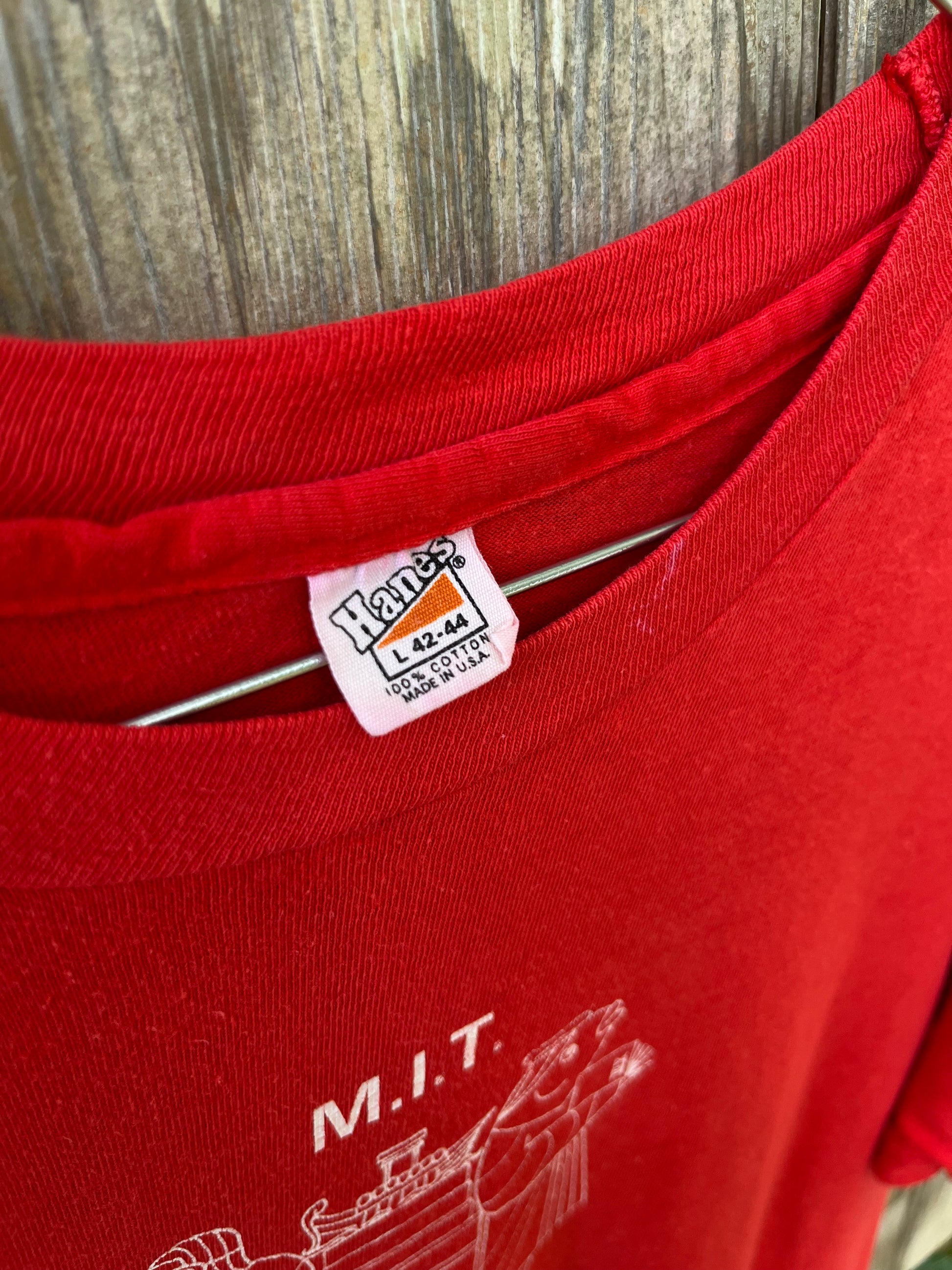 70s Massachusetts Institute of Technology Ocean Engineering program t-shirt. Faded red with white print. 100% cotton, made in the USA, Hanes blank.