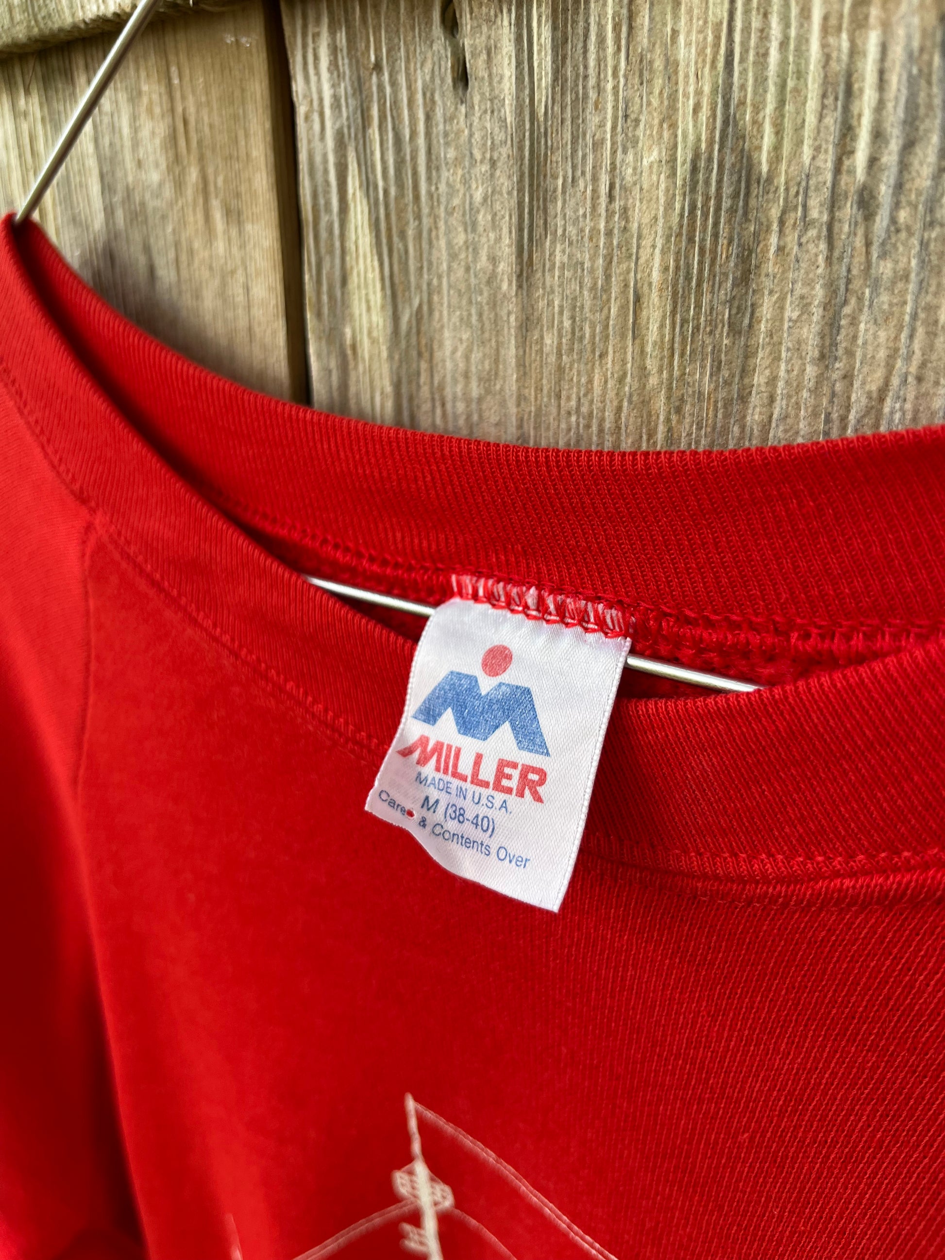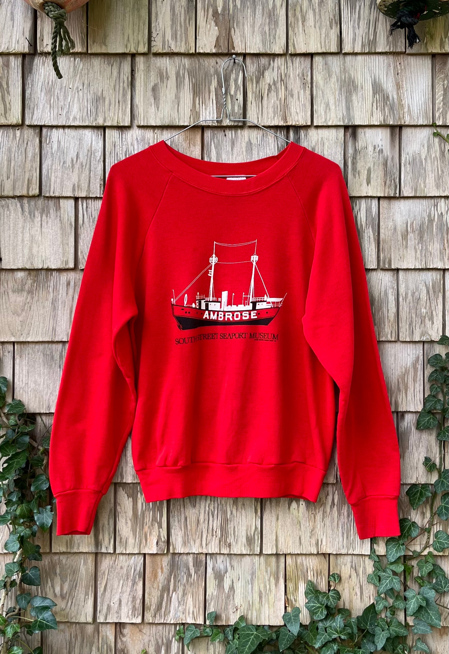 80s Ambrose Lighship South Street Seaport Museum raglan sleeve crewneck sweatshirt. Red with multicolor print on chest. 50/50 cotton blend, made in the USA, Miller blank.