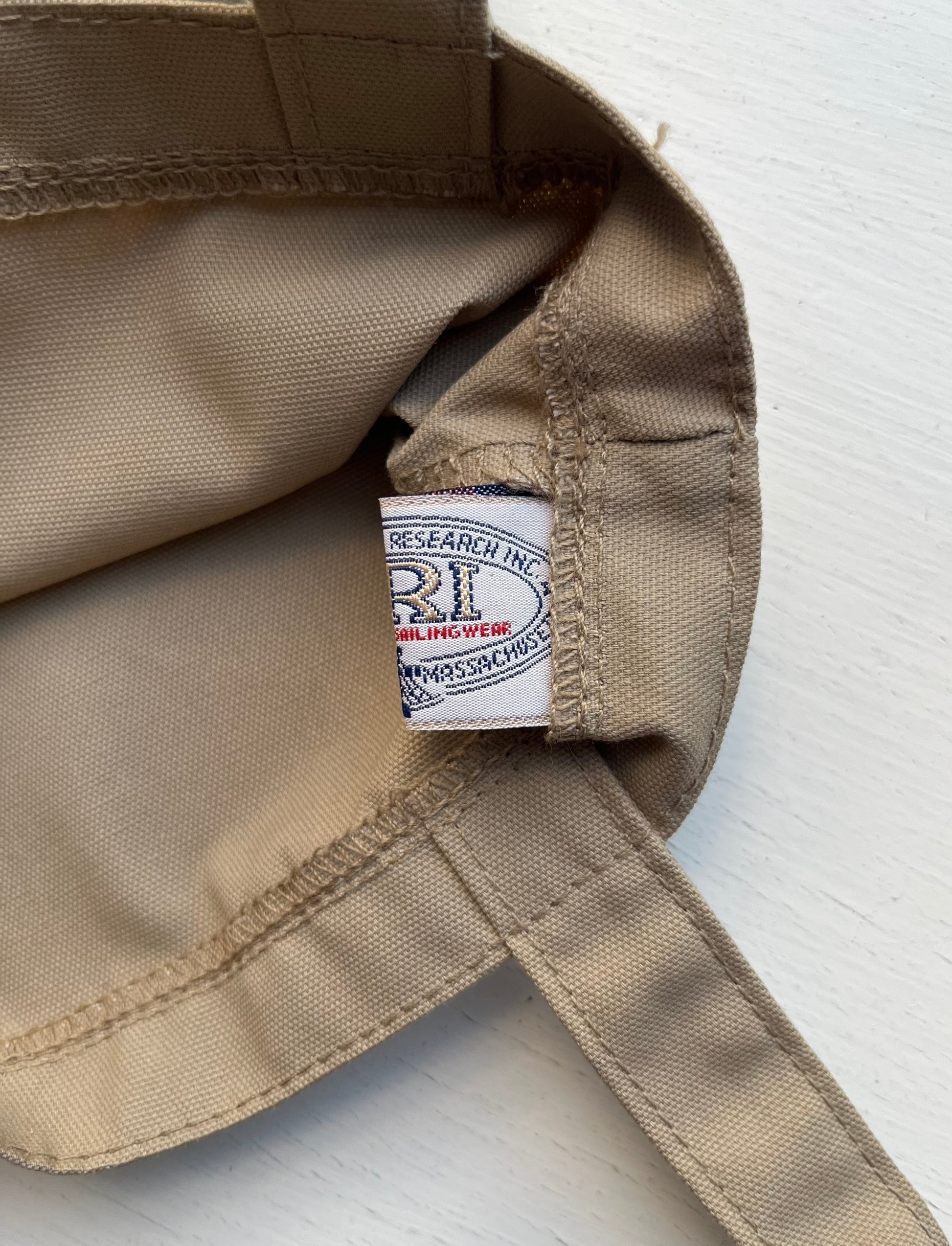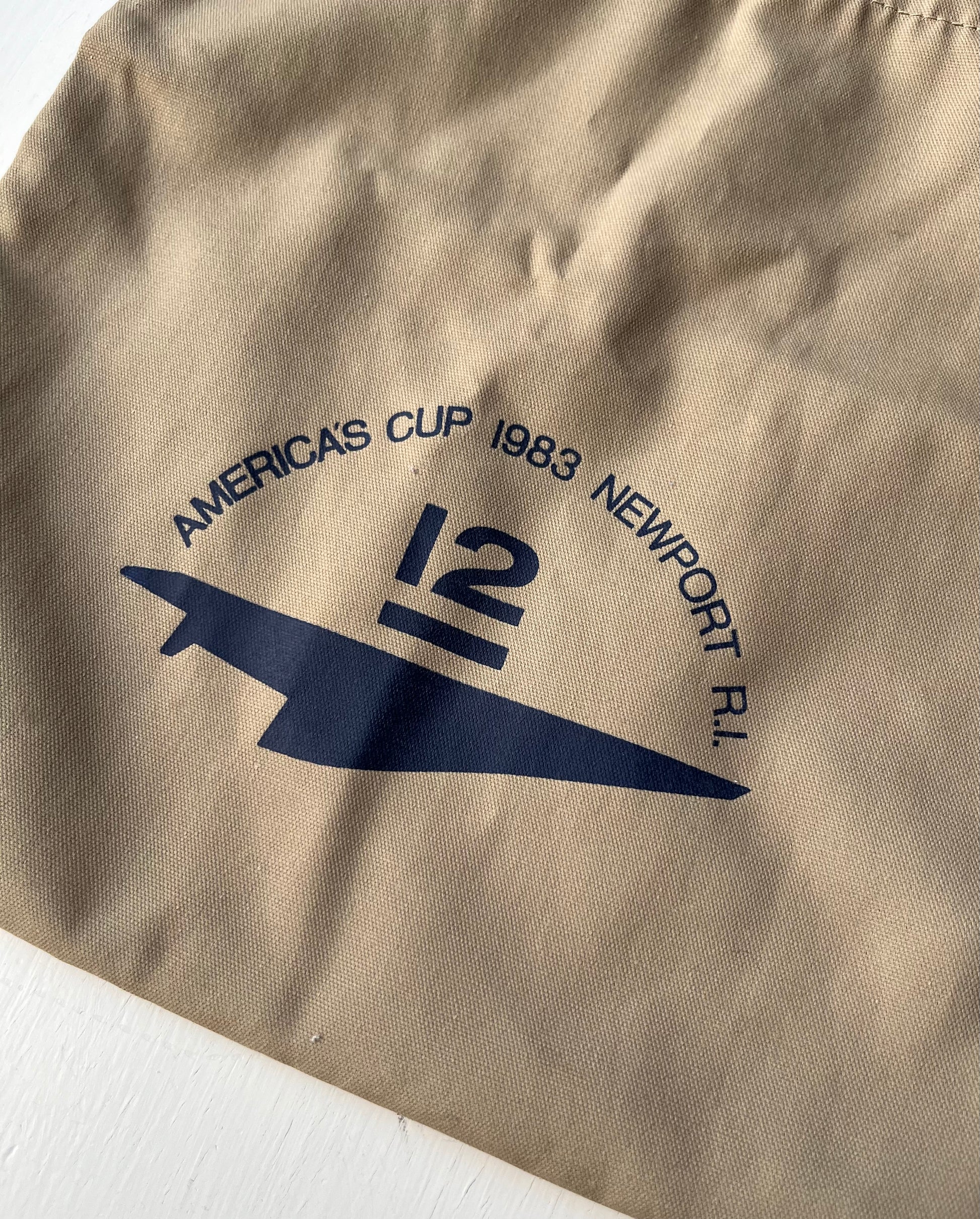 1983 America's Cup Challenge Newport Rhode Island tote bag. Cotton poly twill. Beige with navy blue print. Manufactured in the USA by Yachtwear Research Incorporated.