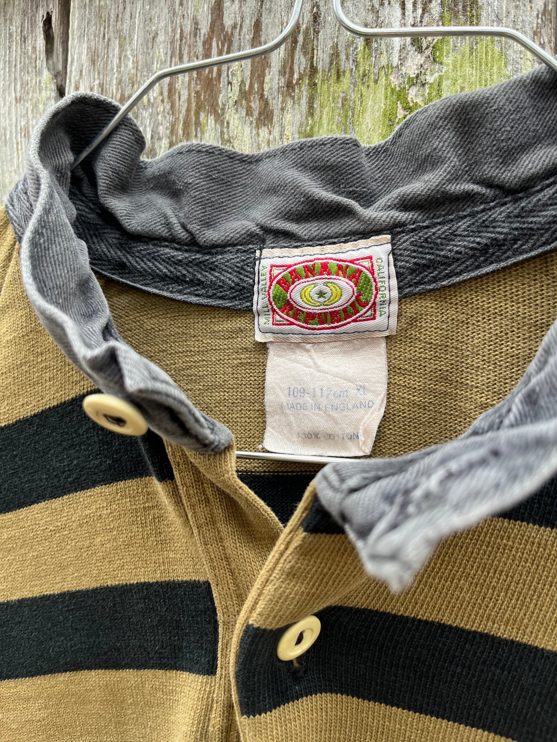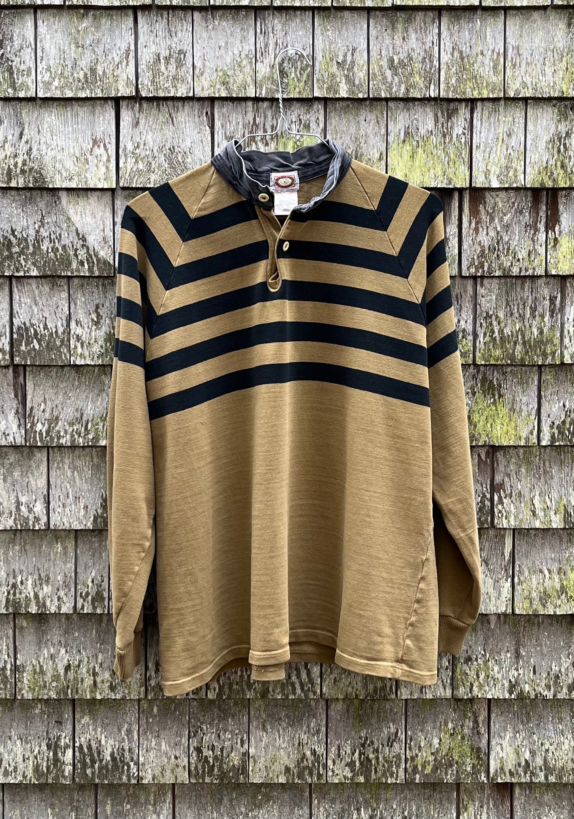 80s Banana Republic '100% Cotton Australian Football Jersey'. Stand up collar. Dark British khaki with faded black stripes on chest/shoulders. Stand up collar, two button placket. 100% cotton. Made in England.