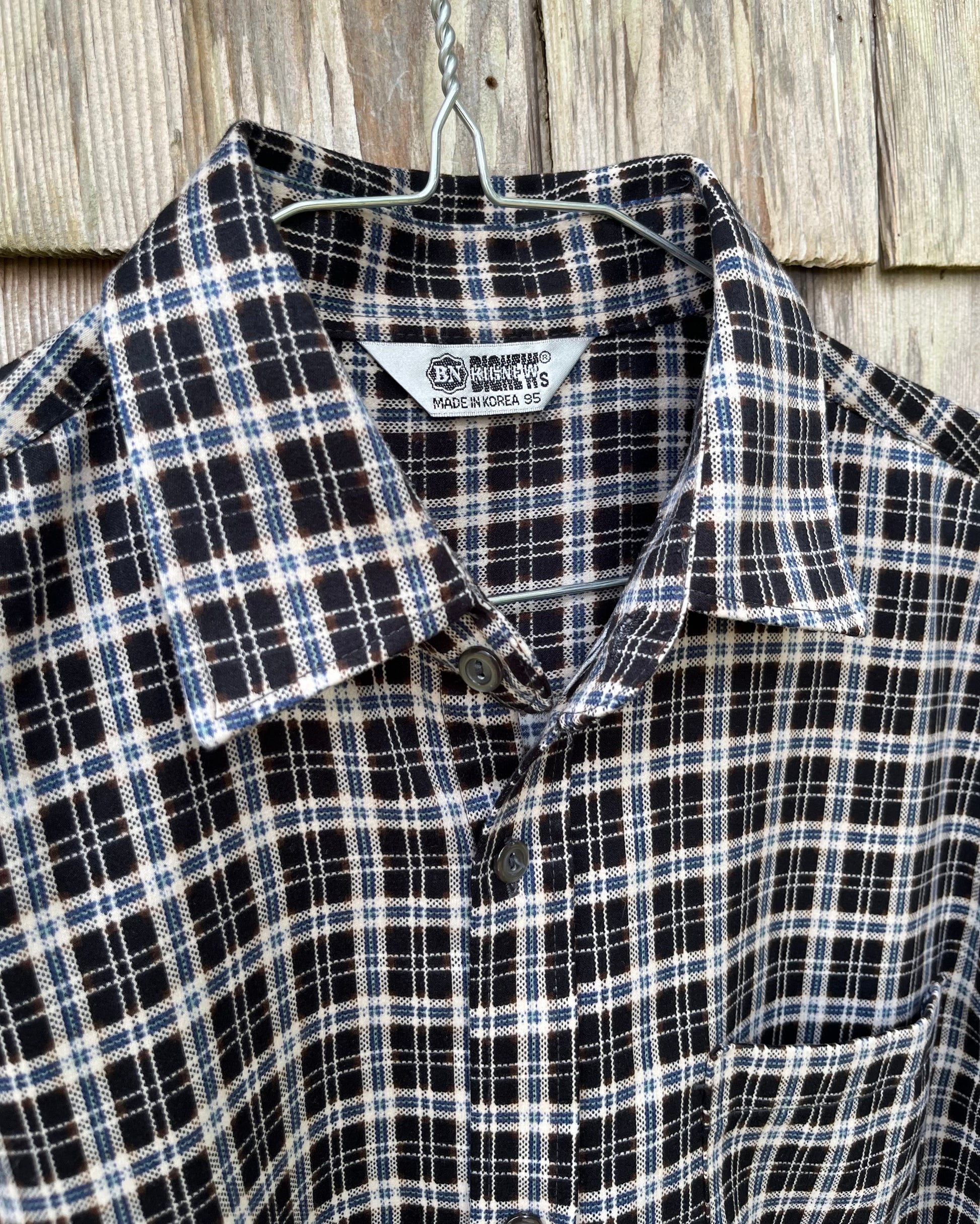 ~80s Big News cotton print flannel shirt. Unique plaid in shades of black, brown, blue & turquoise. Soft, brushed all cotton flannel.