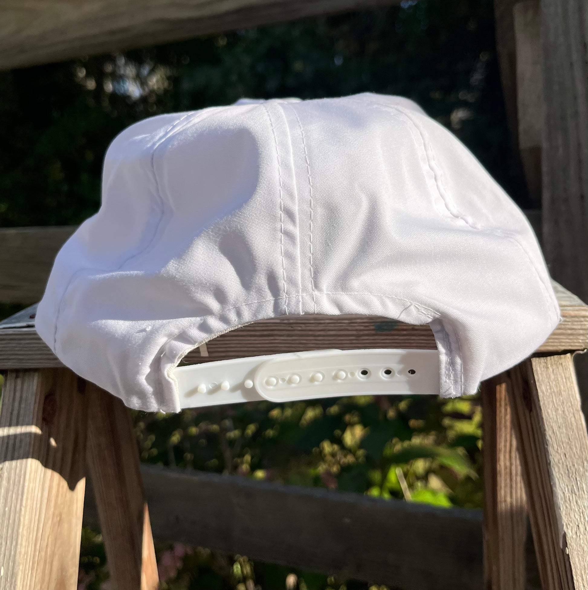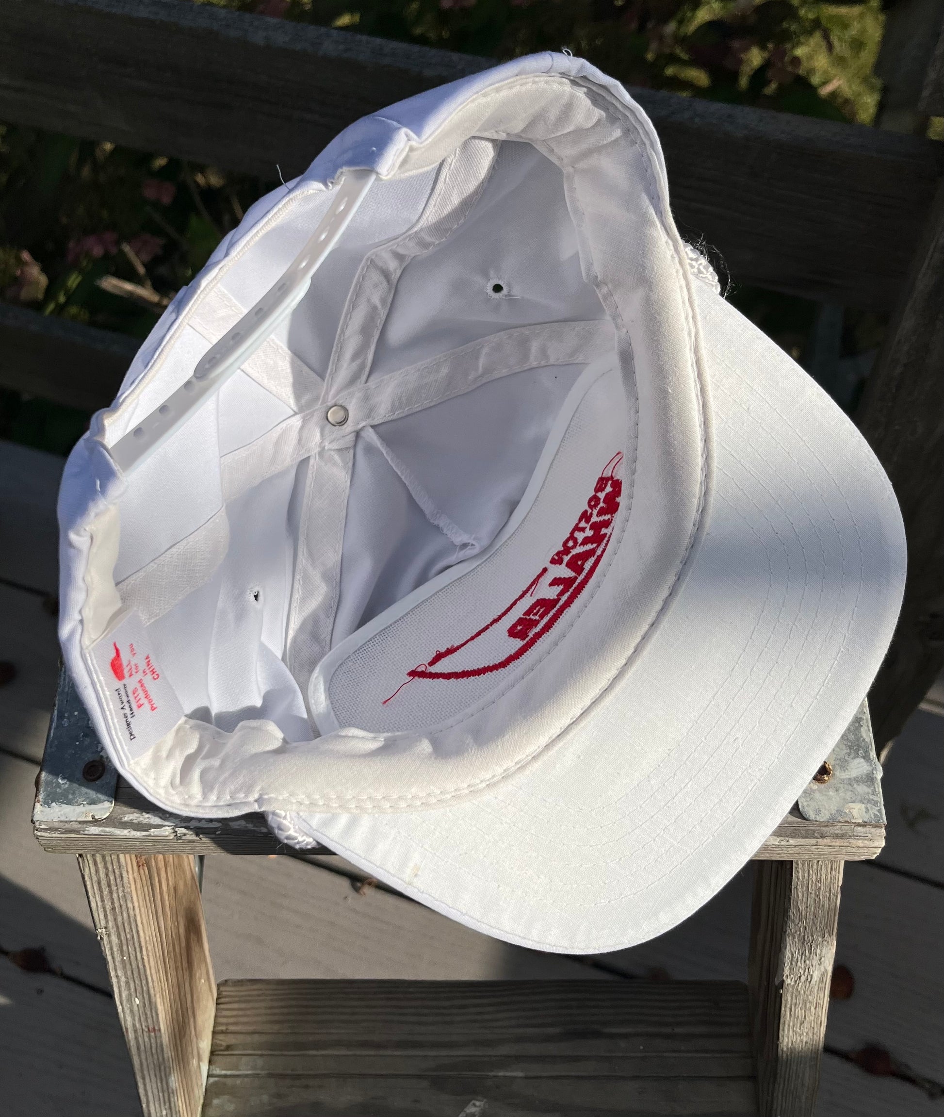 ~80s Boston Whaler snapback cap. Rope brim. White with classic red Boston Whaler logo embroidered on crown. Made by Designer Awards Headwear.