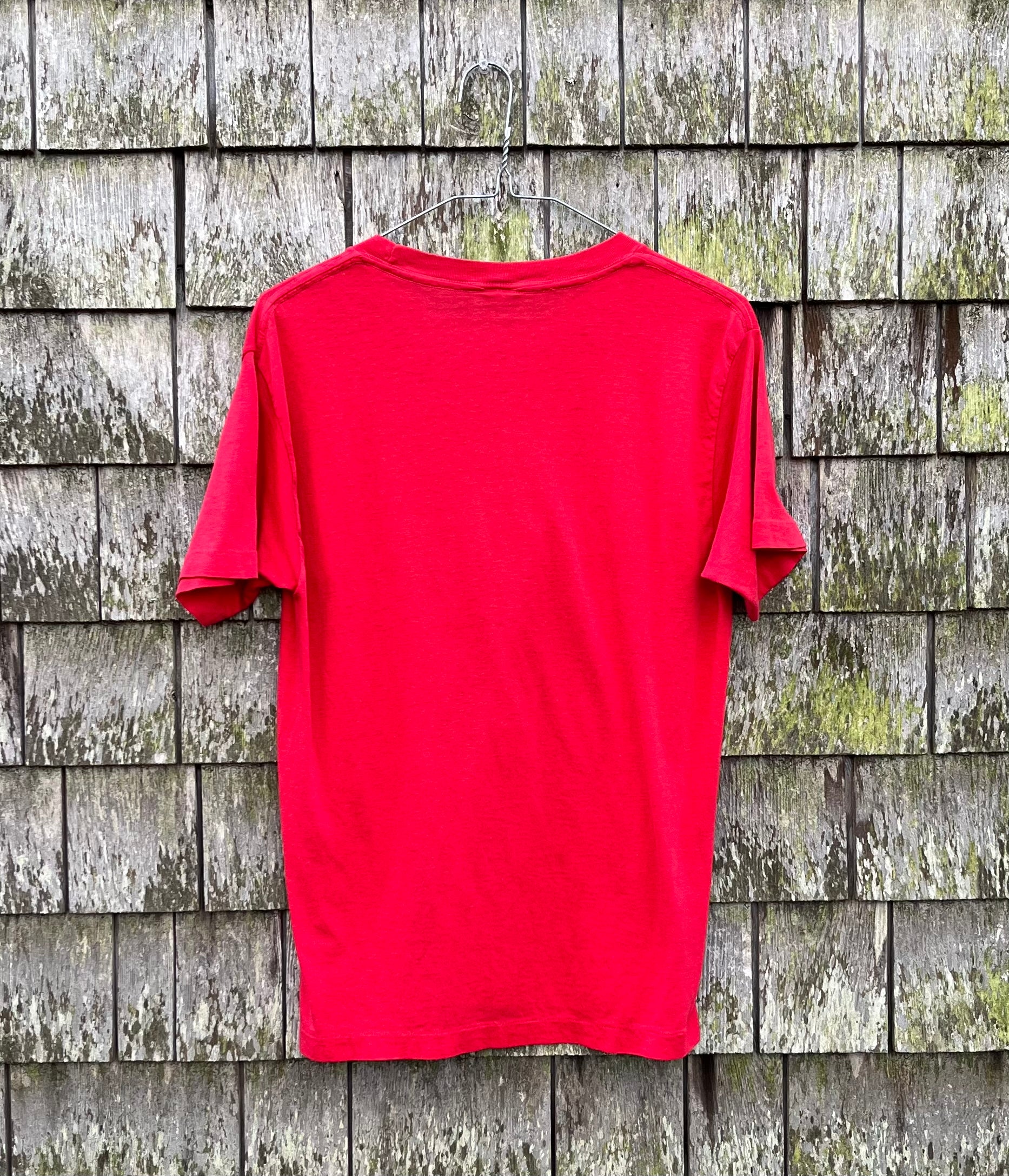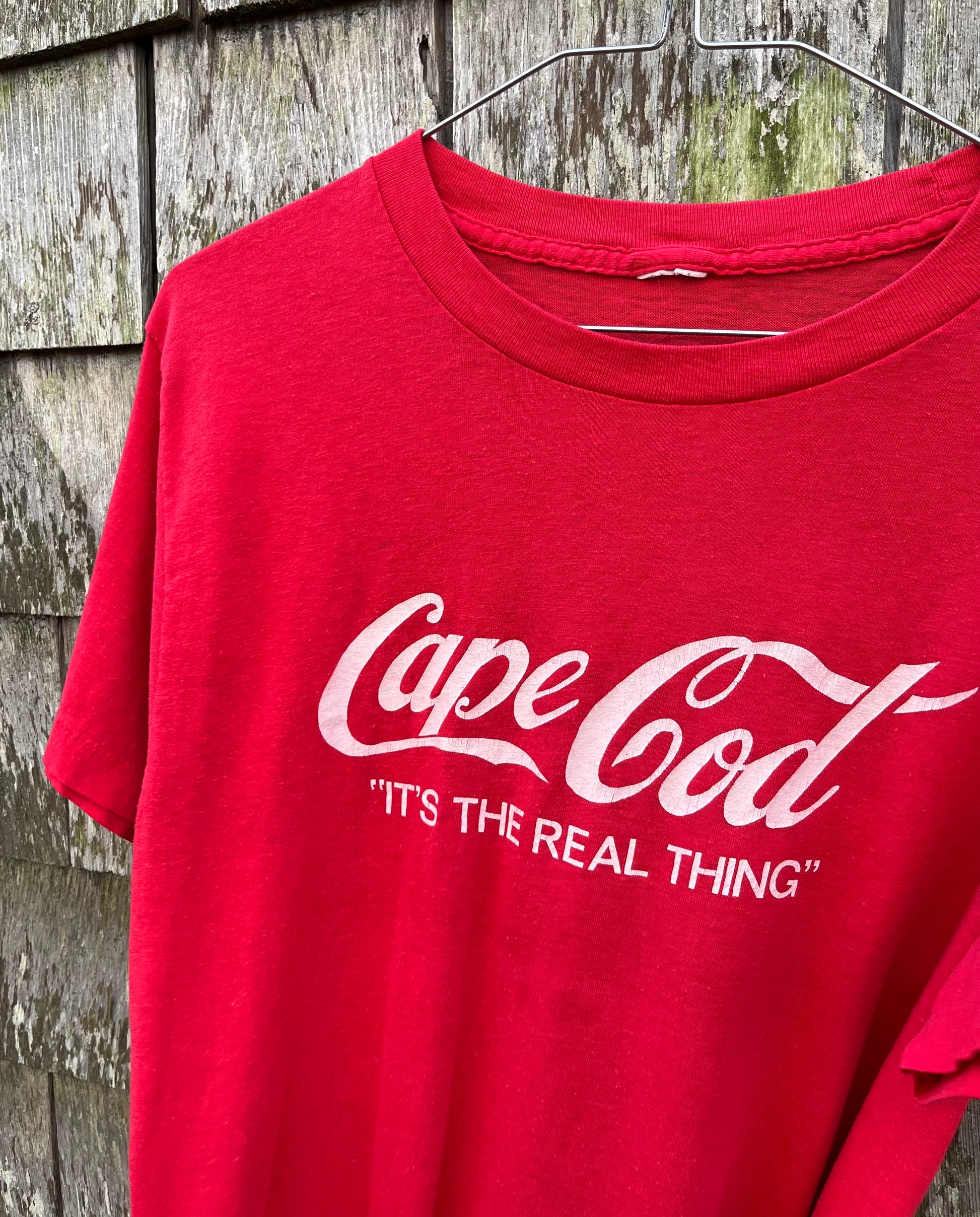 1980s Cape Cod 'It's the Real Thing' Coca Cola parody t-shirt. Red with white print on chest. Missing tag, thin/lightweight cotton poly blend blank.