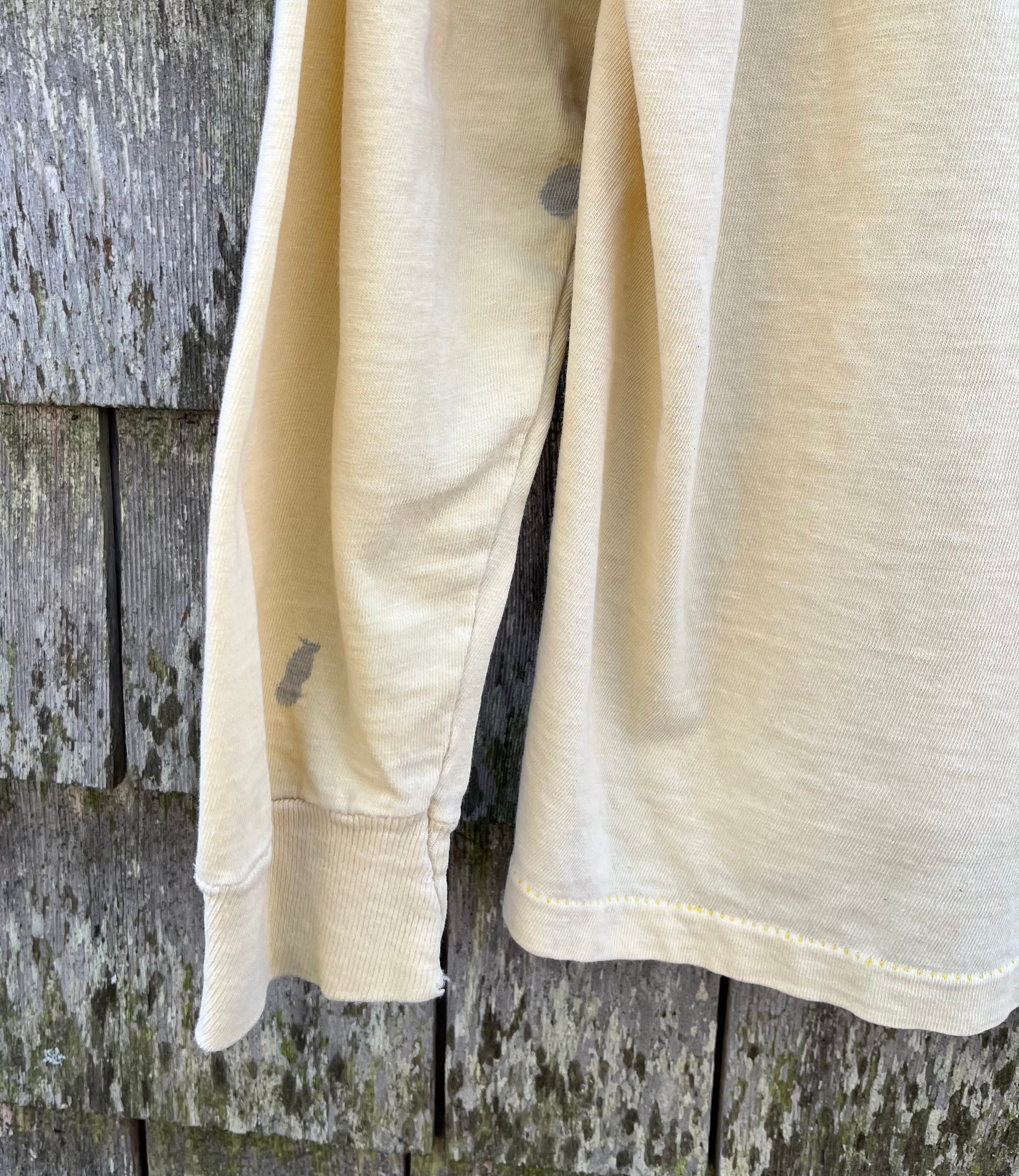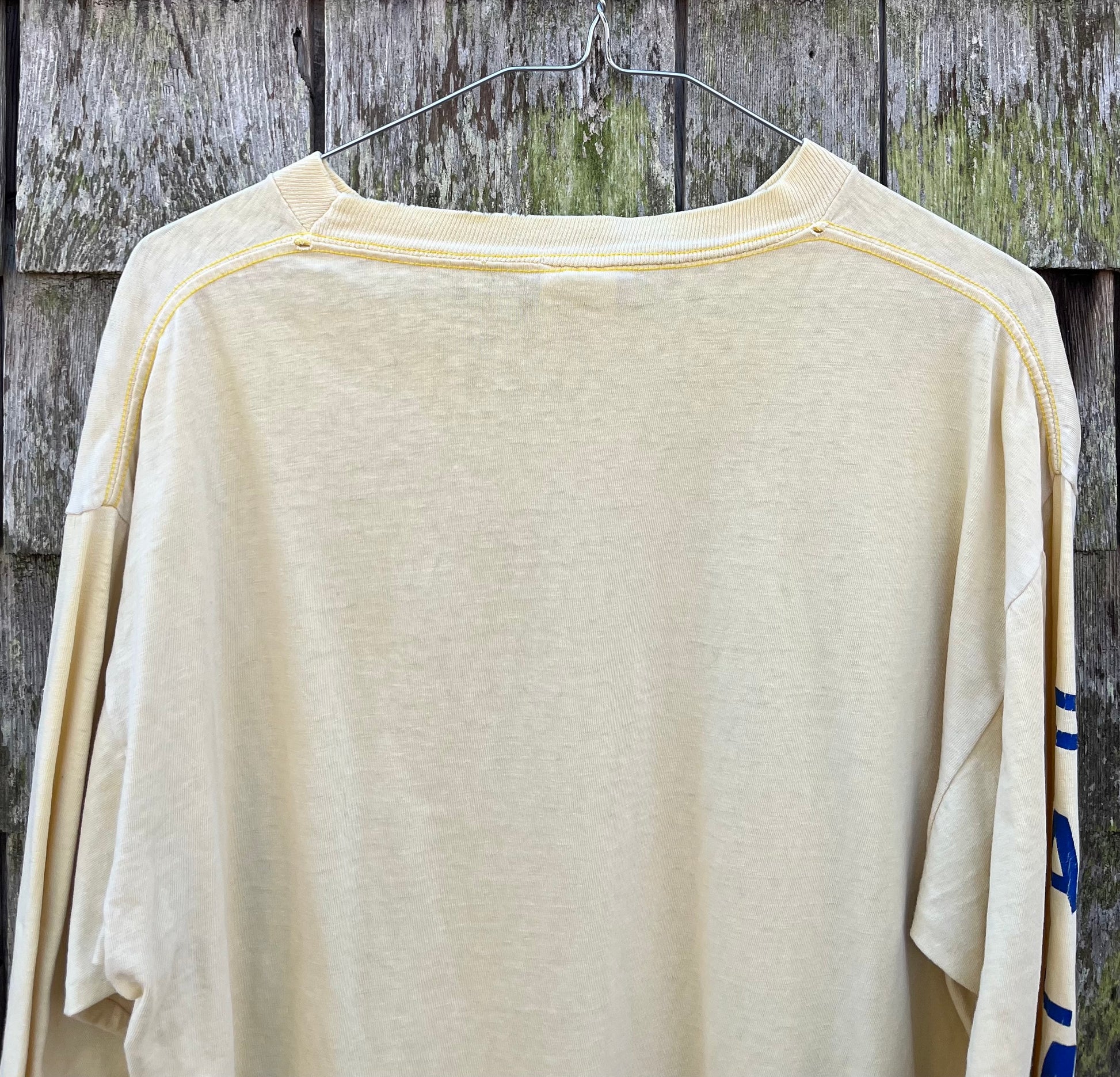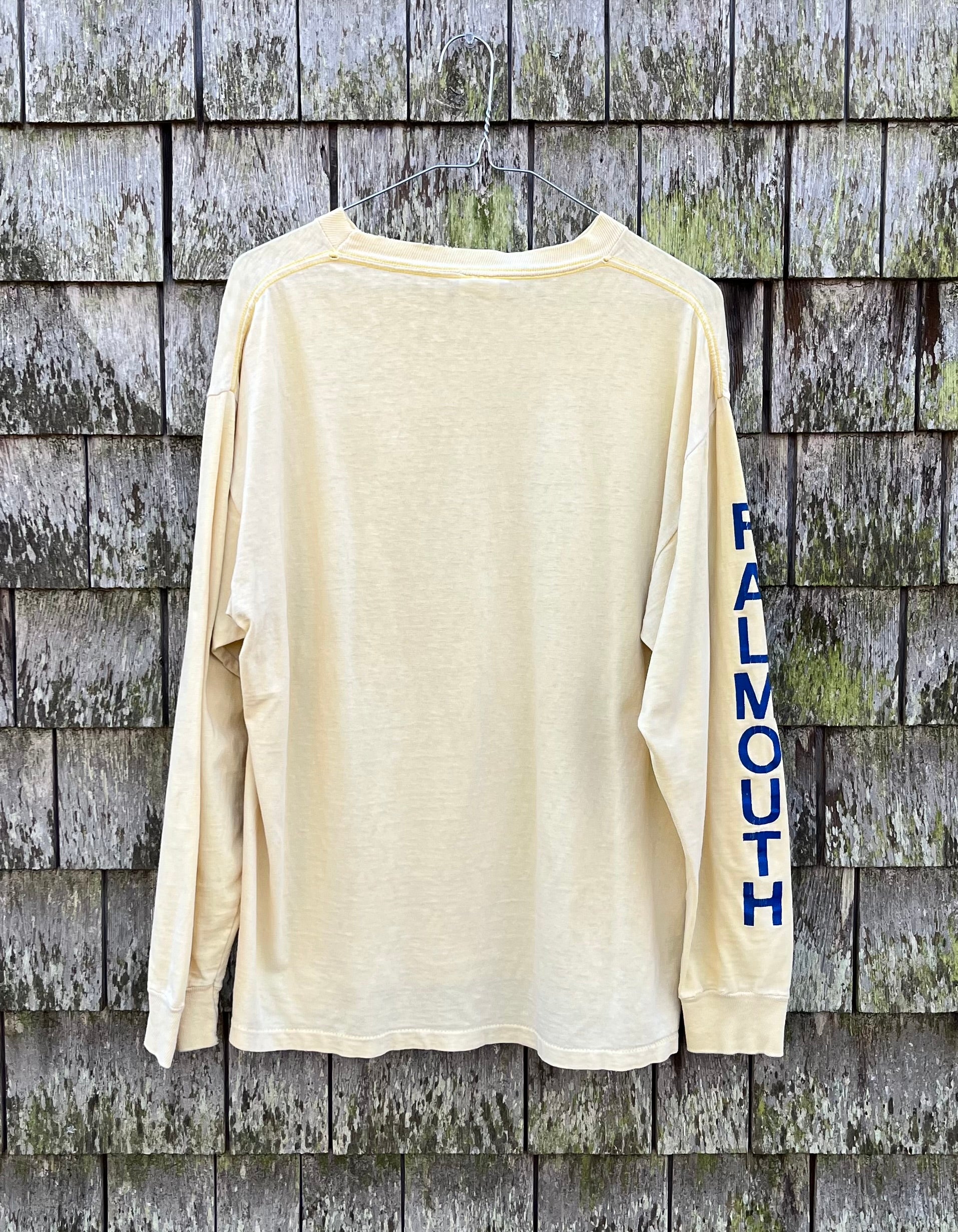 1986 Cape Cod Marathon Falmouth Track Club long sleeve t-shirt. Pale yellow with blue prints on chest and sleeve. 100% cotton, made in the USA, Miller blank.
