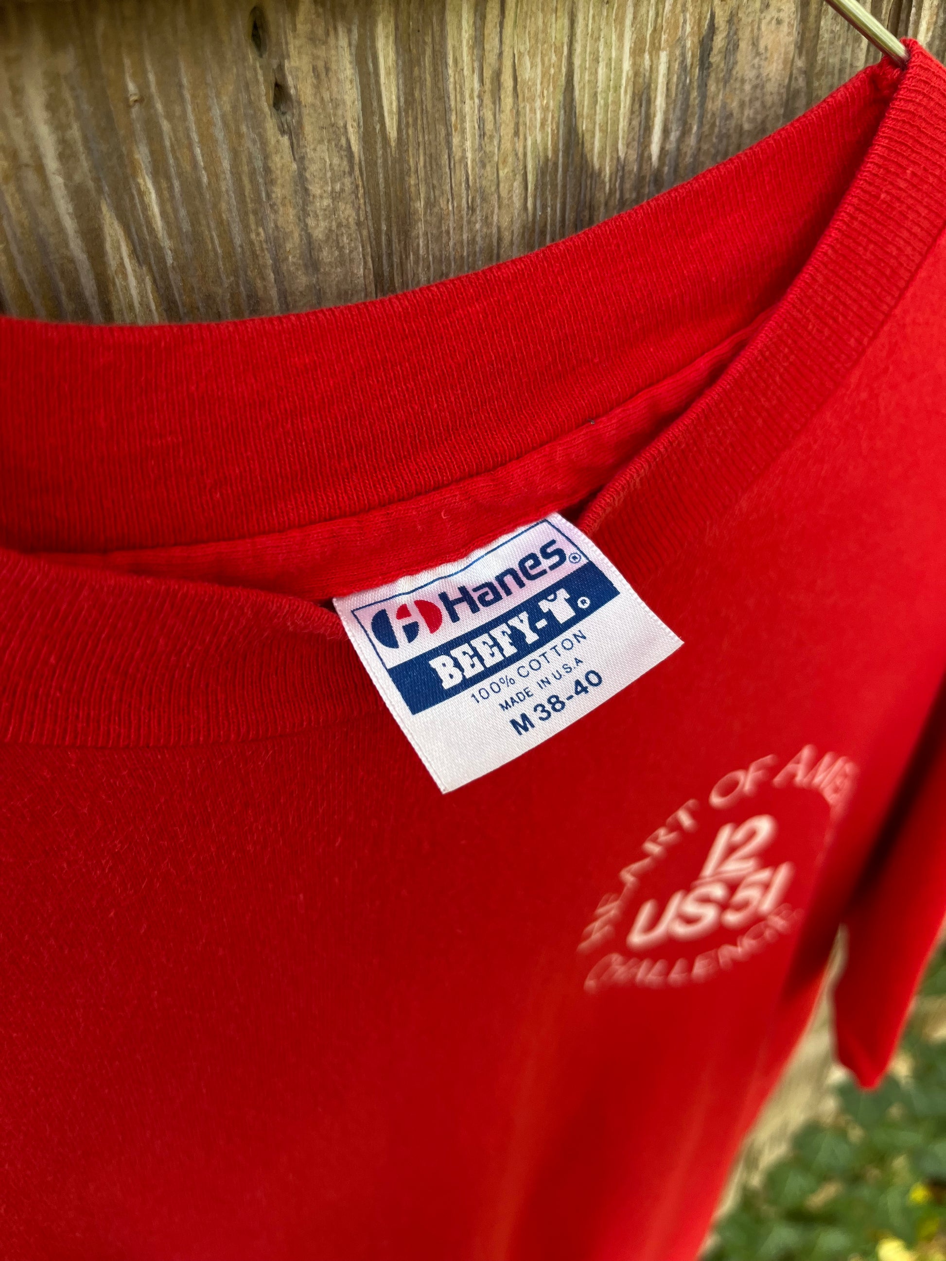 80s Heart of America, America's Cup Challenge, t-shirt. Red with white prints on chest and rear. 100% cotton, made in the USA, Hanes Beefy-T blank.