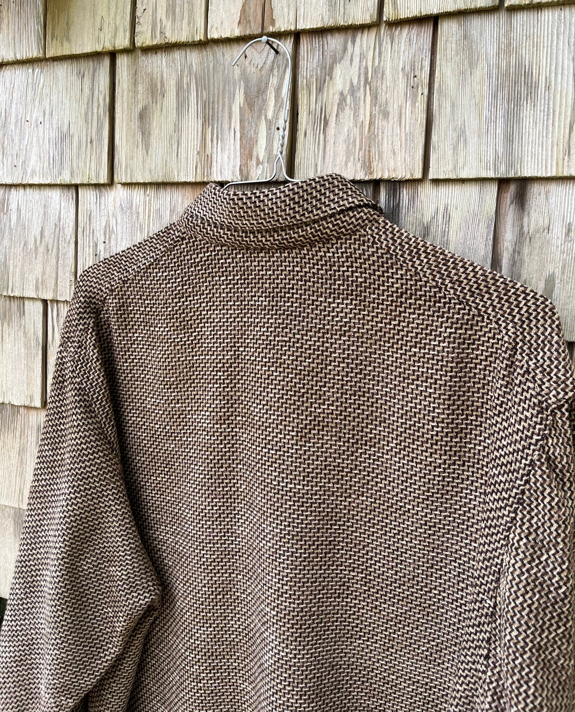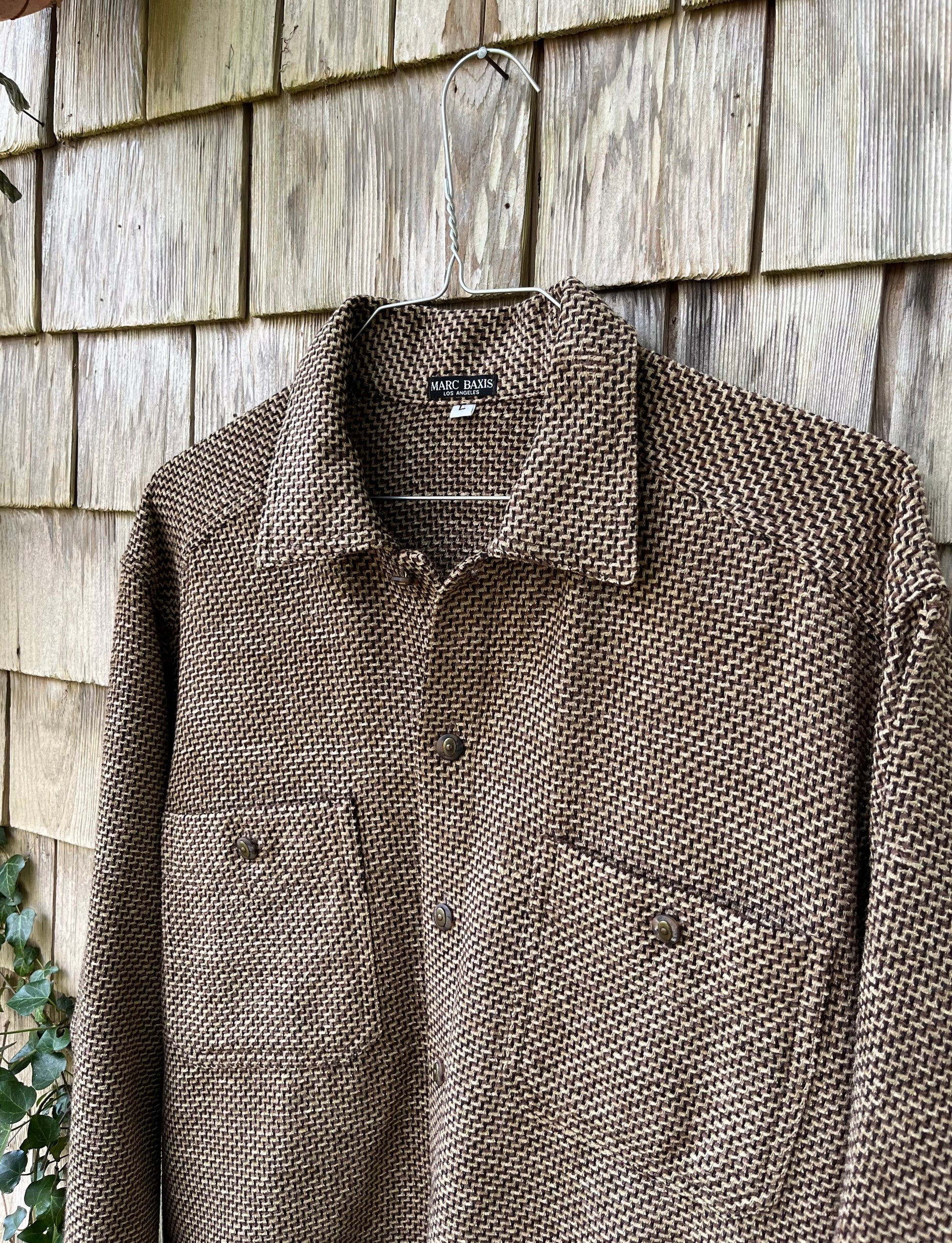 80s Marc Baxis Los Angeles heavyweight wool blend button front shirt. Soft feel, 60/40 wool acrylic blend. Herringbone pattern weave in shades of black, brown & tan. Good overshirt/light shirt jacket weight. Made in the USA.
