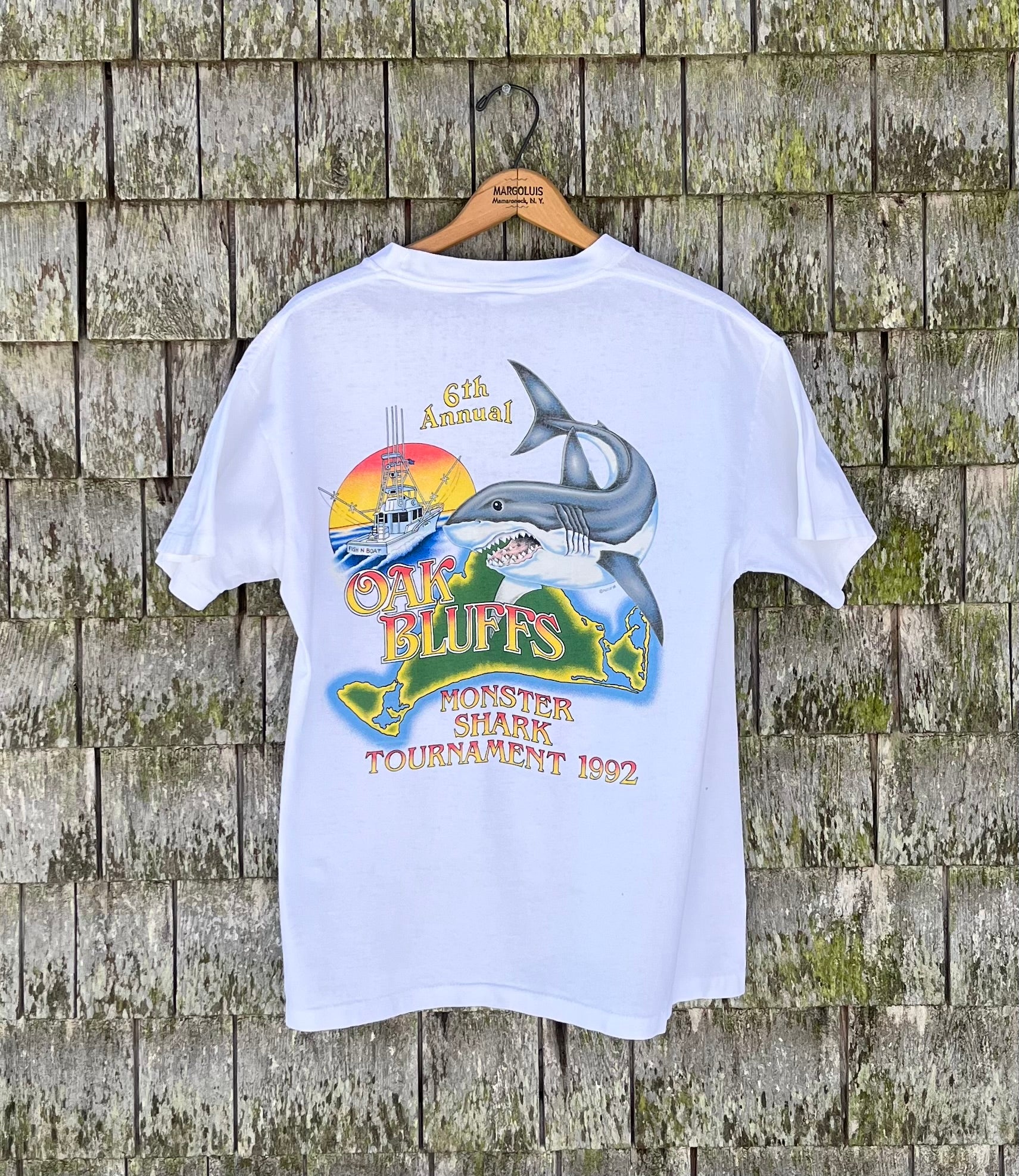 1992, 6th Annual, Oak Bluffs Monster Shark Fishing Contest pocket t-shirt. Prints on chest pocket and rear.