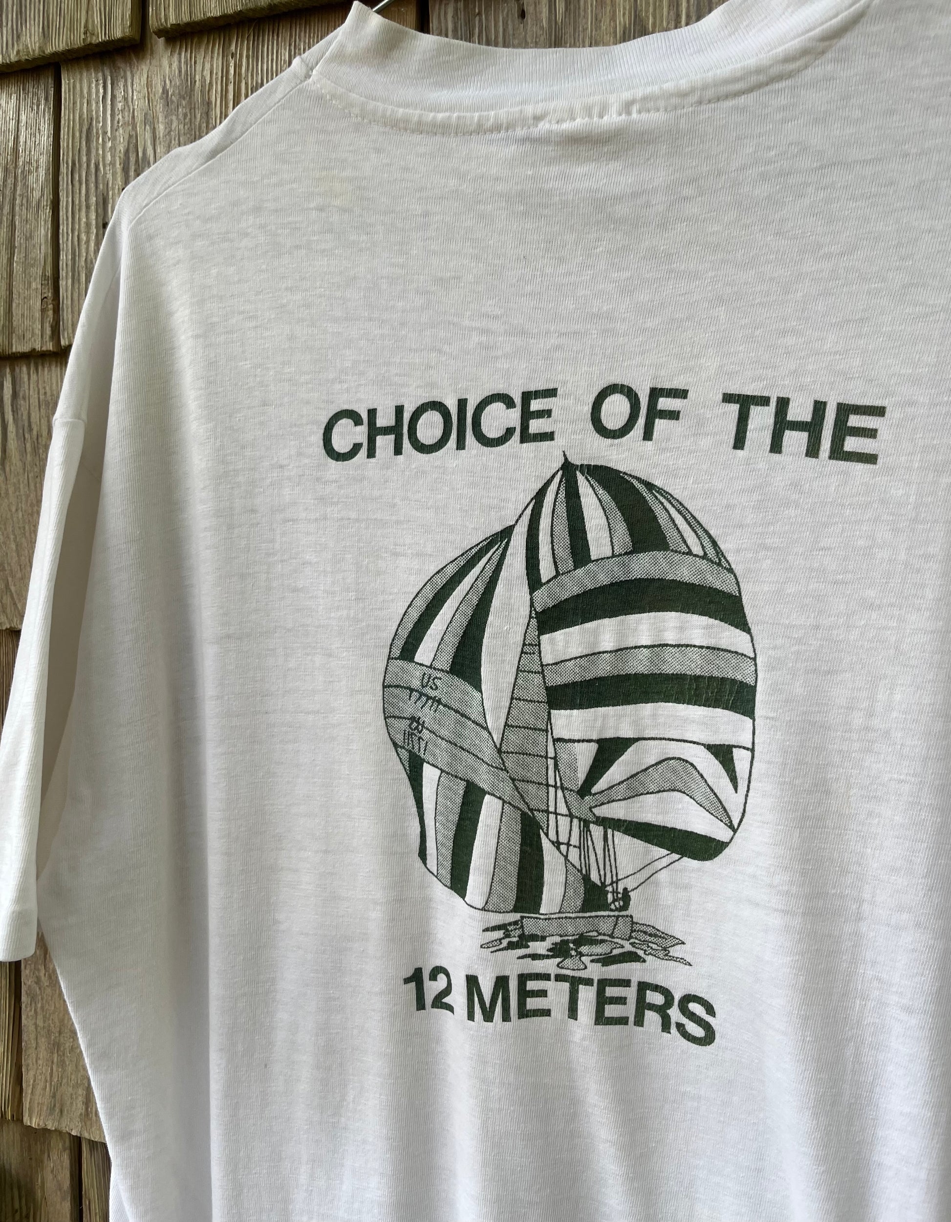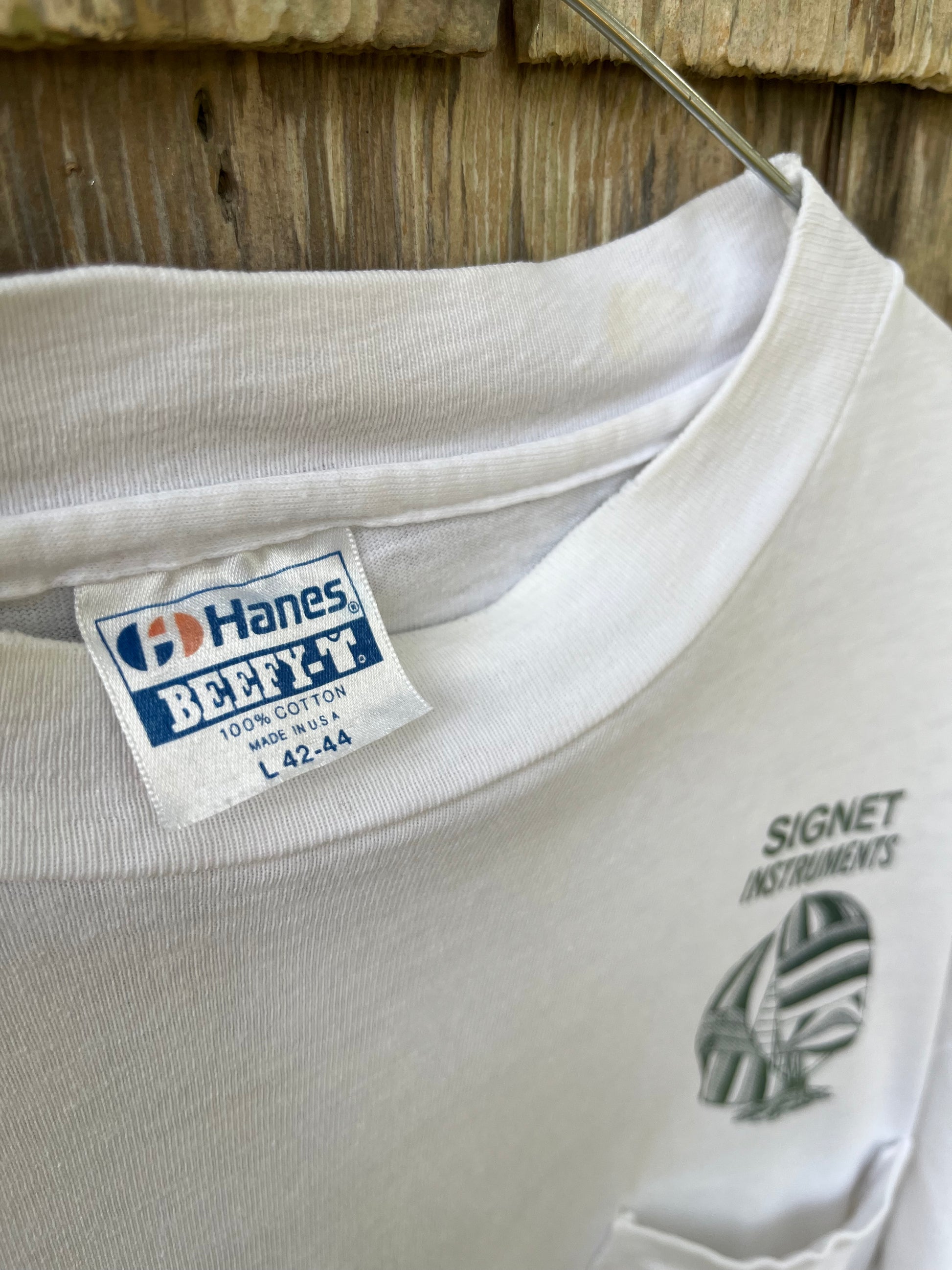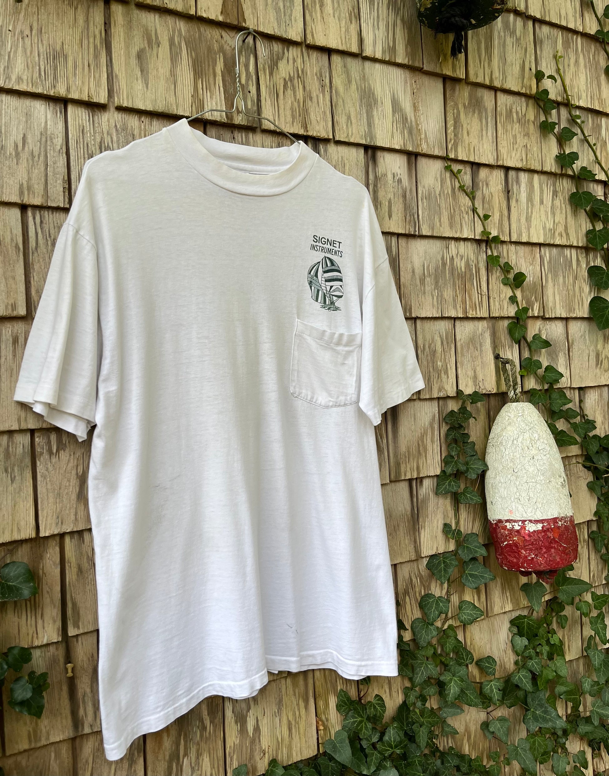 ~80s Signet Instruments 'Choice of the 12 Metres' pocket t-shirt. White with dark green prints on chest and rear. 100% cotton, made in the USA, Hanes Beefy-T blank.