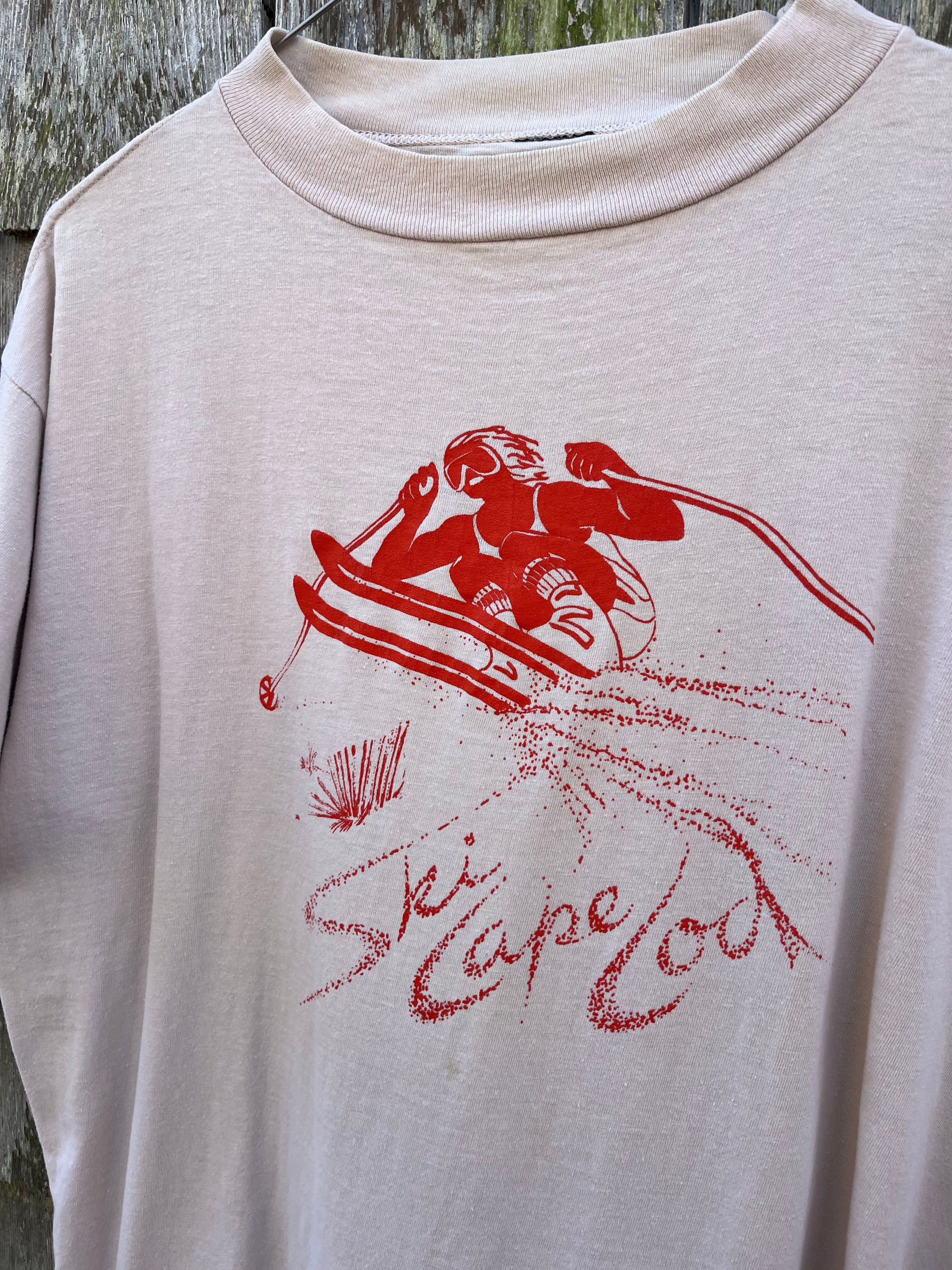 1980s Ski Cape Cod t-shirt. Beige with dark orange print on chest. 100% cotton blank.