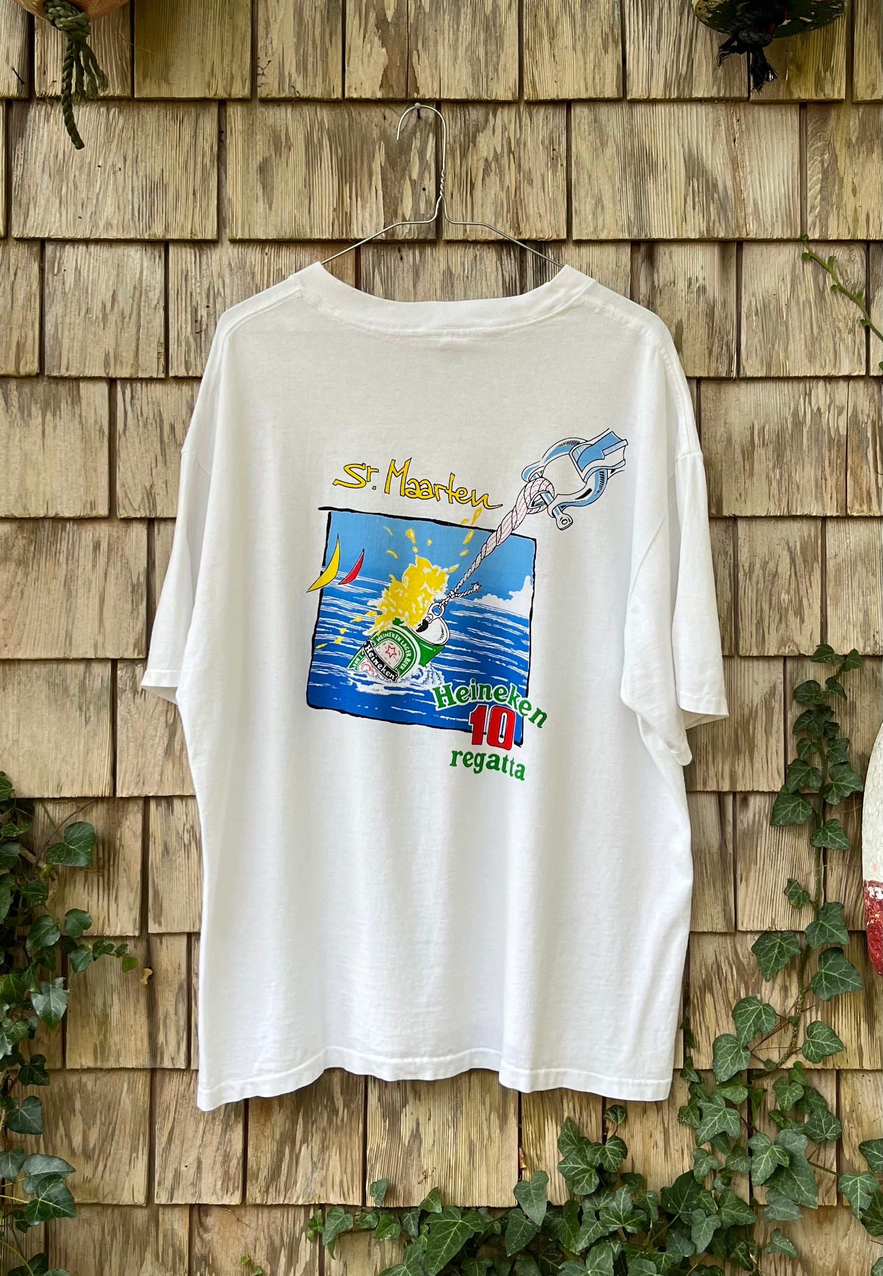 80s St. Maarten Heineken 10 regatta t-shirt. White with multicolor prints on chest and rear. 100% cotton, made in the USA, Lexington Super Cru blank.