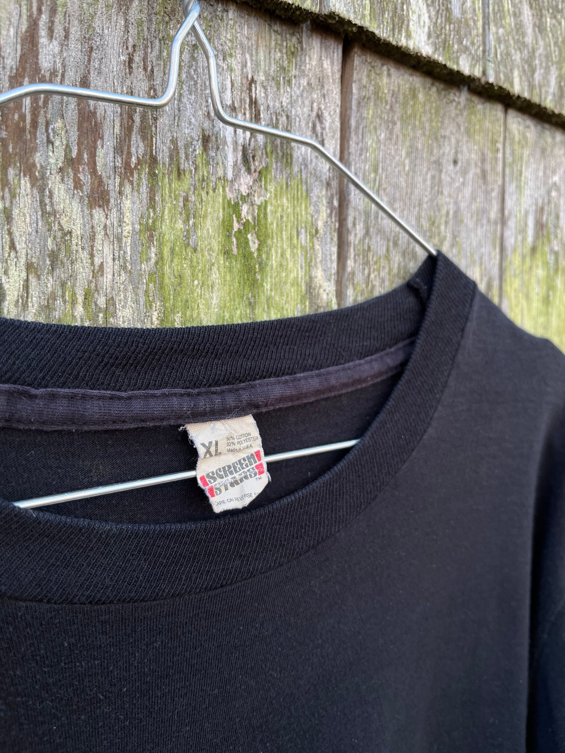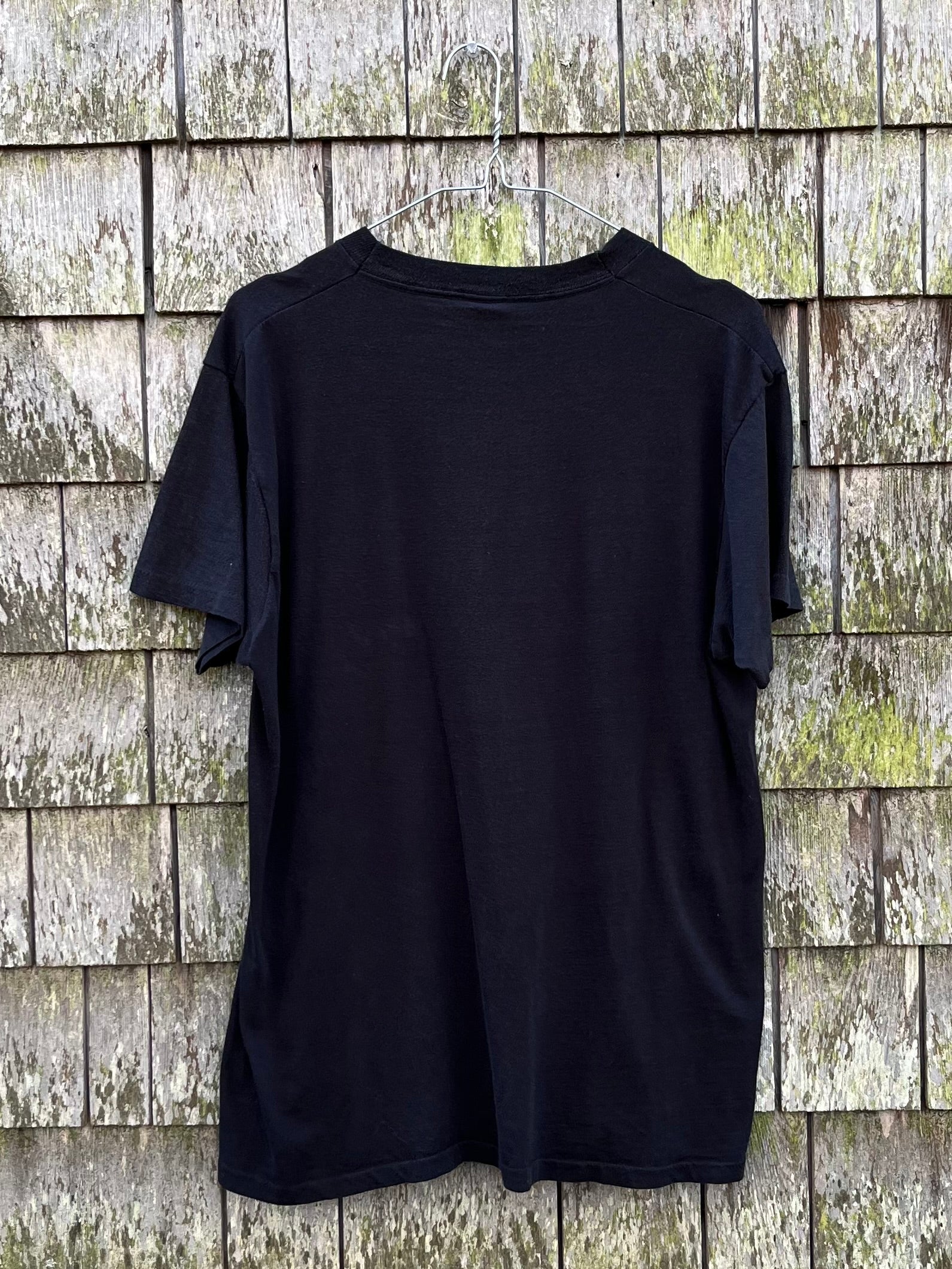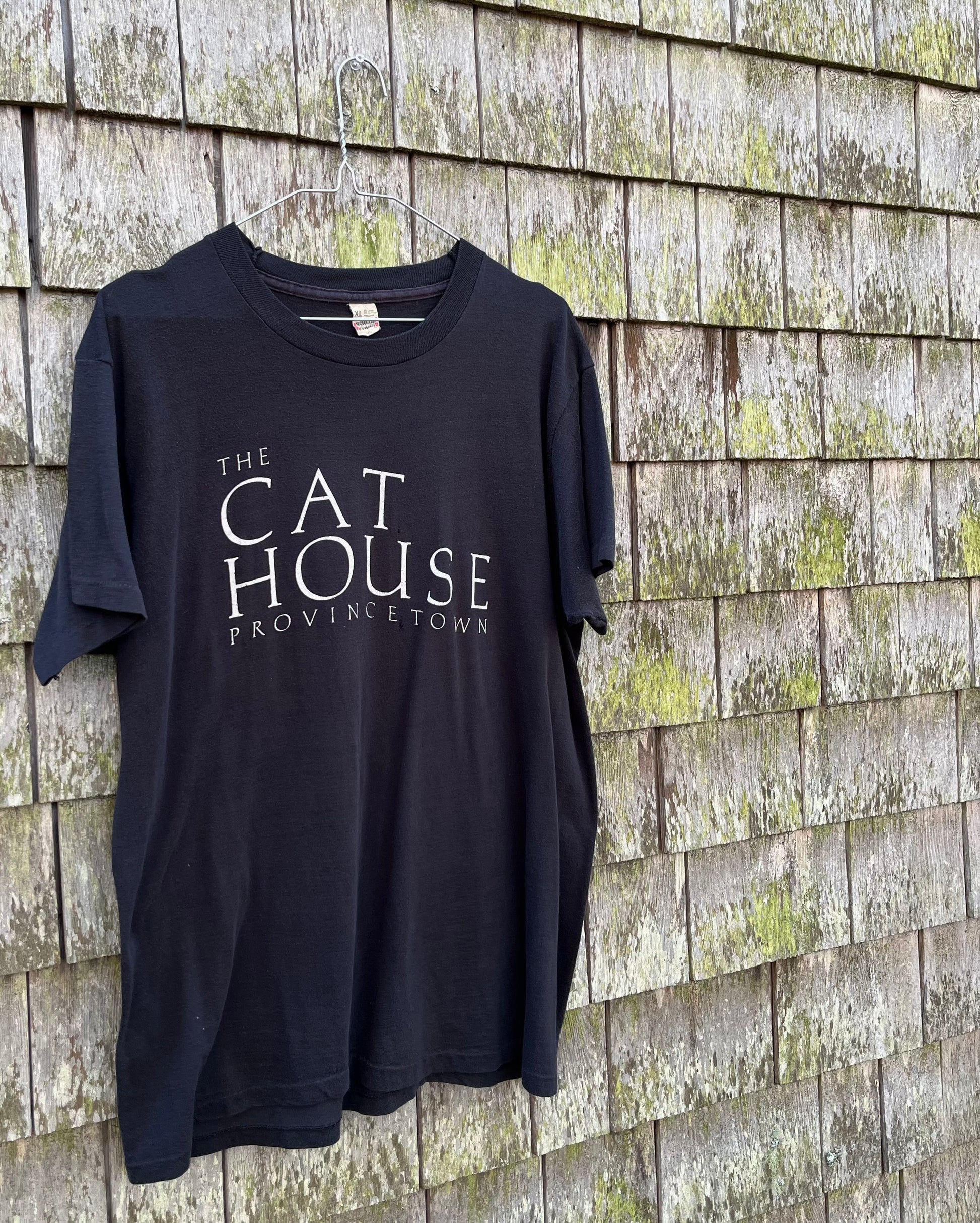 80s The Cat House Provincetown t-shirt. Black with white print on chest. Lightweight, thin, 50/50 cotton poly blend. Made in the USA, Screen Stars blank.