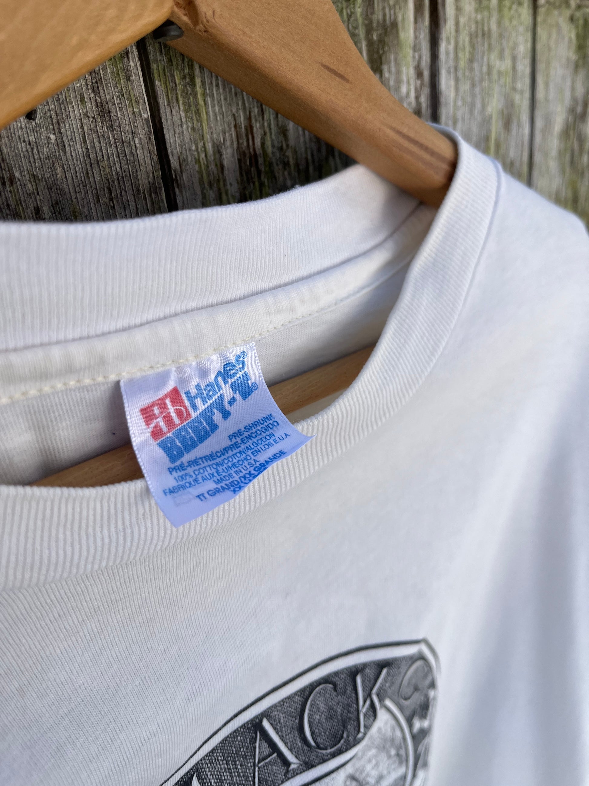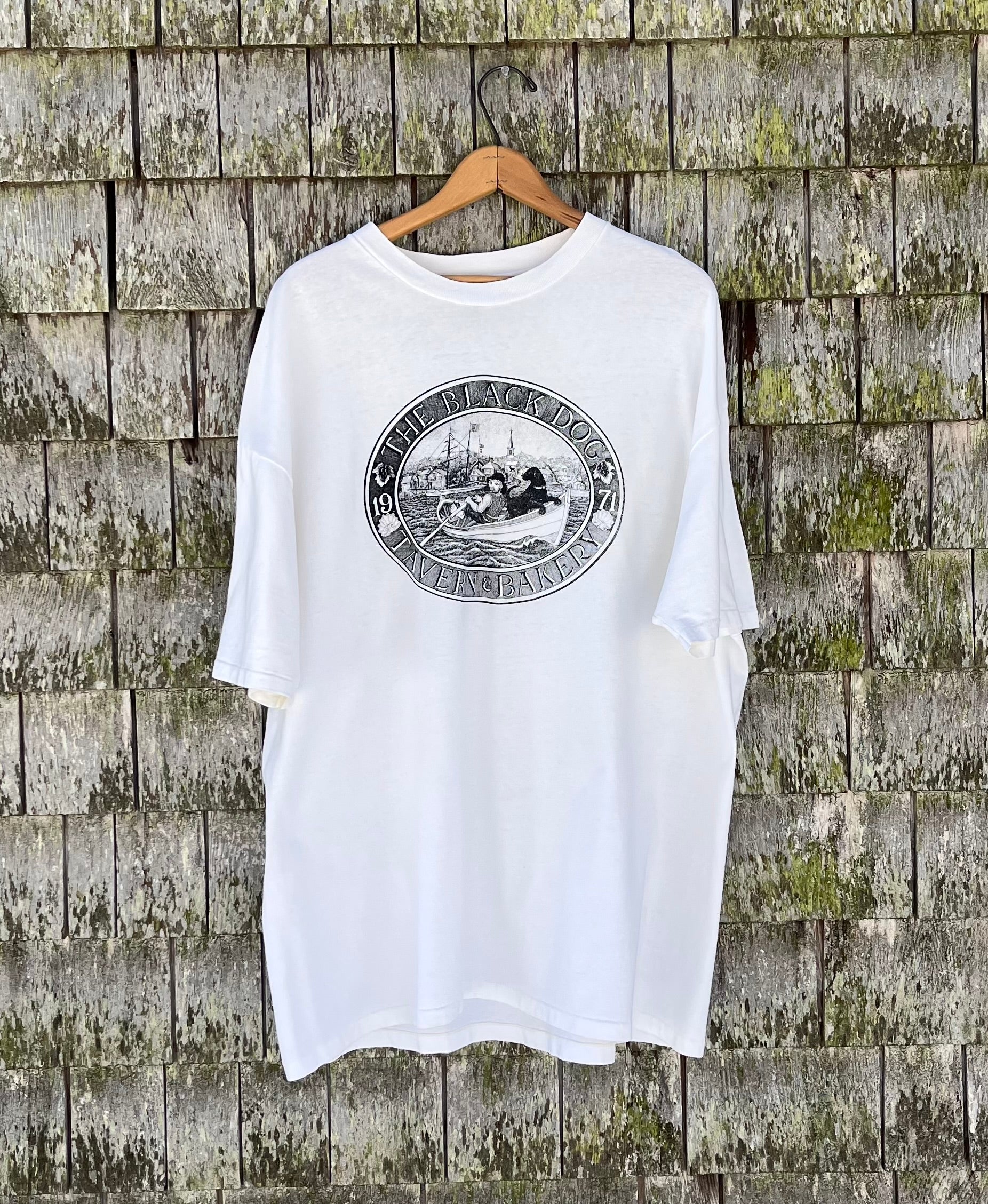 1990s Black Dog Martha's Vineyard Tavern & Bakery t-shirt. Hard to find early 1990s re-issue of original 1970s Black Dog logo design. Off-white with black print on chest.