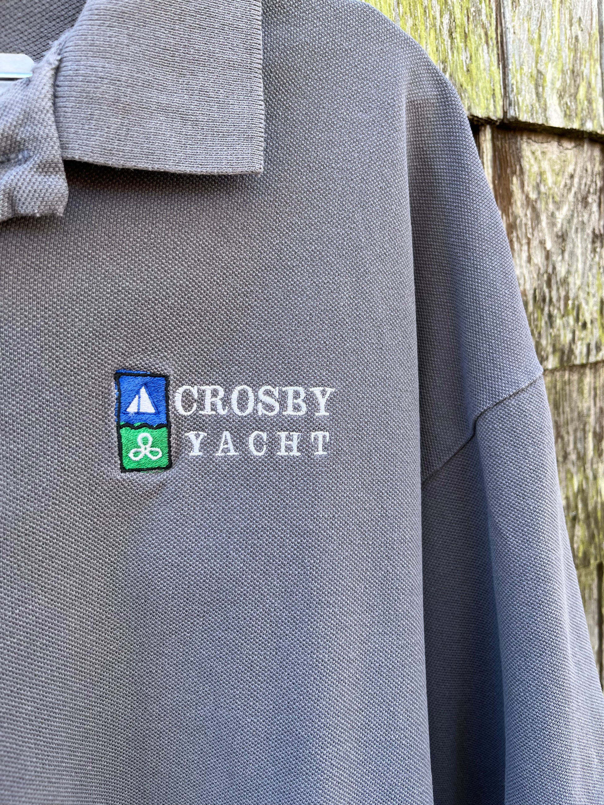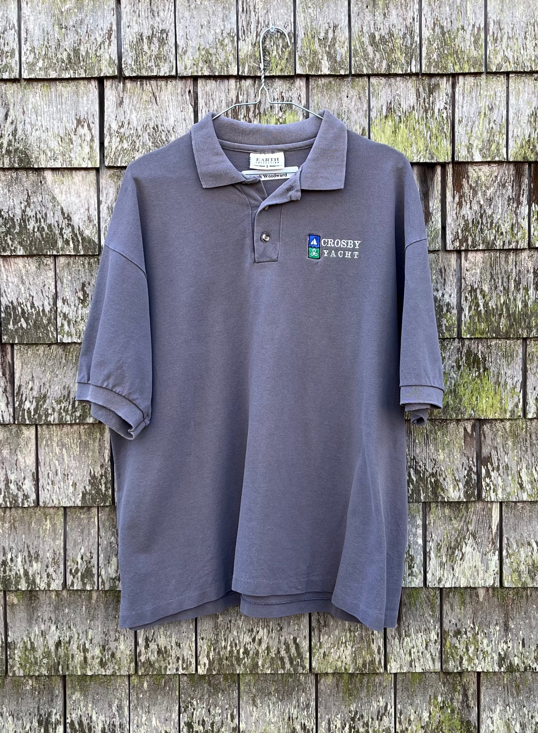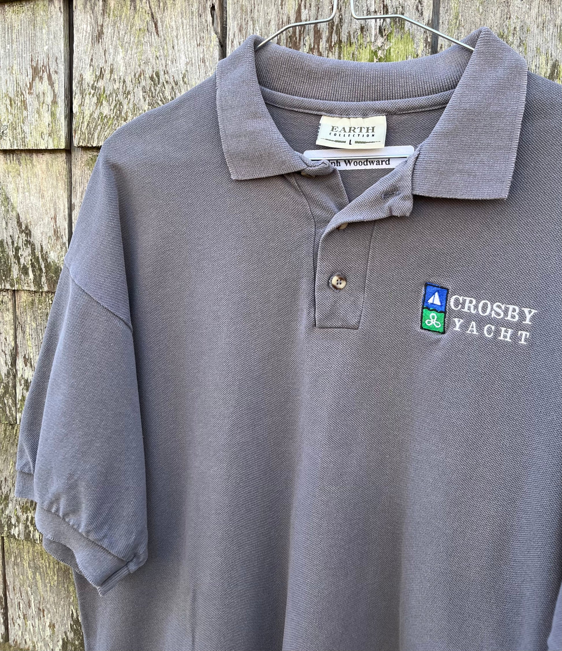 1990s Crosby Yachts Osterville polo shirt. Gray with multicolor embroidery on chest. 100% cotton, made in the USA.