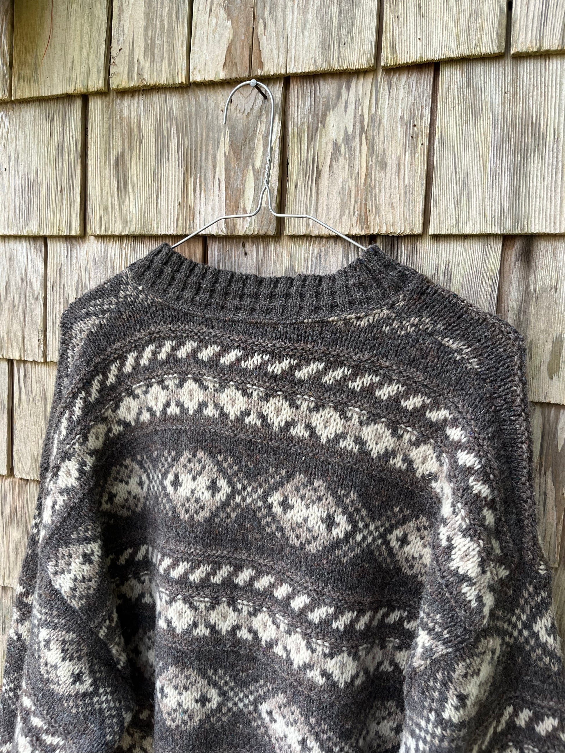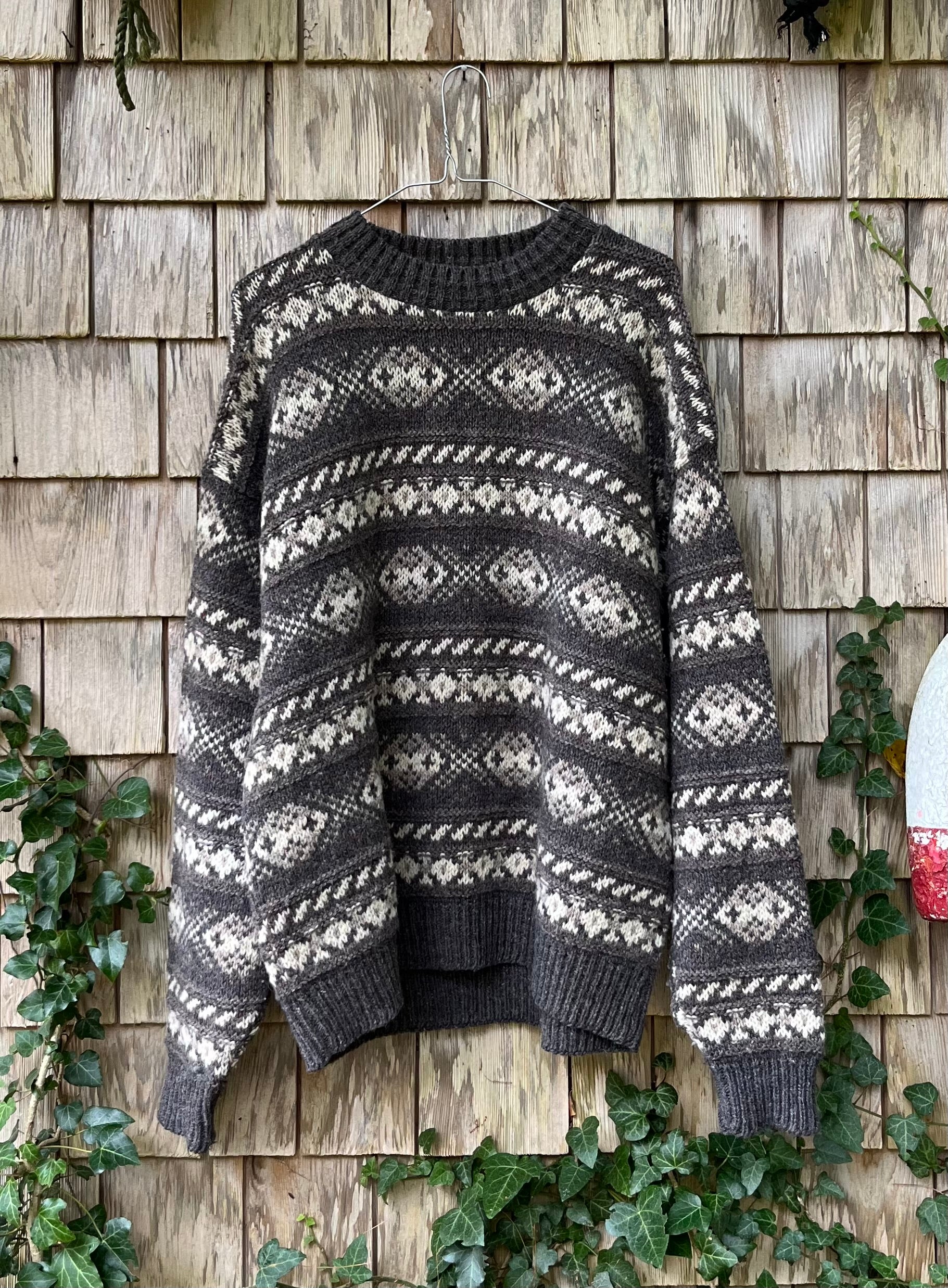 90s Eddie Bauer wool fair isle style knit sweater. Traditional Iceland style color theme in shades of gray, brown & beige. Made in the USA.