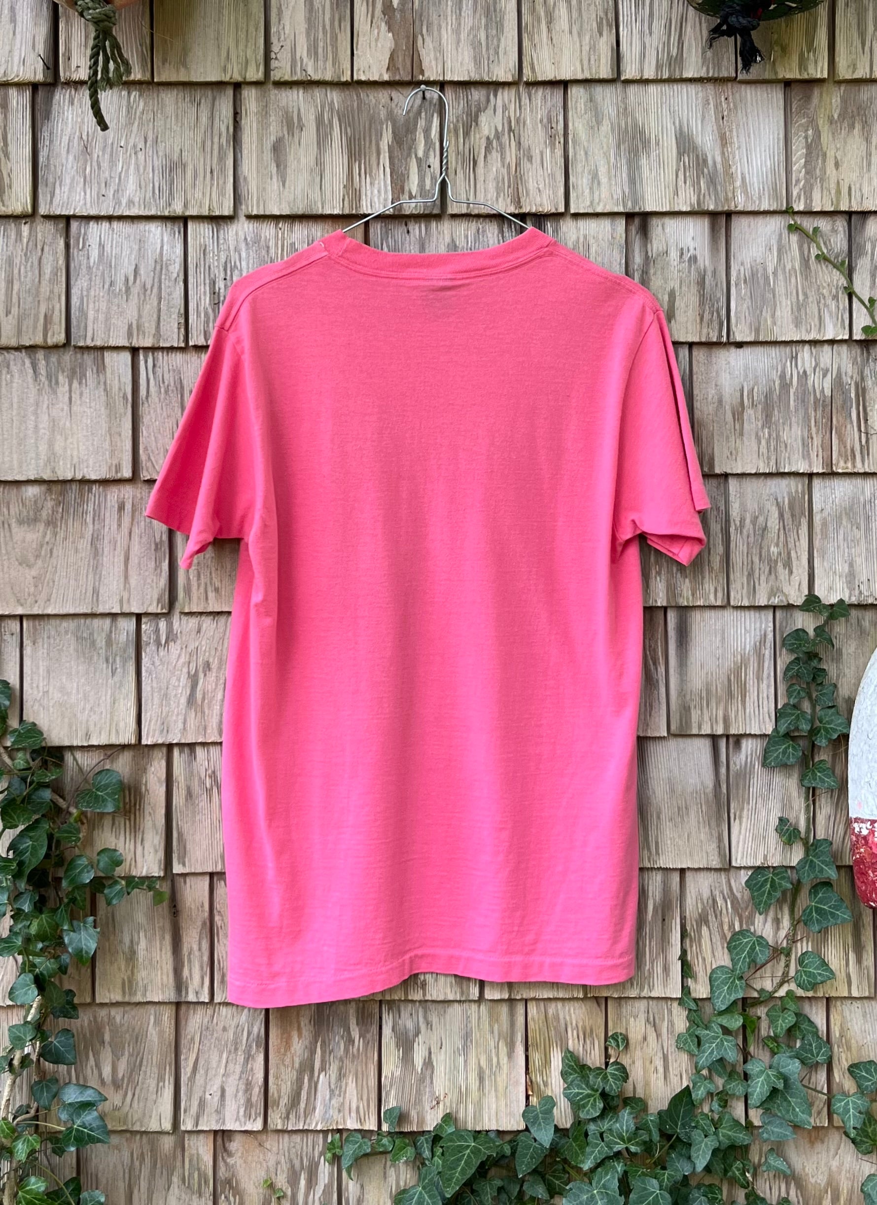 ~80s Evinrude boat motors nautical flag design t-shirt. Pink with multicolor print on chest. 100% cotton, made in the USA, Anvil blank.
