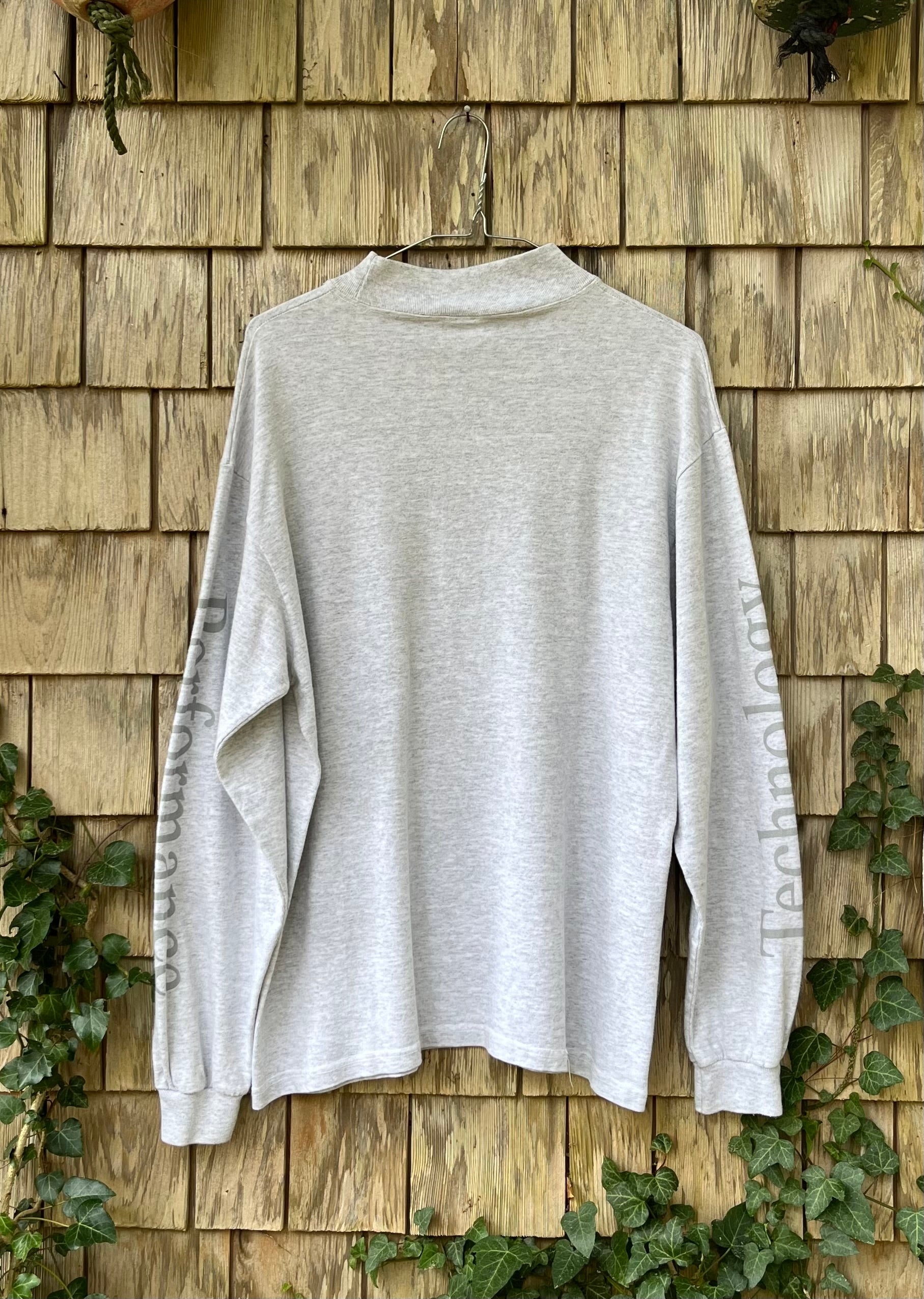 90s G. Loomis 'Where Technology & Performance Meet' long sleeve mock neck shirt. Heather gray with silver prints on chest and sleeves. All cotton, made in the USA, cotton deluxe blank.