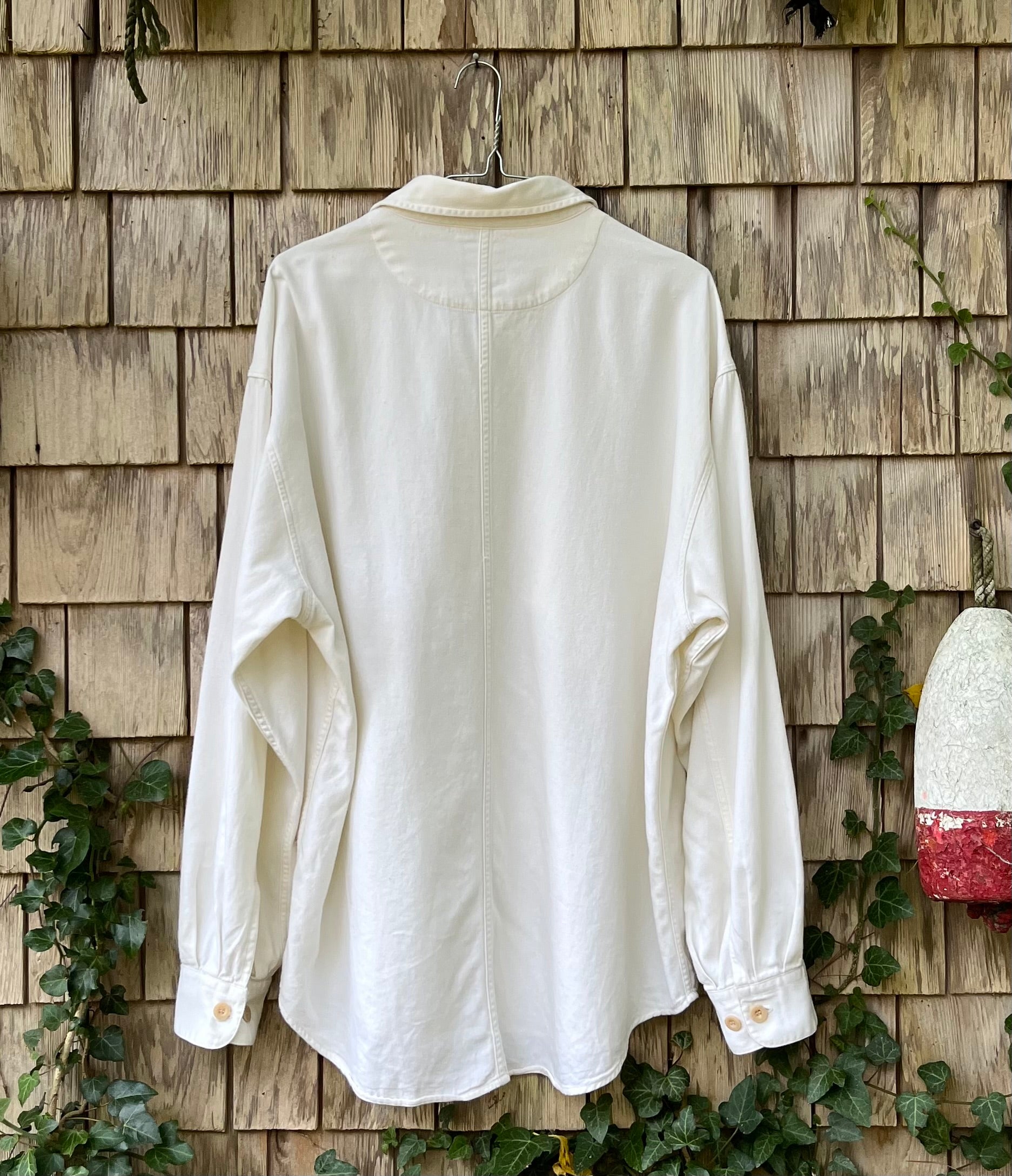 90s GAP button front work shirt. Winter white/light cream color. Double chest pockets. Chunky wooden buttons. Rear center seam construction. Midweight 100% cotton twill.