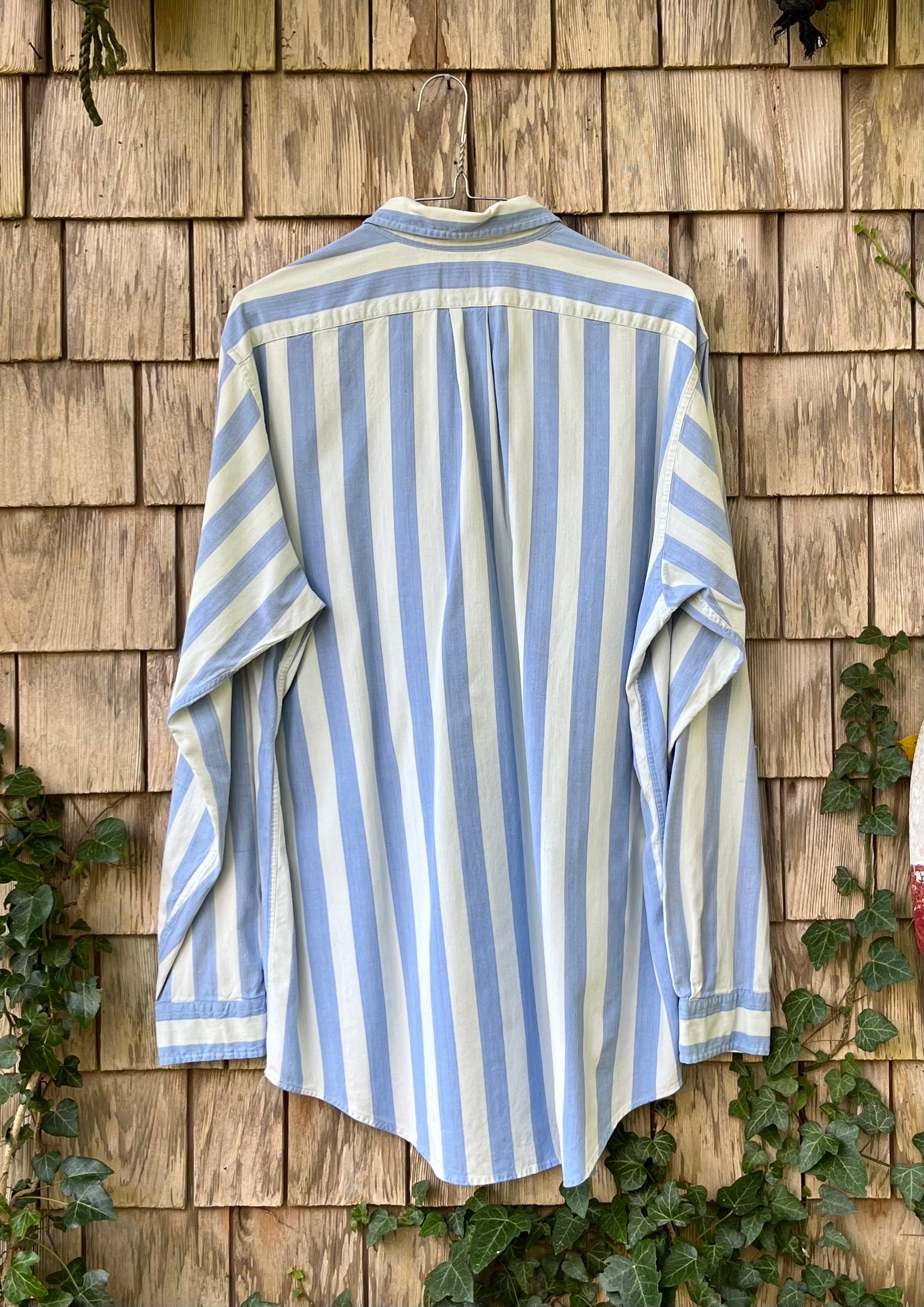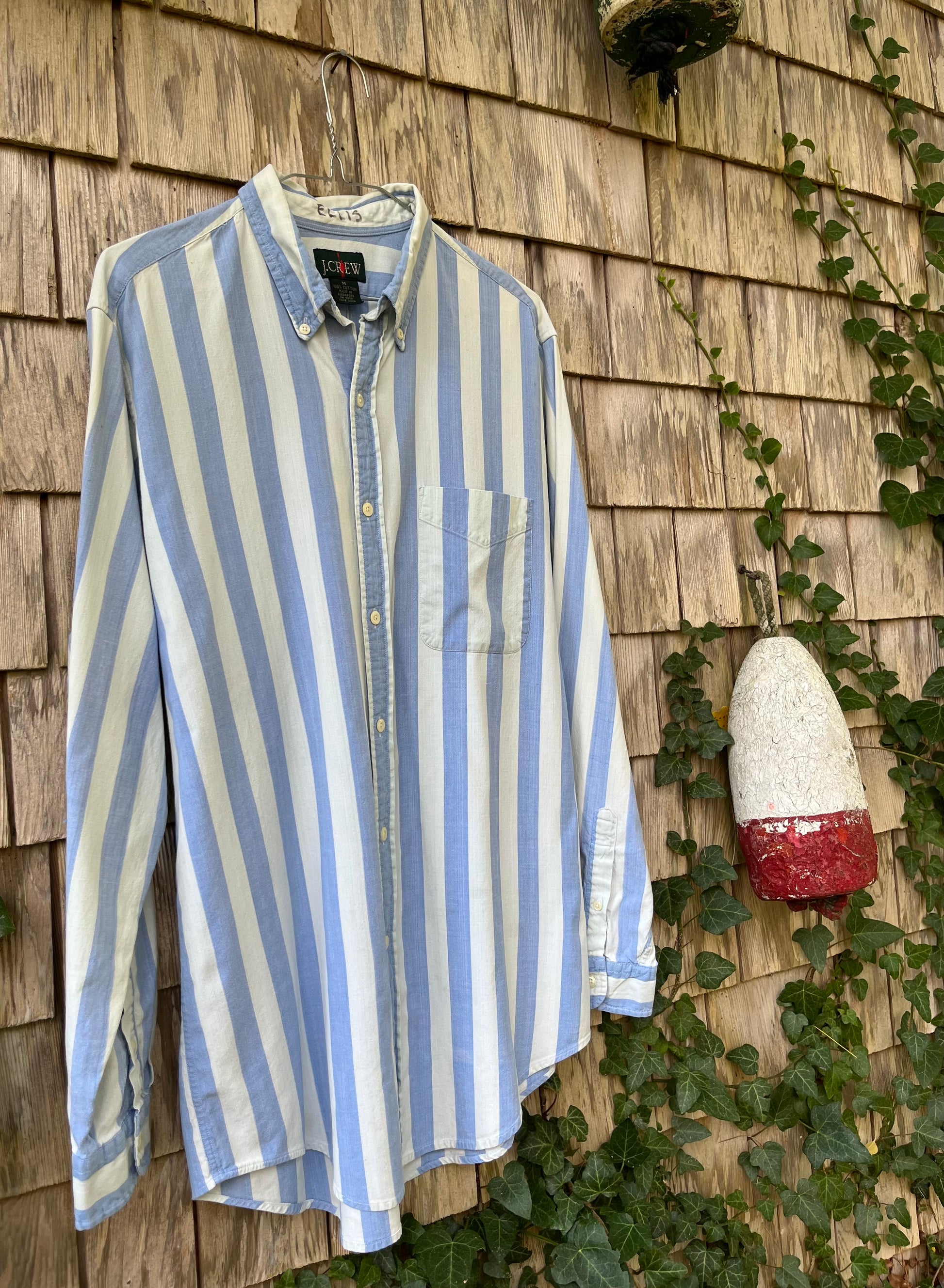 90s J. Crew cotton oxford cloth button down shirt. Wide candy stripe pattern in light blue and very faint sage green. Single chest pocket. Soft, broken-in, 100% cotton oxford cloth weave.