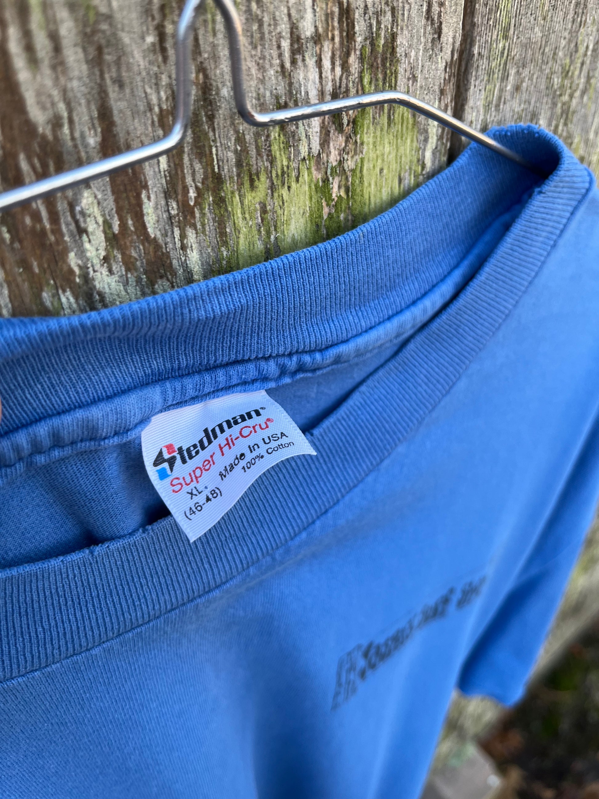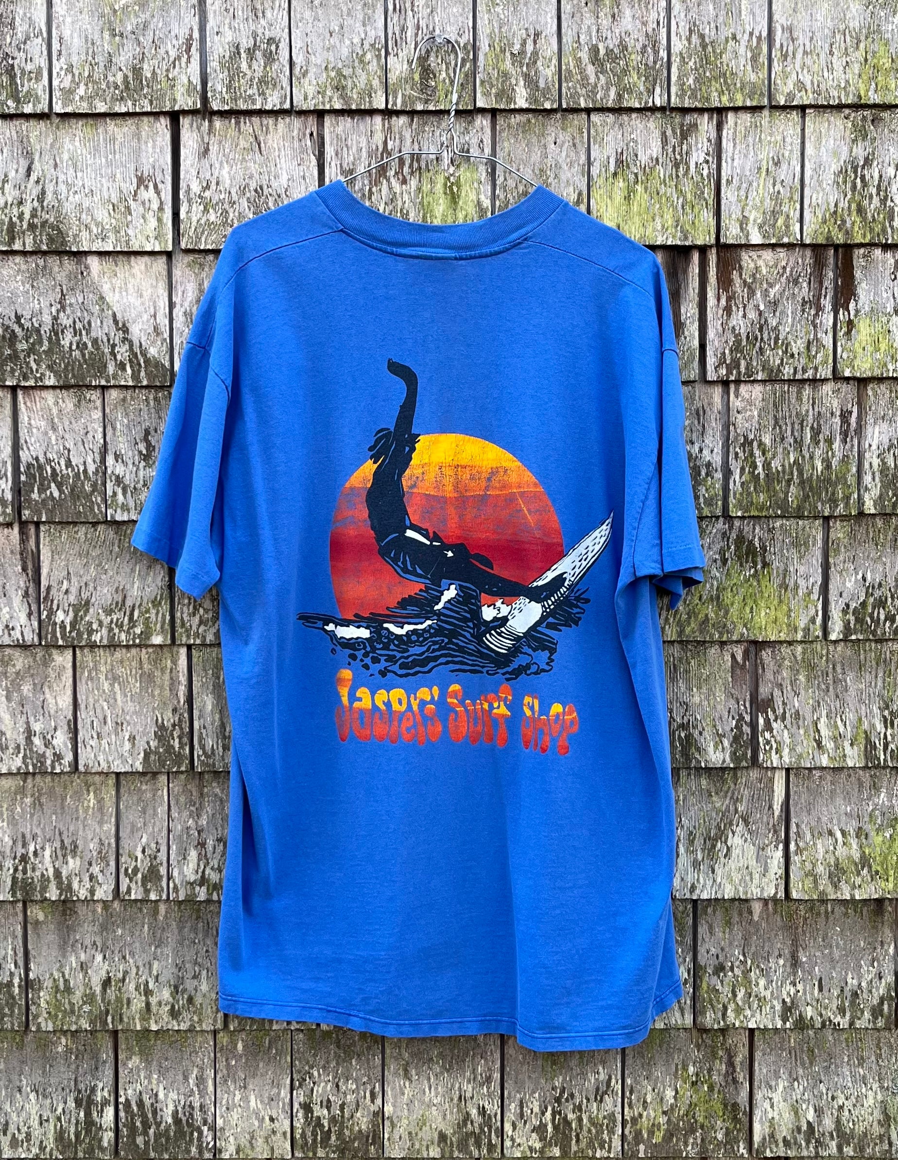 1990s Jasper's Surf Shop Eastham classic logo t-shirt. Blue with multicolor prints on chest and rear. 100% cotton, made in the USA, Stedman Super Hi Cru blank.