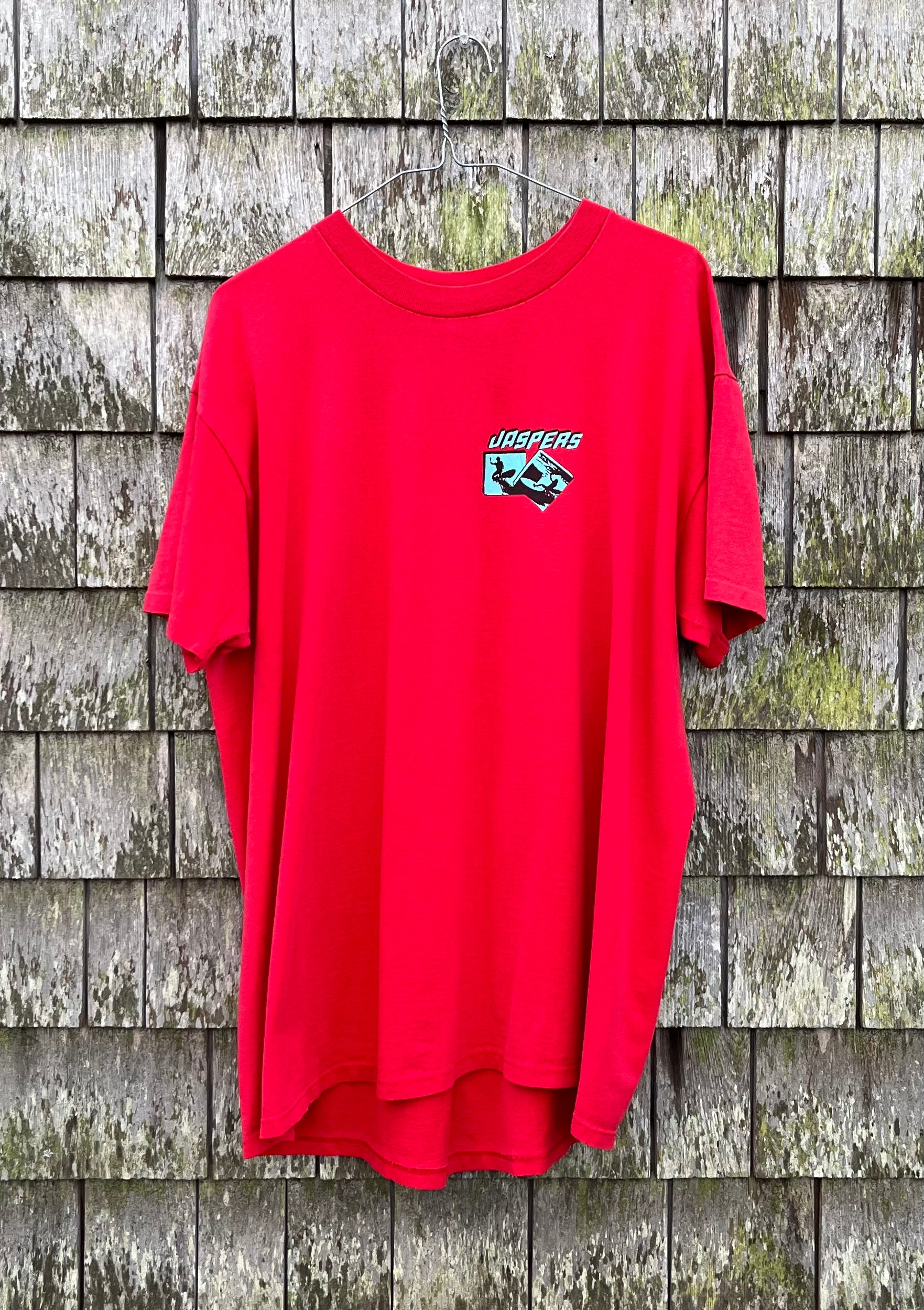 1990s Jasper's Surf Shop Eastham t-shirt. Red with multicolor prints on chest and rear. 100% cotton, made in the USA, Stedman Super Hi Cru blank.