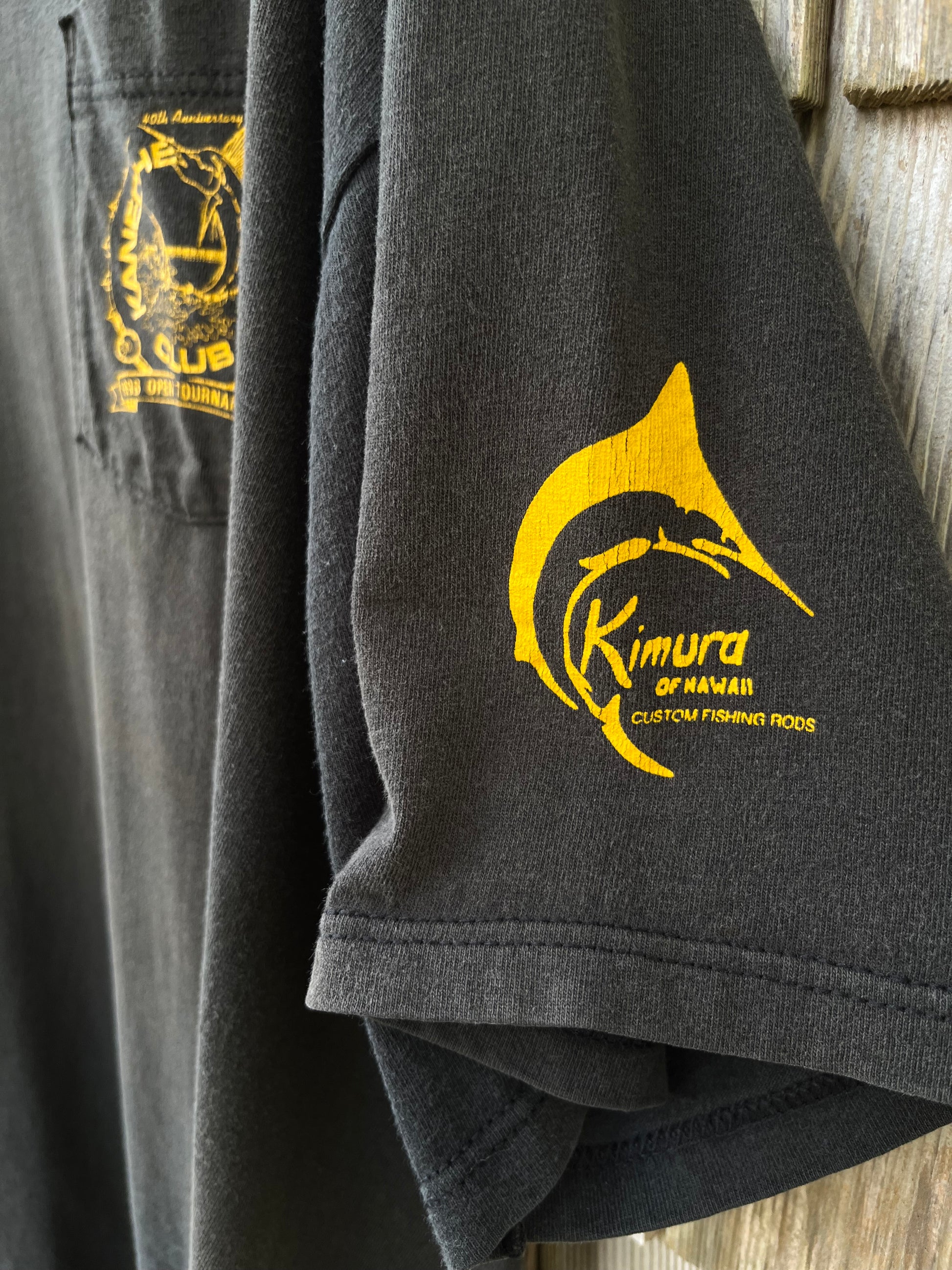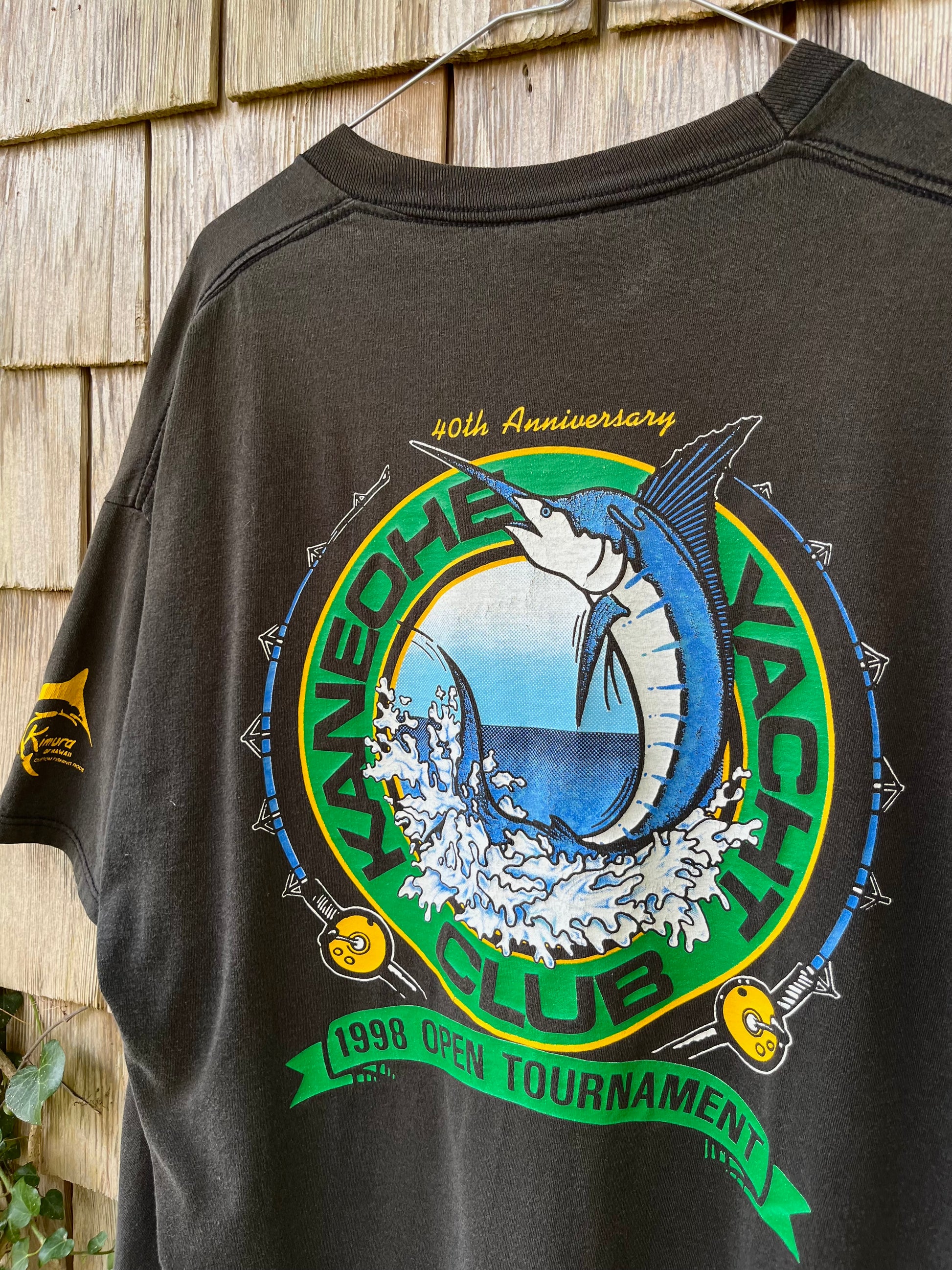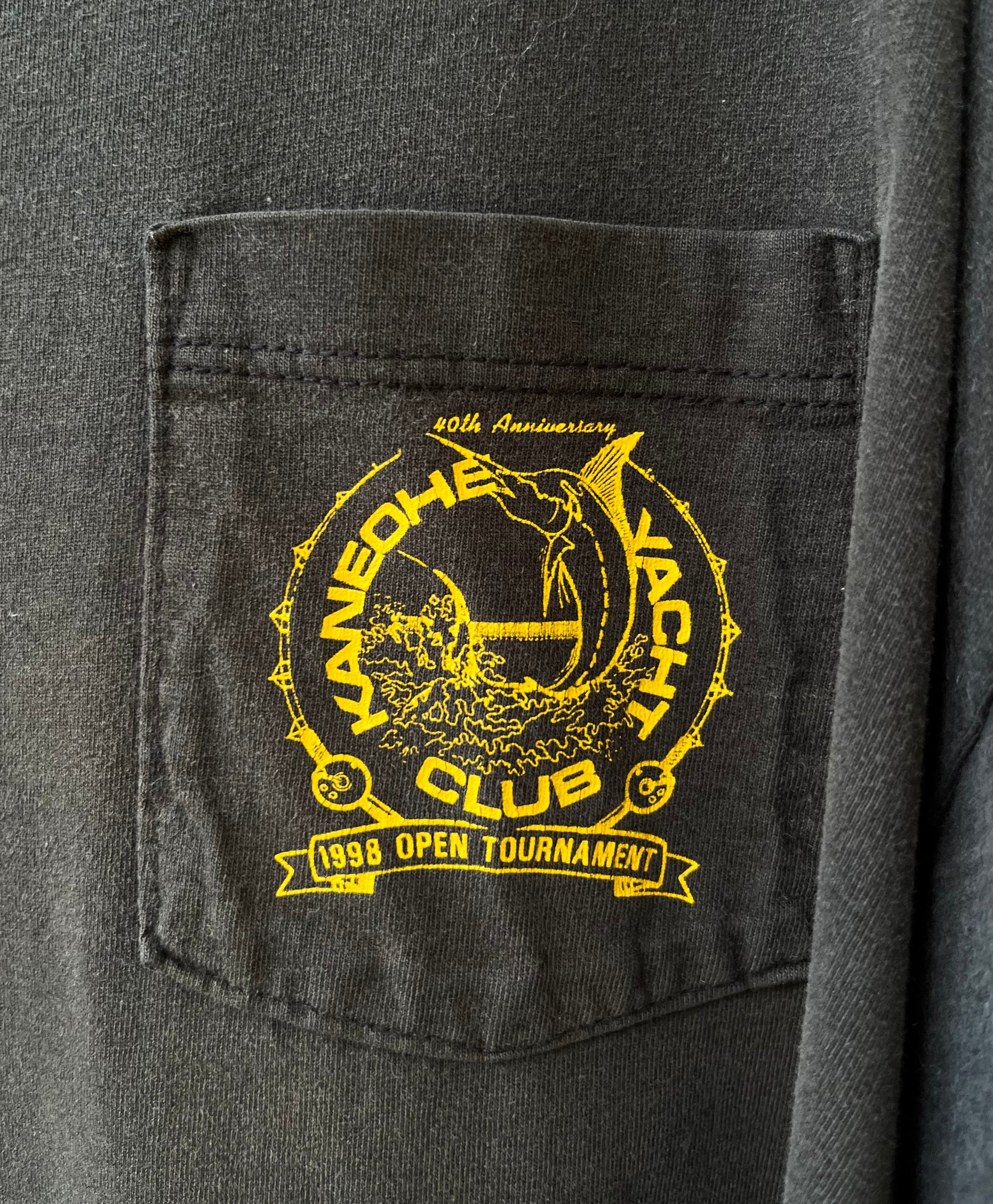 1998 40th Anniversary Kaneohe Yacht Club Open Tournament pocket t-shirt. Black with multicolor prints on chest, sleeves & rear. 100% cotton, made in the USA, Jerzees Heavyweight blank.