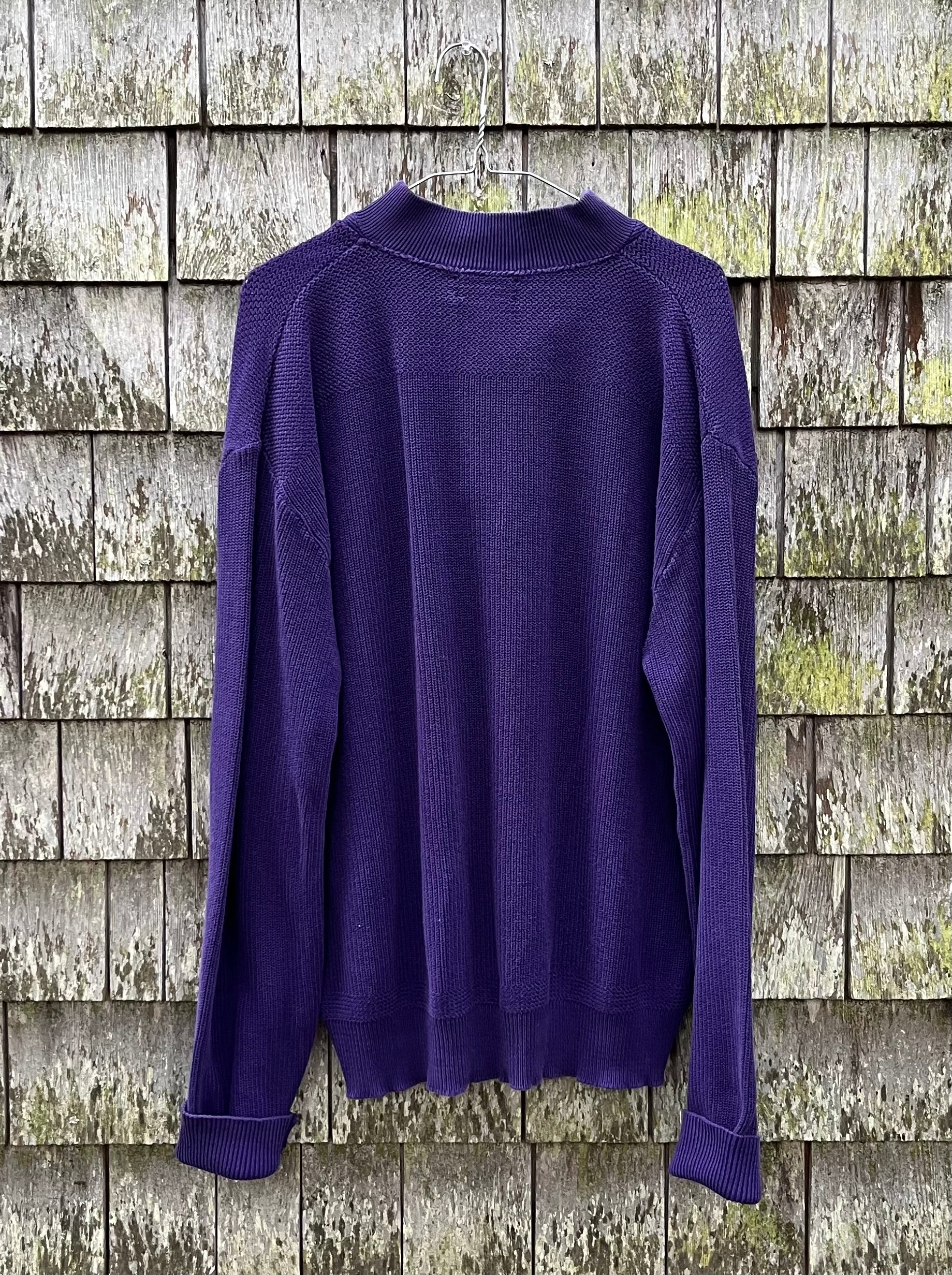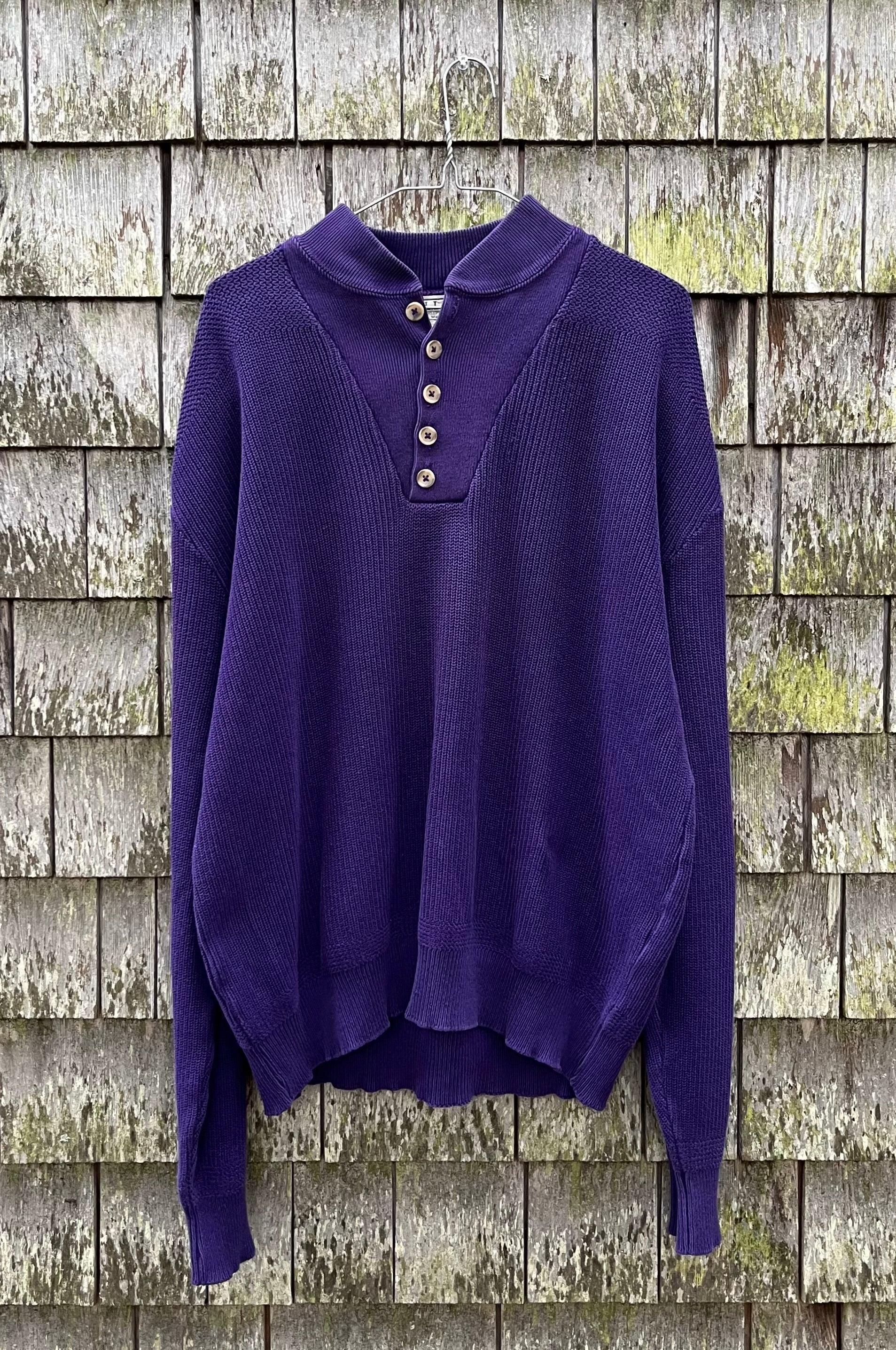 90s L.L. Bean cotton 'Fatigue' knit sweater. Purple. 100% cotton. 5-button placket. Made in the USA.