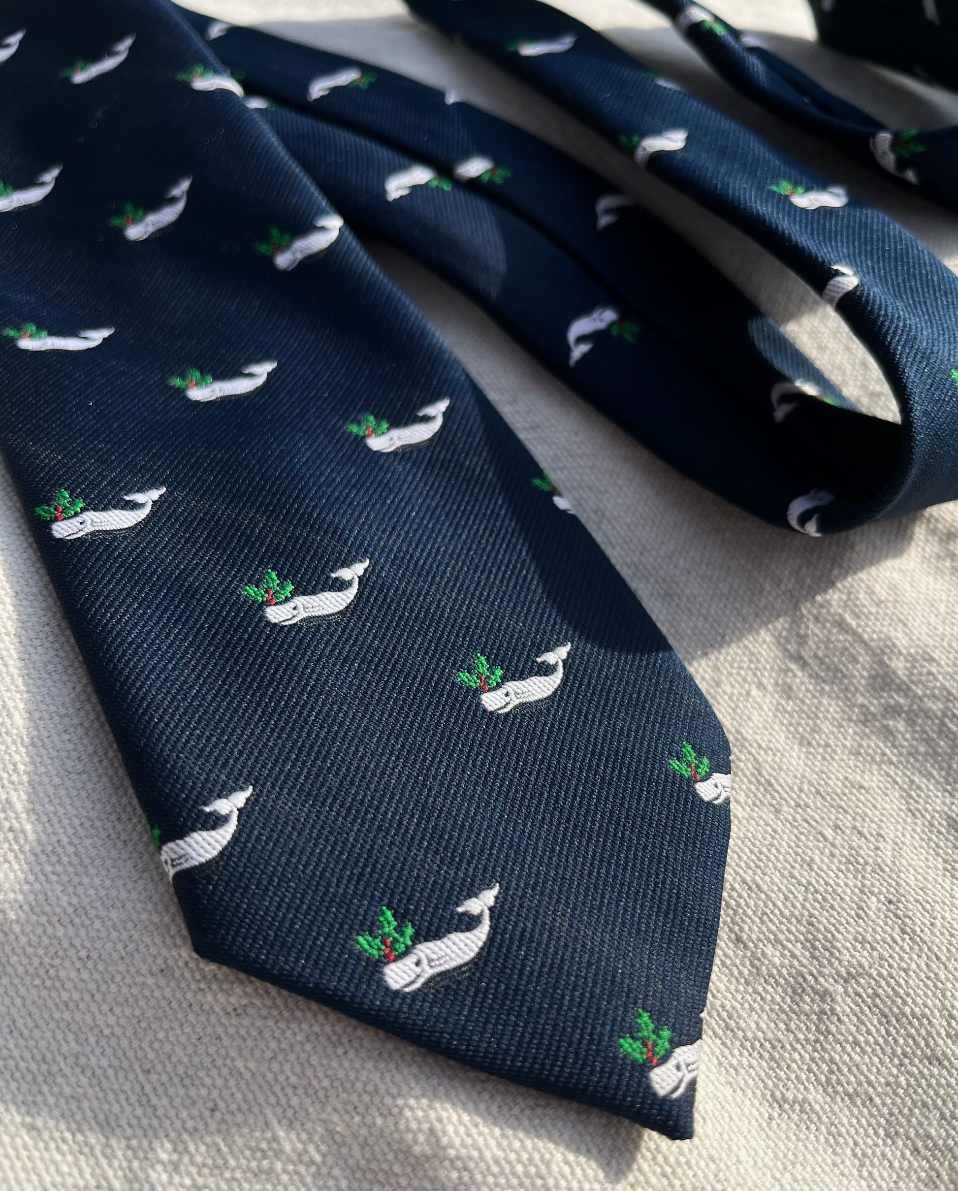 ~1970s Cape Cod Neckwear Christmas whale emblematic neck tie. Navy blue ground. Polyester repp.