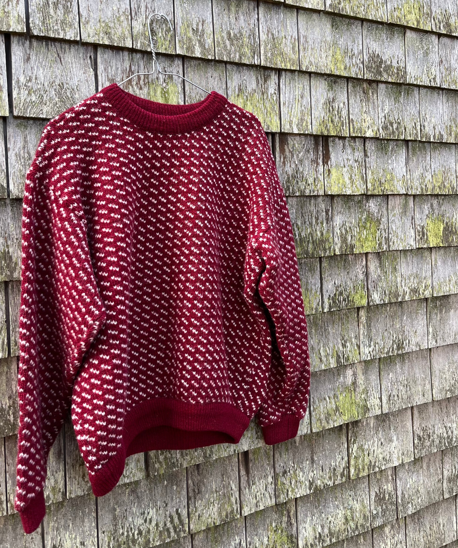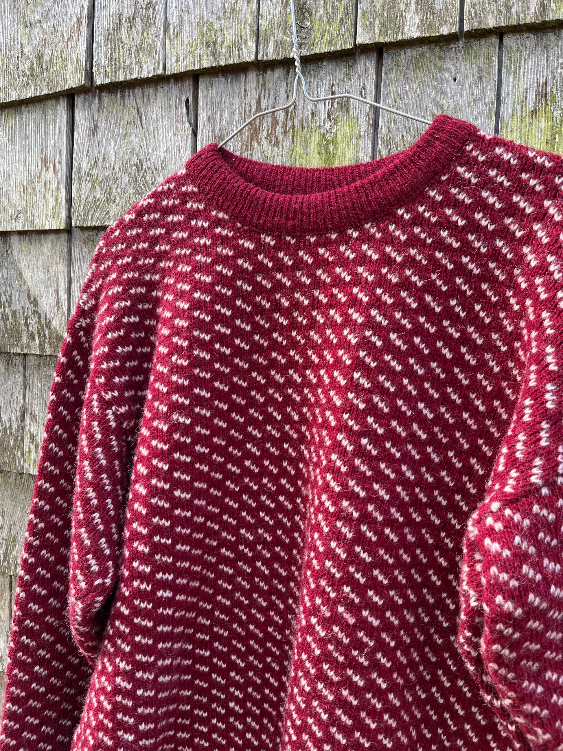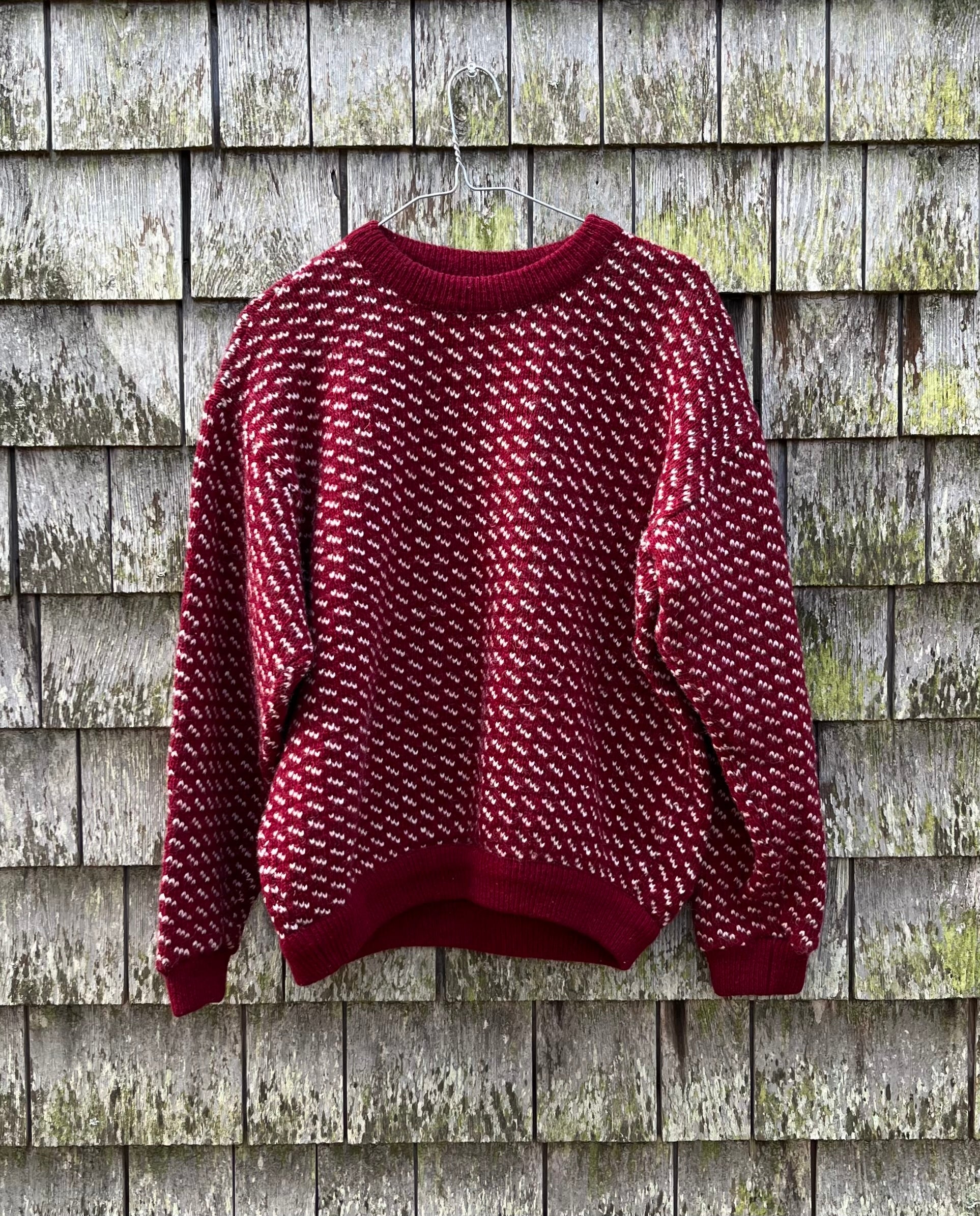 90s L.L. Bean wool birdseye knit sweater. Cranberry and white knit. 100% wool. Made in Norway.