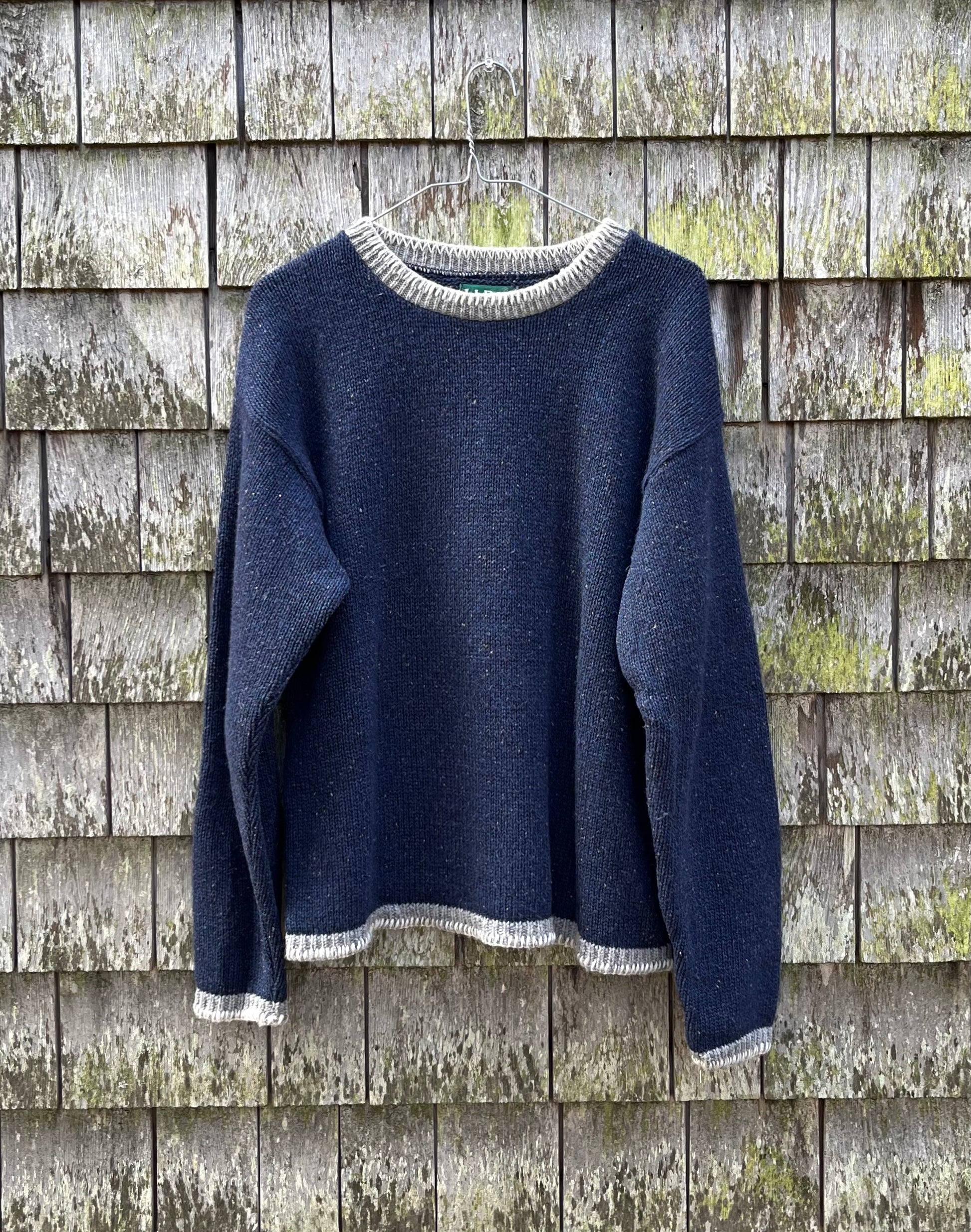 90s L.L. Bean Factory Store flecked wool blend knit sweater. Indigo blue with beige/gray cuffs and collar trim. Wool nylon blend. Made in the USA.