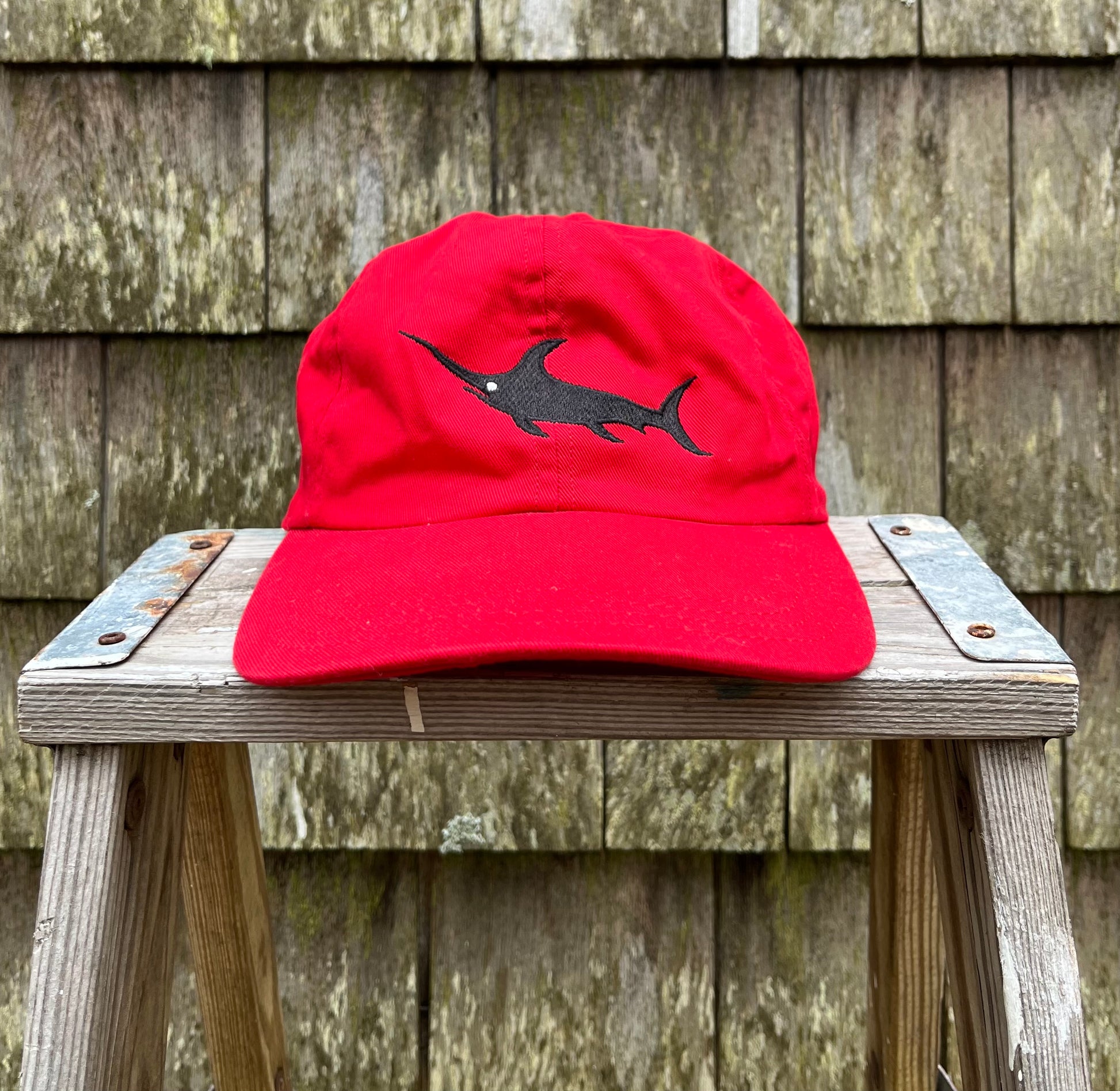2000s Larsen's Seafood Market, Menemsha Martha's Vineyard, strapback cap. Red with black embroidery on front and rear. Nylon strap adjust. 100% cotton, made in the USA by New England Cap Company.