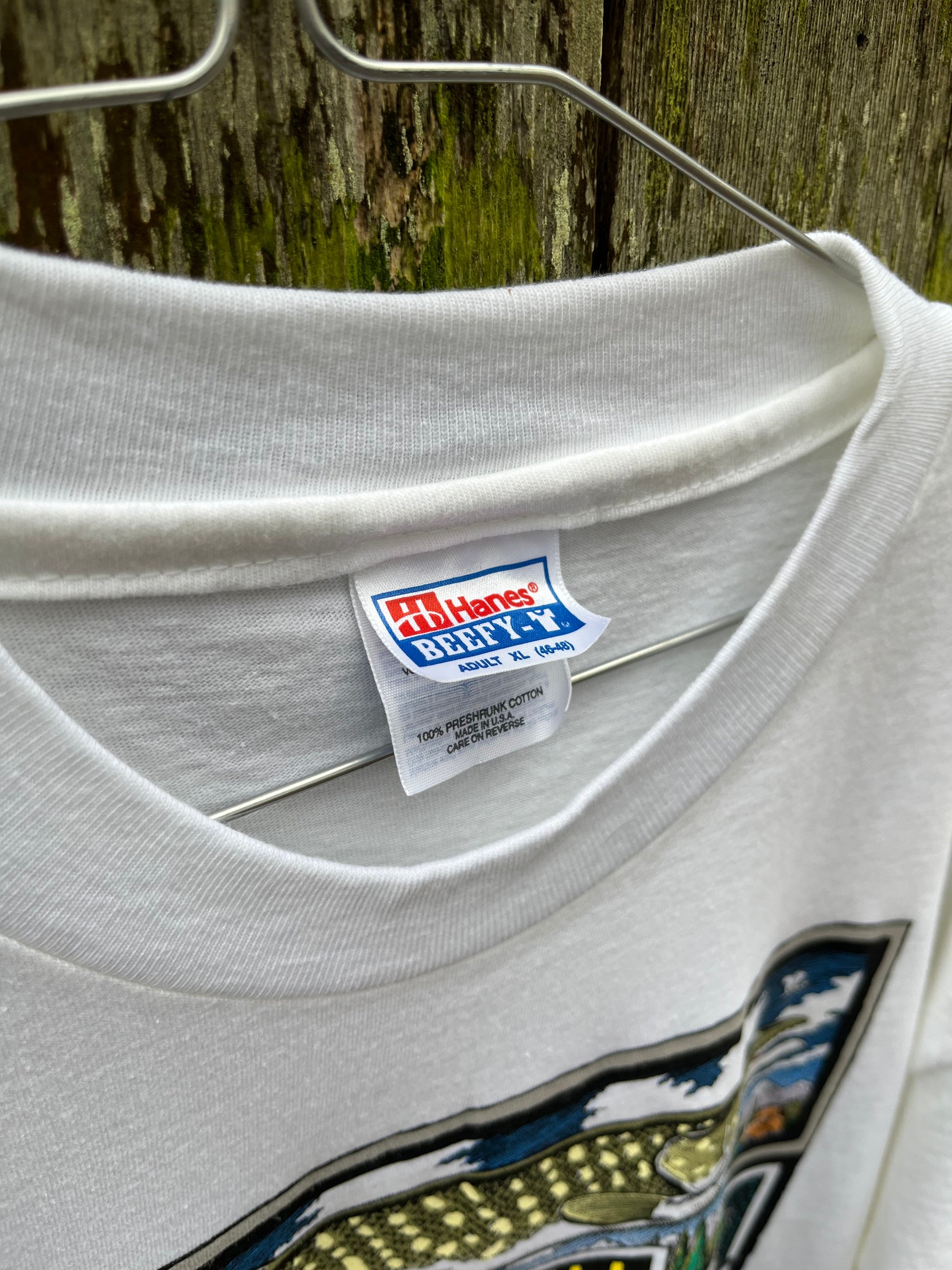 1990s Nantucket Bluefish Ray Troll designs t-shirt. White with multicolor print on chest rear.