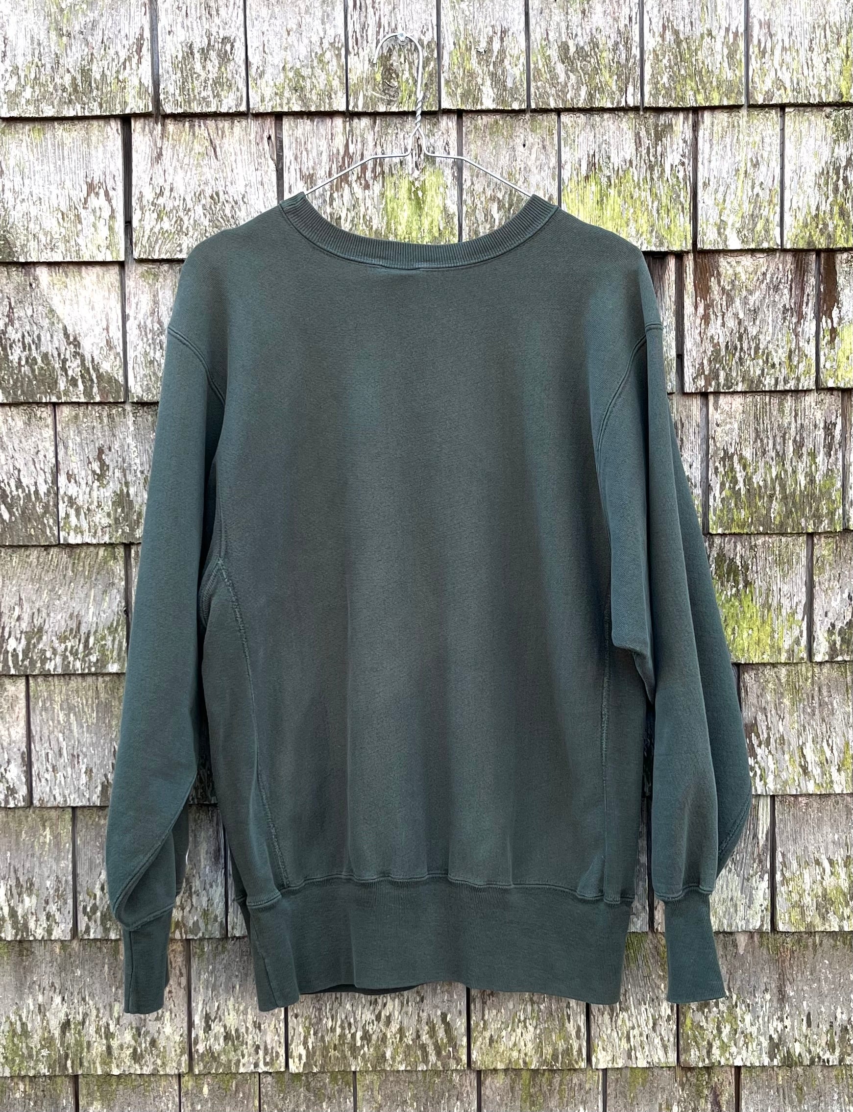 1990s Nantucket Champion reverse weave crewneck sweatshirt. Faded forest green with white print on chest. 100% cotton, made in the USA.