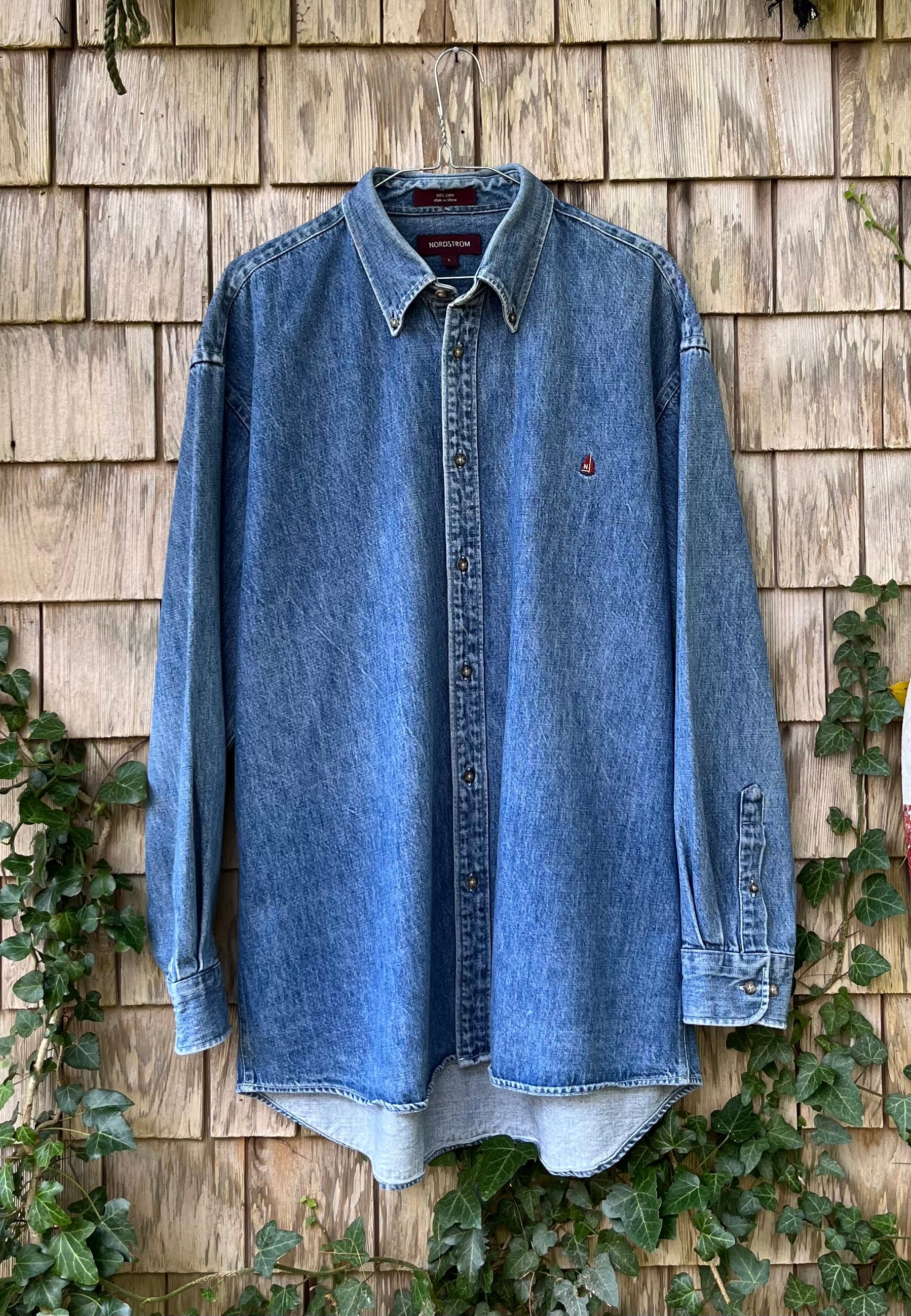 90s Nordstrom heavyweight denim button down shirt. Classic medium wash indigo blue color. Small sailboat logo embroidery on chest. 100% cotton denim.