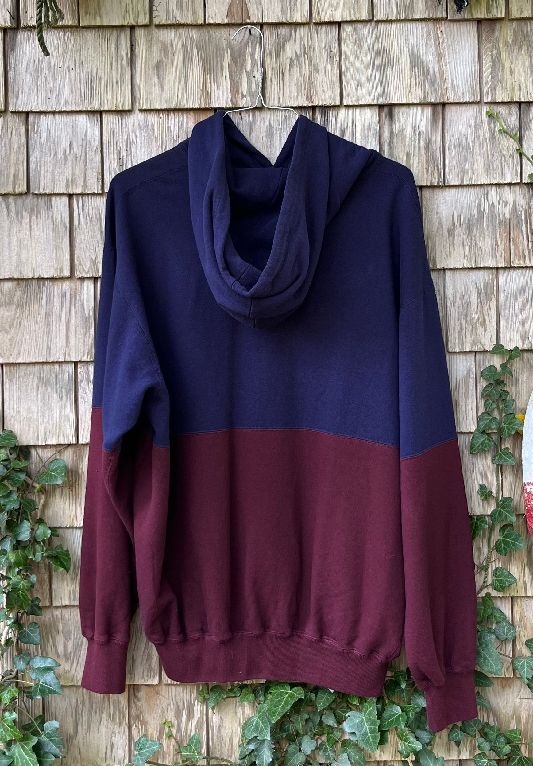 90s Polo Ralph Lauren hooded sweatshirt. Navy blue and maroon colorblock design. Hood with drawstring. Soft, 100% cotton.