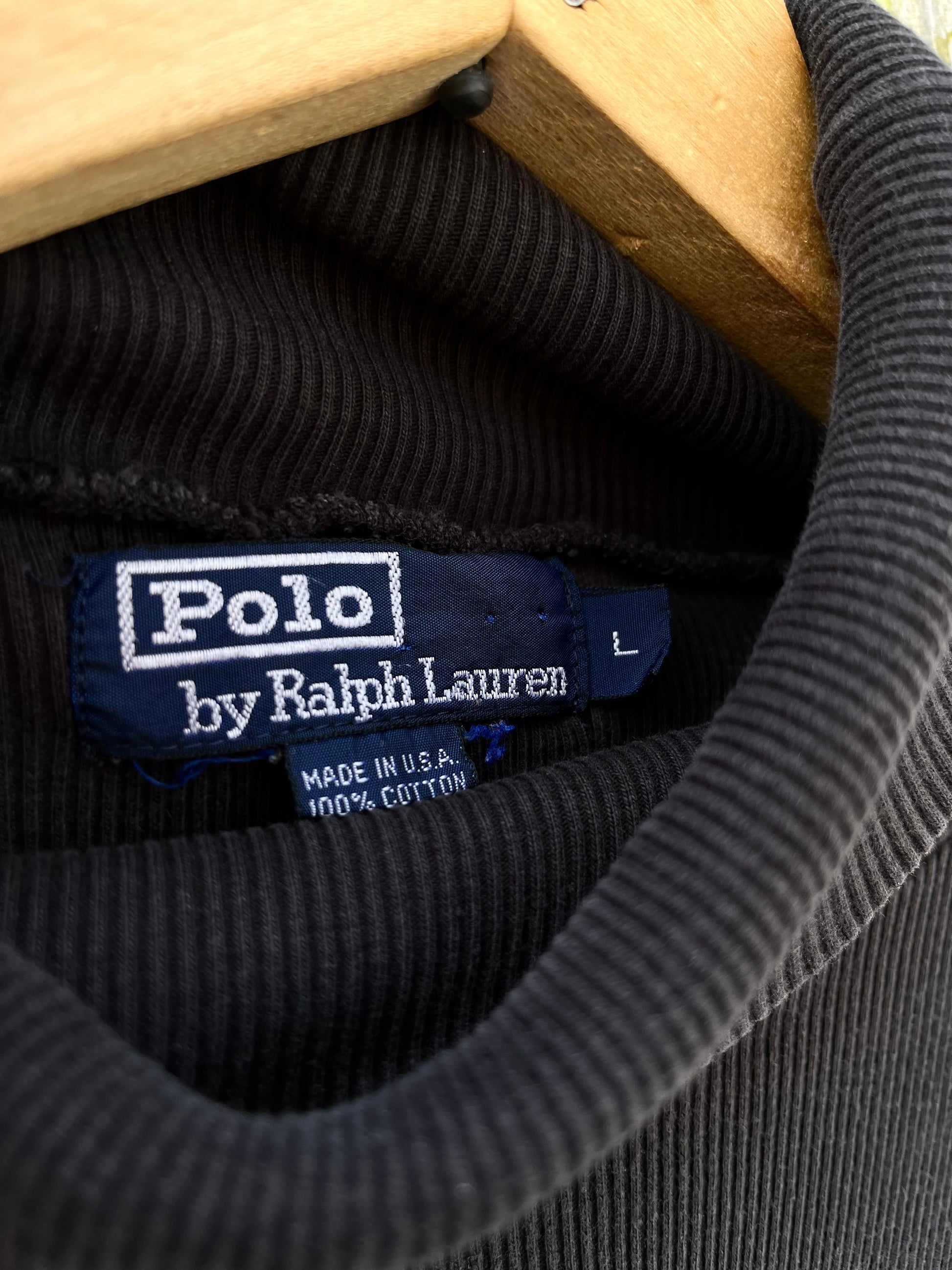 90s Polo Ralph Lauren ribbed weave cotton turtleneck. 100% cotton. Black. Made in the USA.