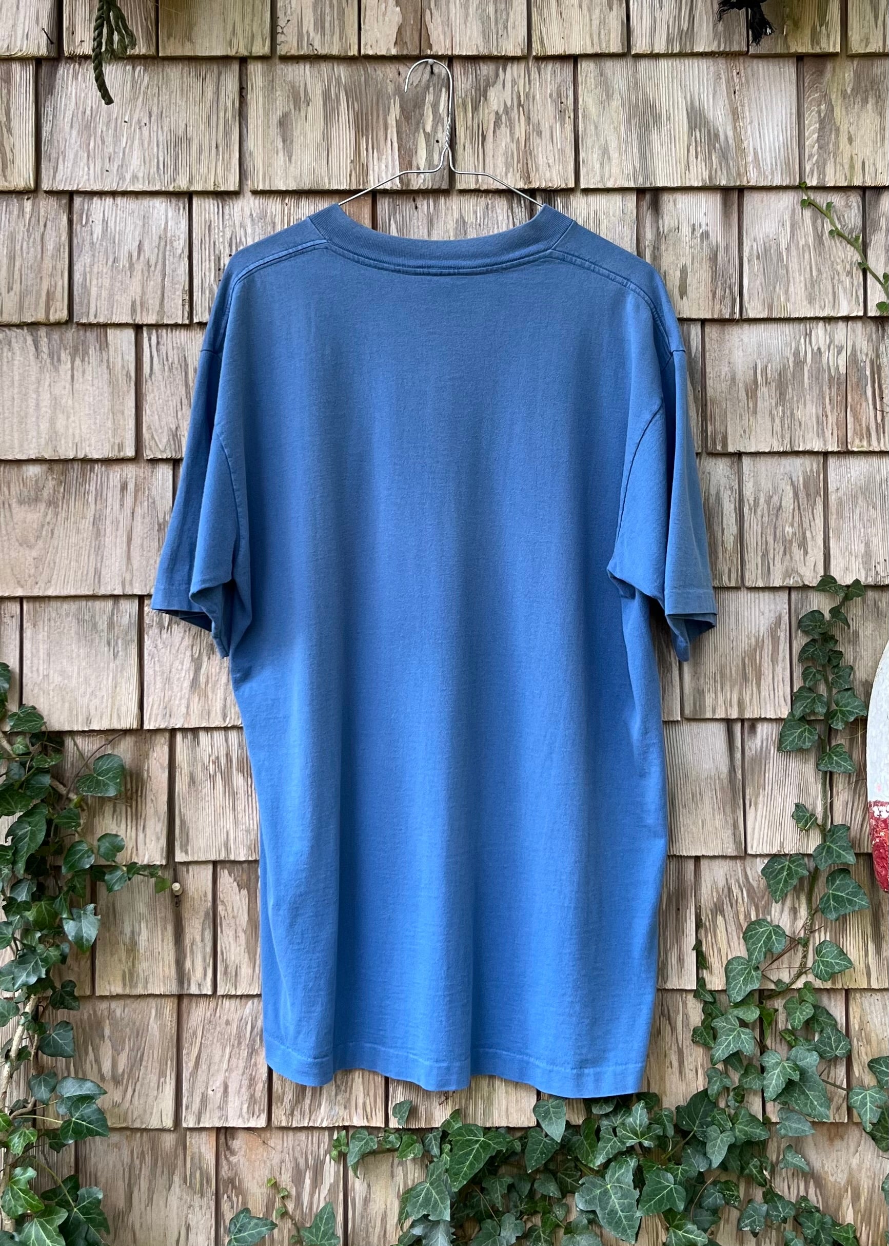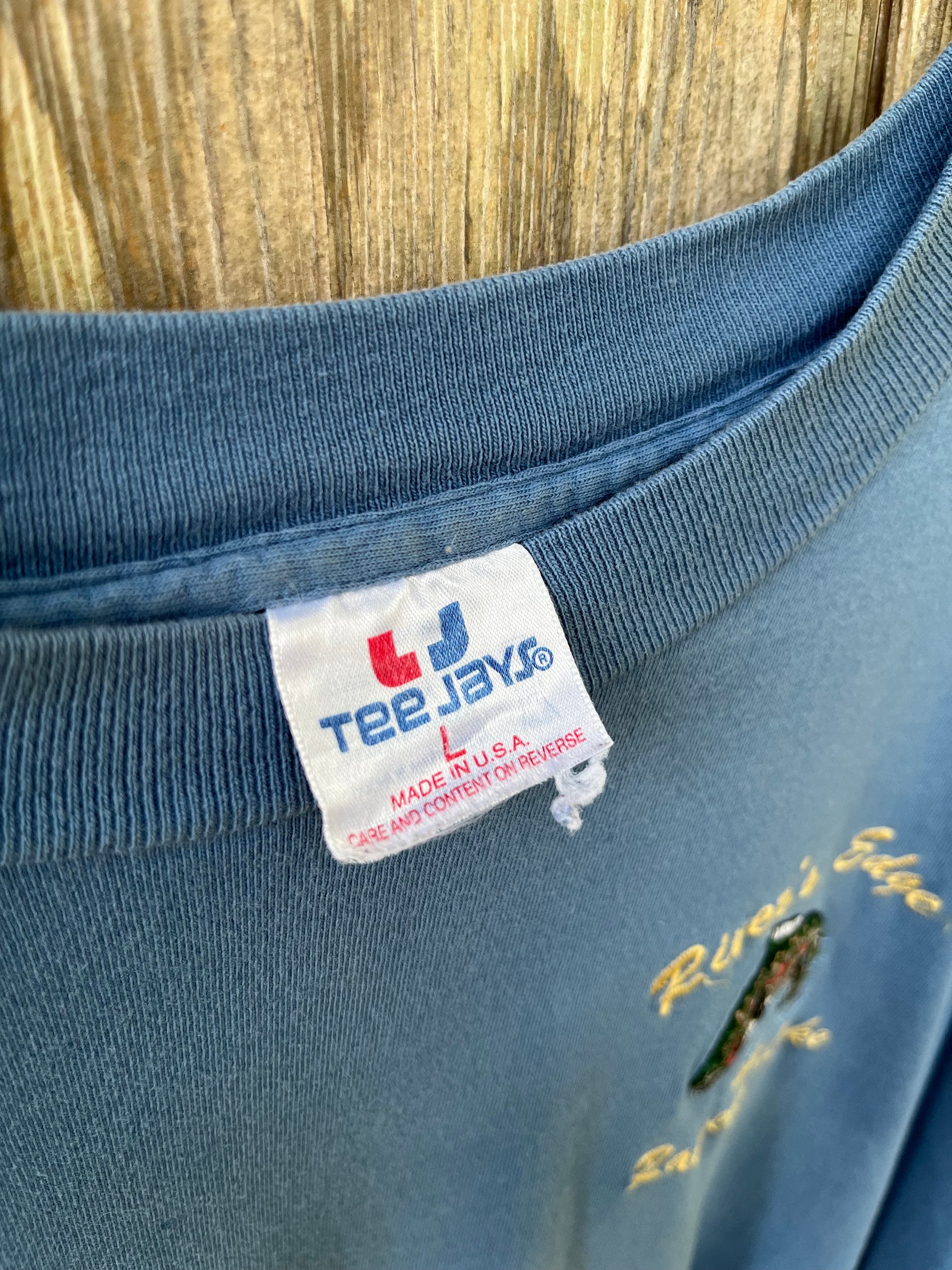 90s River's Edge Sports Shop Rangeley Lake Maine t-shirt. Light blue with multicolor embroidery on chest. 100% cotton, made in the USA, Teejays blank.