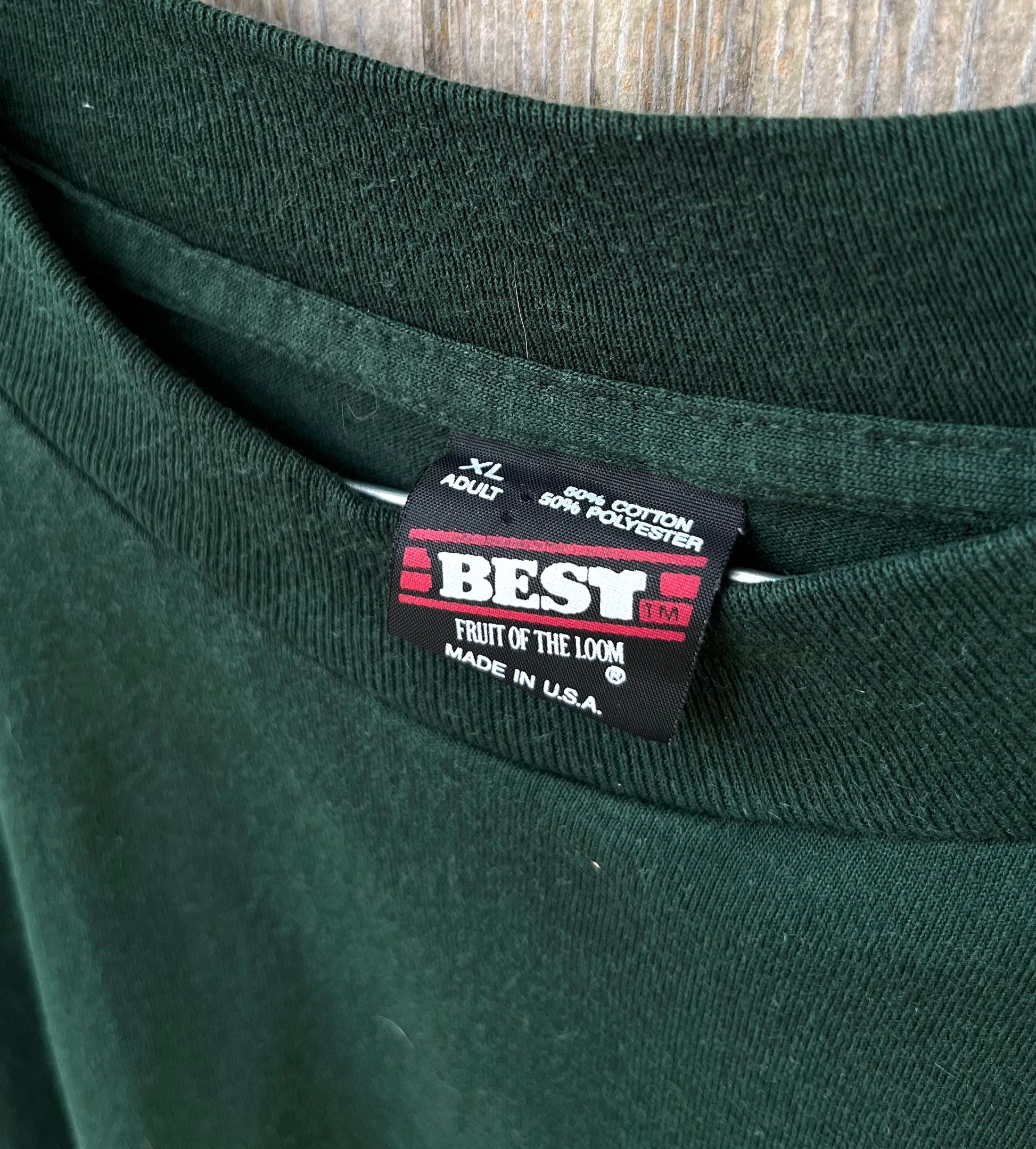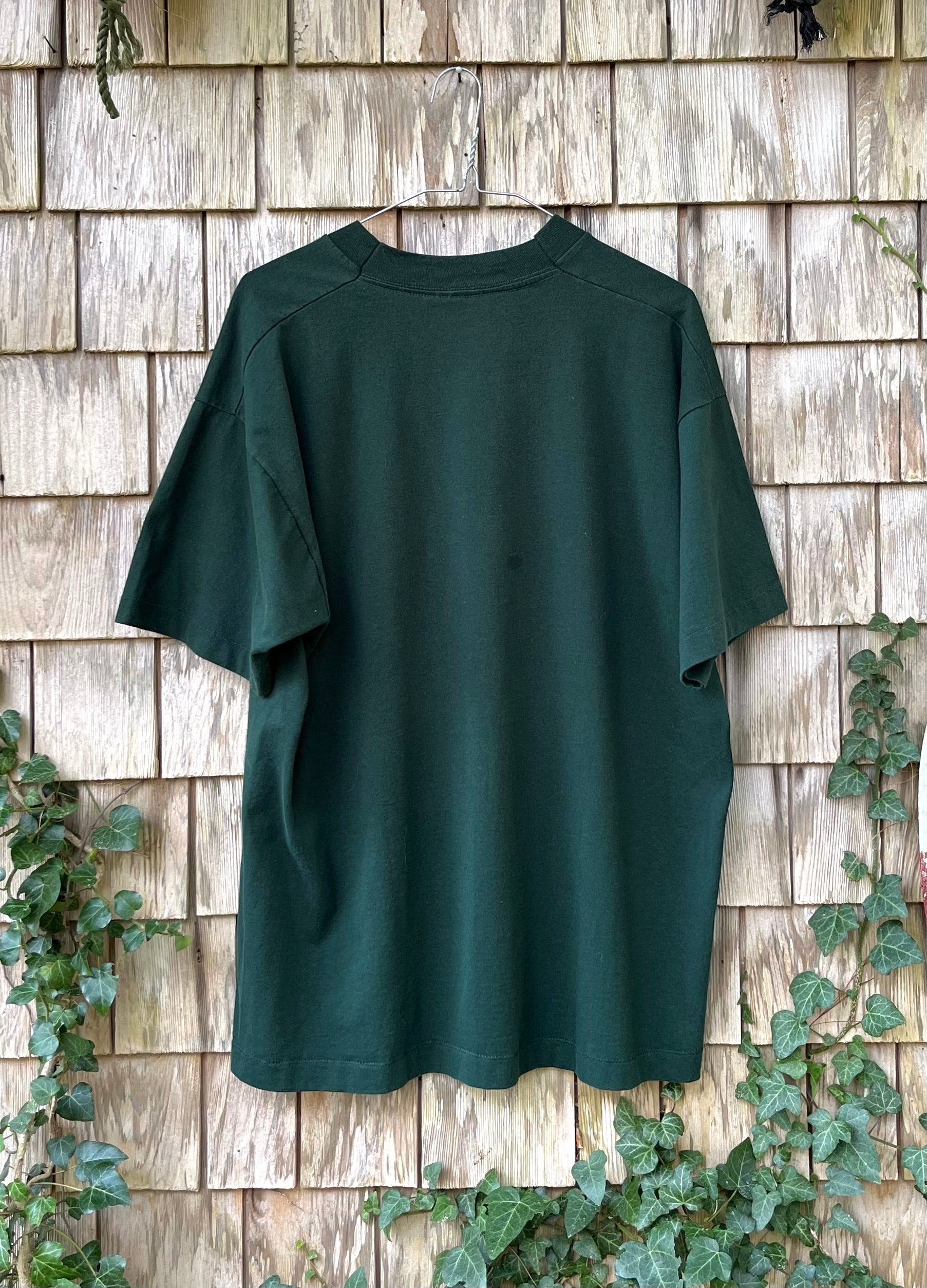 1994 Brown's Point Tacoma Washington Salmon Bake t-shirt. Dark forest green with white print. 50/50 cotton blend, made in the USA, Fruit of the Loom BEST blank.
