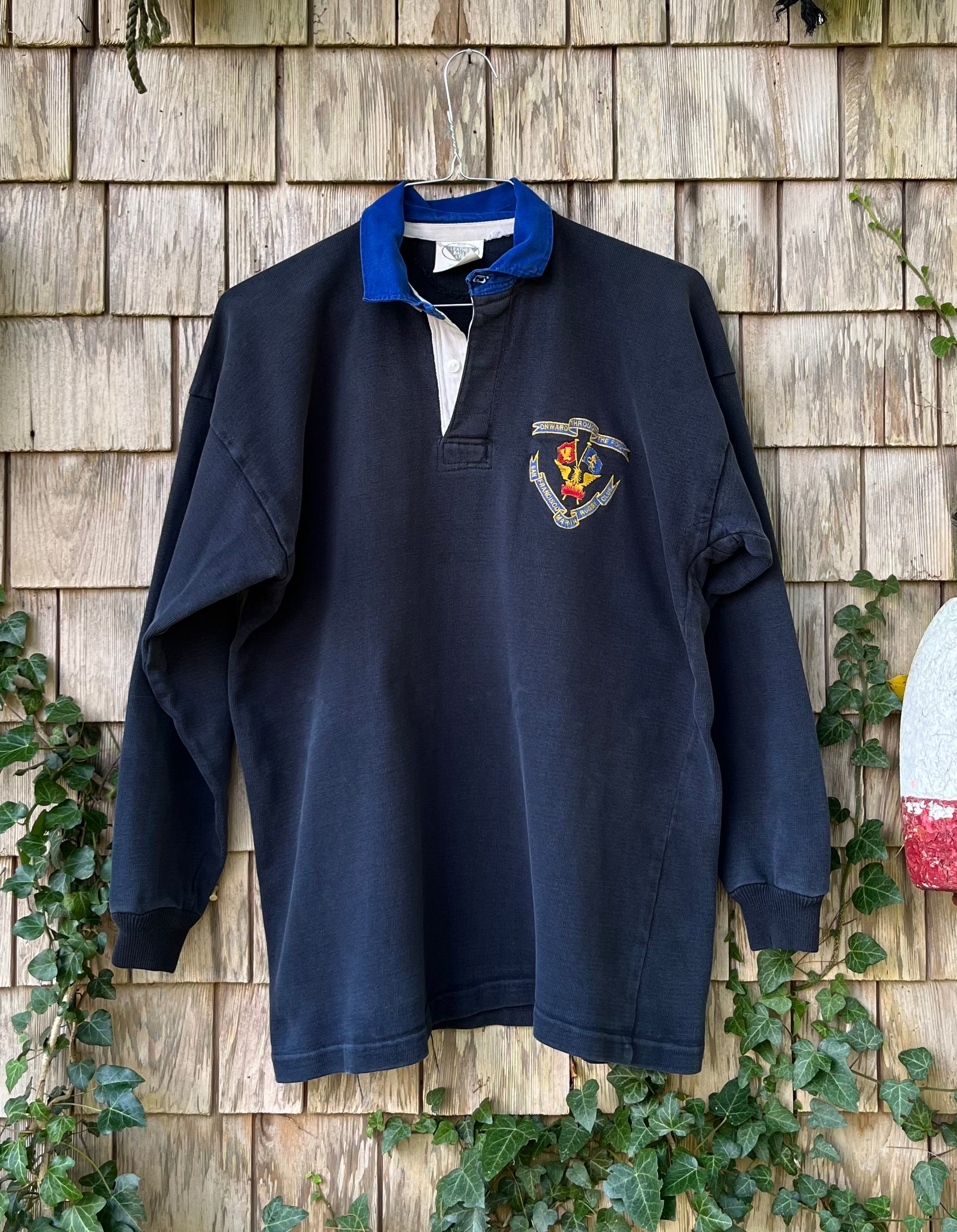 90s San Francisco Rugby Club shirt made by Leather Balls LTD. Faded navy blue with white twill collar placket & royal blue collar. Heavyweight 100% cotton. Made in the USA.