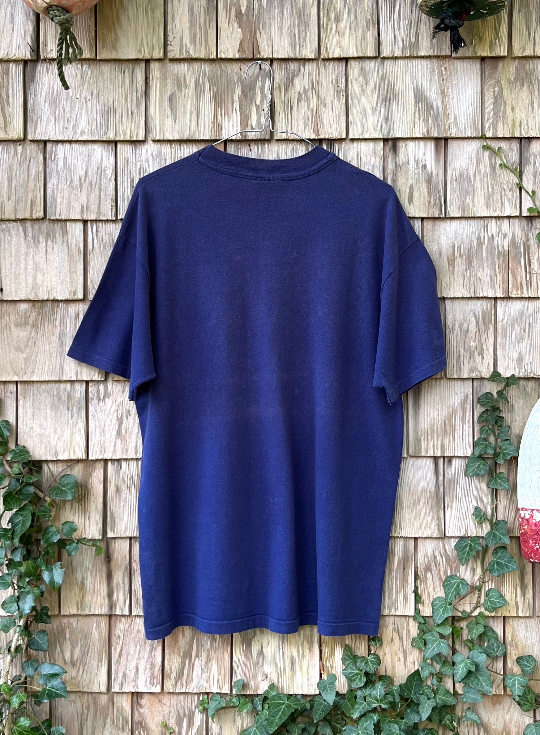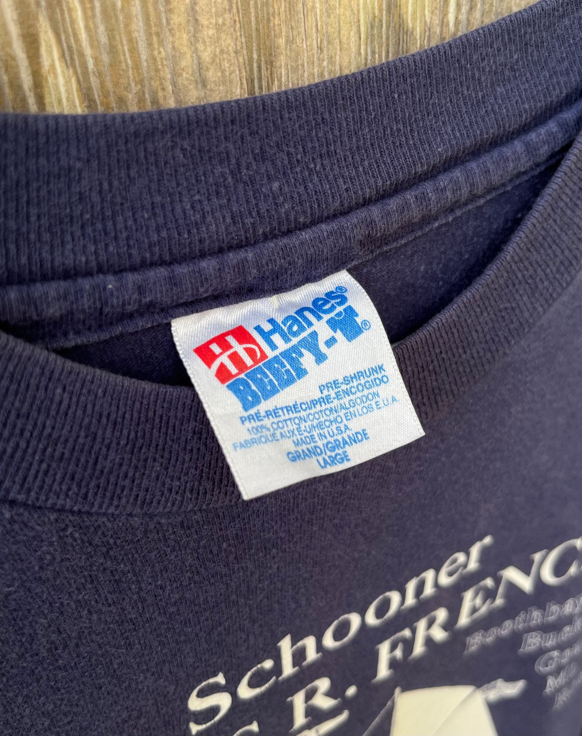 90s Schooner Lewis R. French Rockland/Camden Maine t-shirt. Navy blue with white print on chest. 100% cotton, made in the USA, Hanes Beefy-T blank.