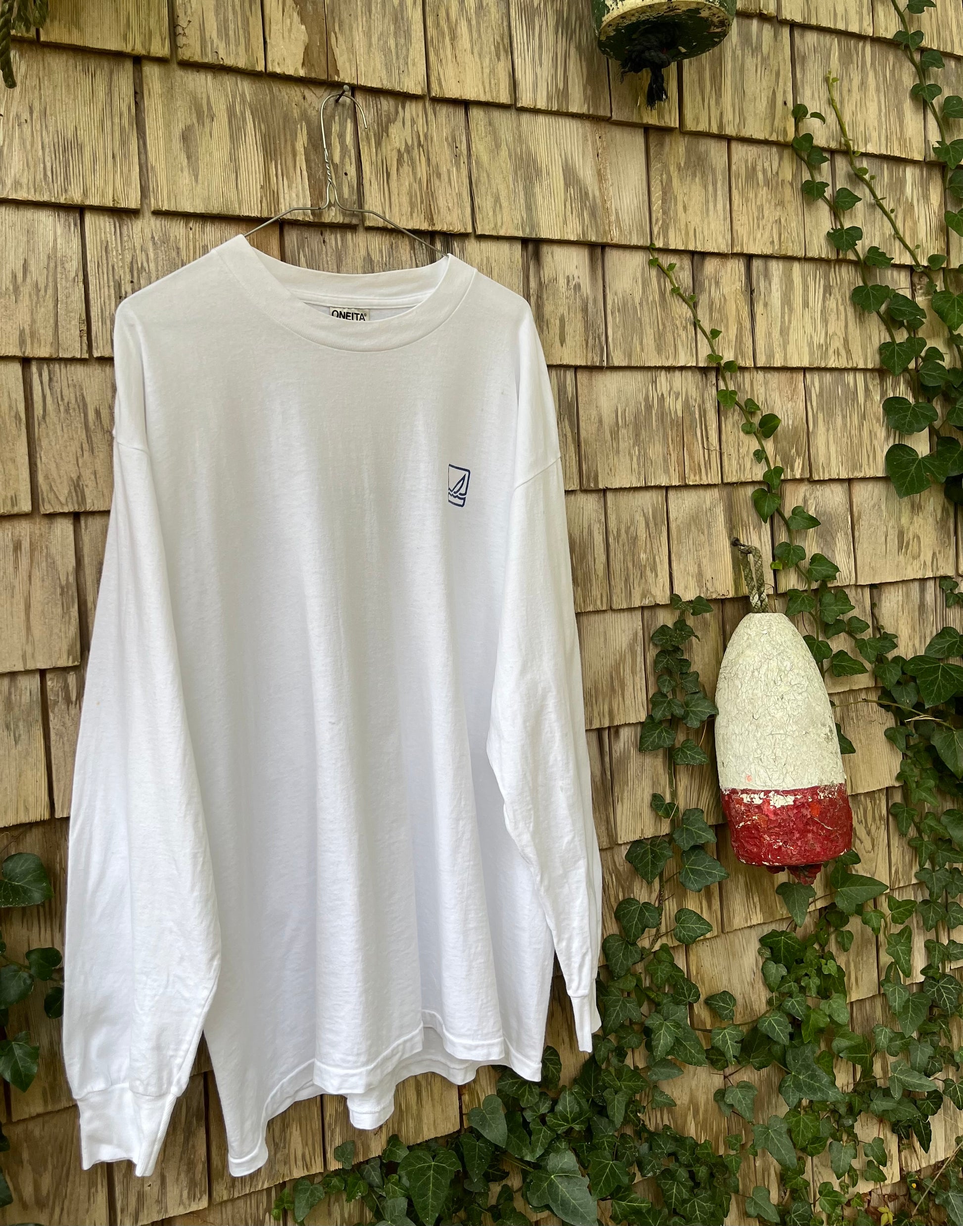90s Sperry Top-Sider long sleeve t-shirt. White with blue prints on chest and rear. 100% cotton, made in the USA, Oneita Power-T blank.