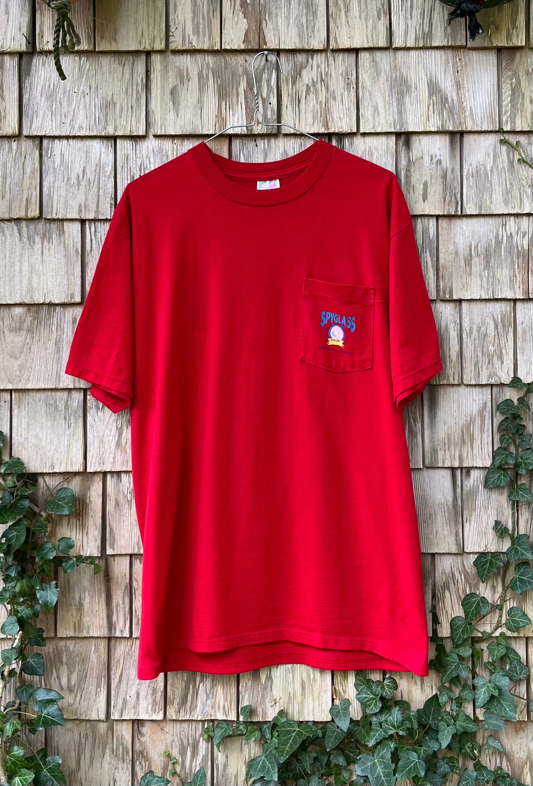 1996 Spyglass Race, Dana West Yacht Club vs. Southwestern Yacht Club, pocket t-shirt. Red with multicolor prints on chest pocket and rear. Heavyweight 50/50 cotton blend, made in the USA, Jerzees blank.