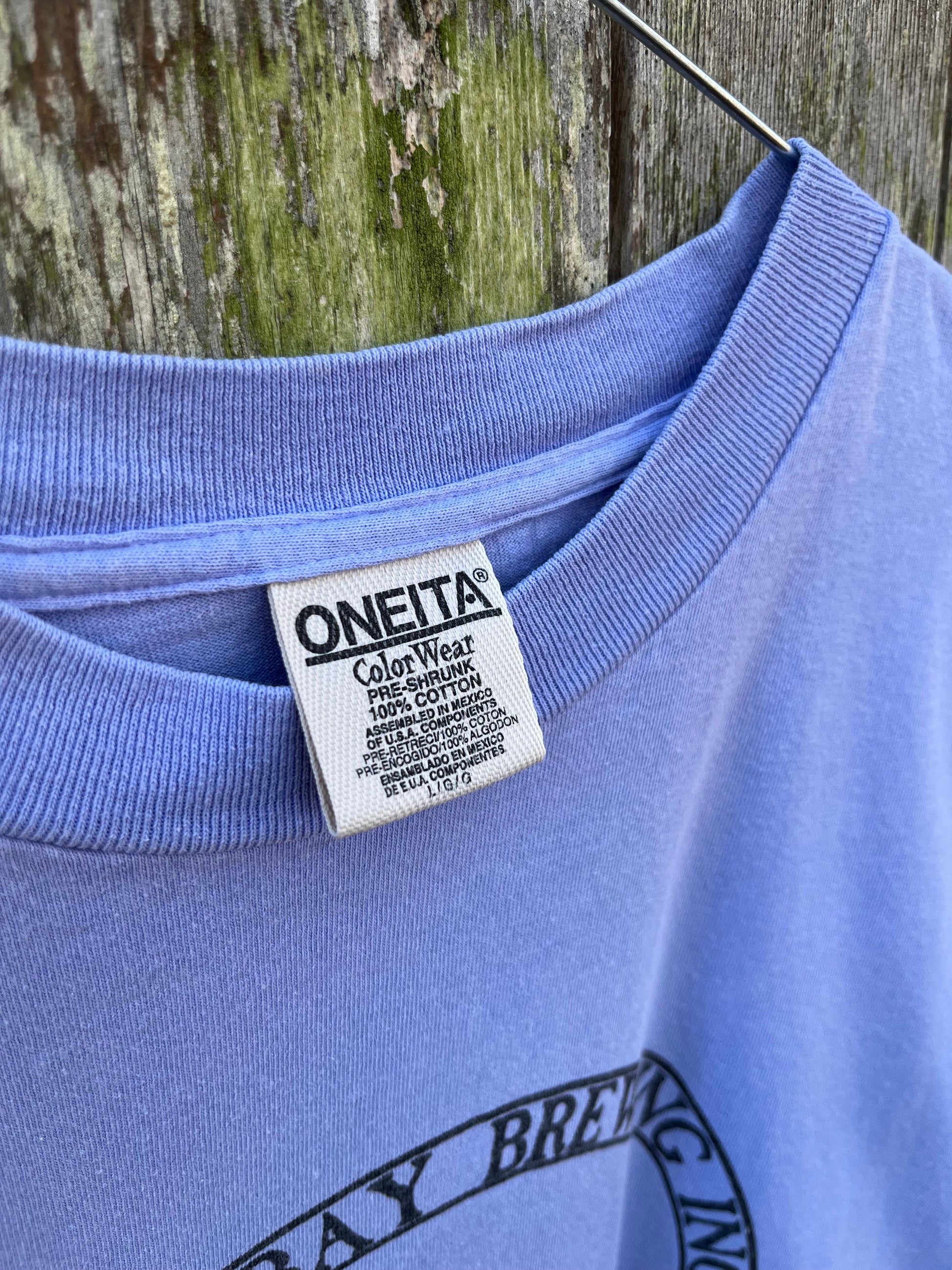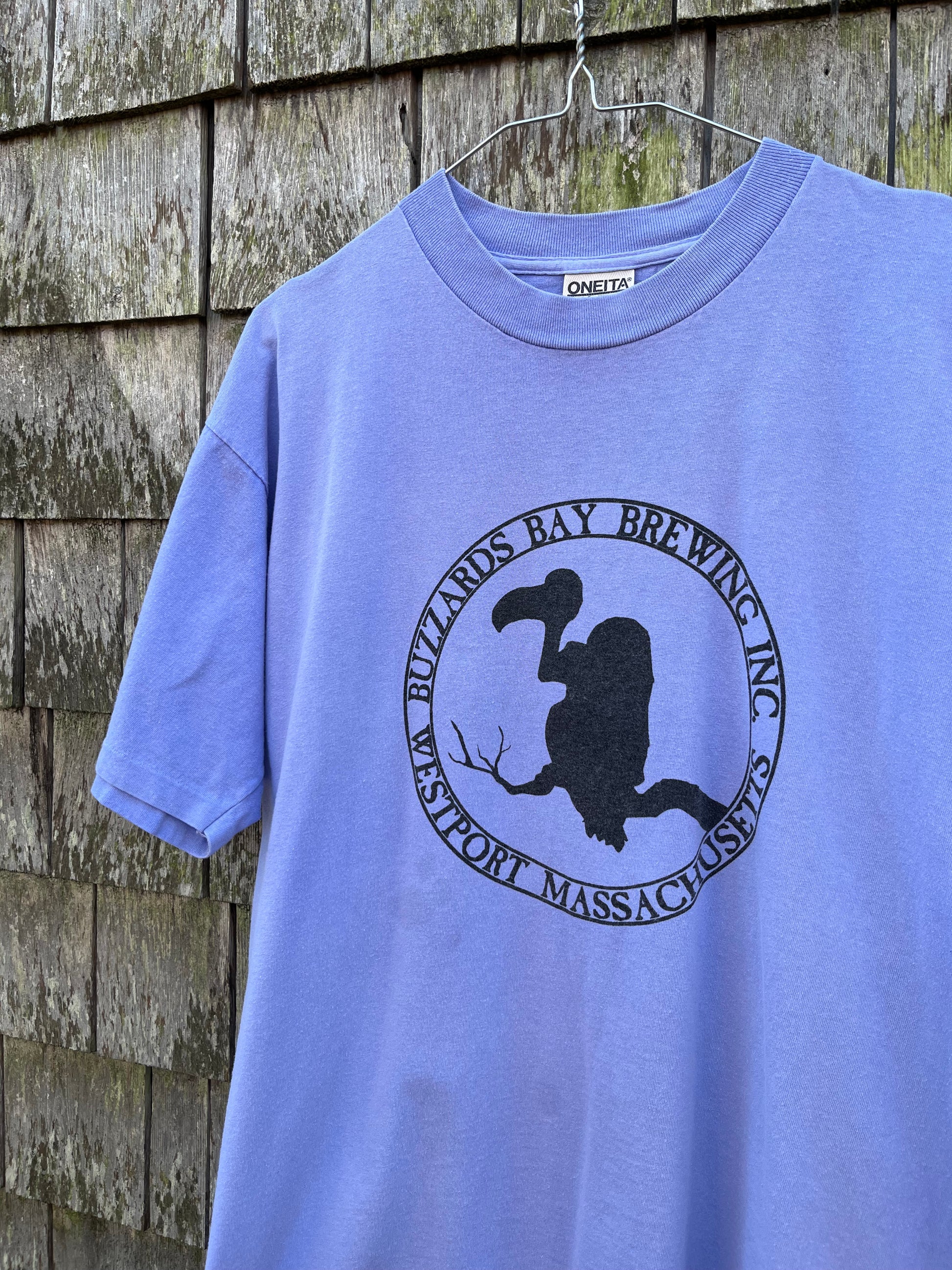 1990s The Back Eddy Bar at Buzzard's Bay Brewing Company t-shirt. Pigment dye light blue with black print on chest and rear. 100% cotton, Oneita Color Wear blank.