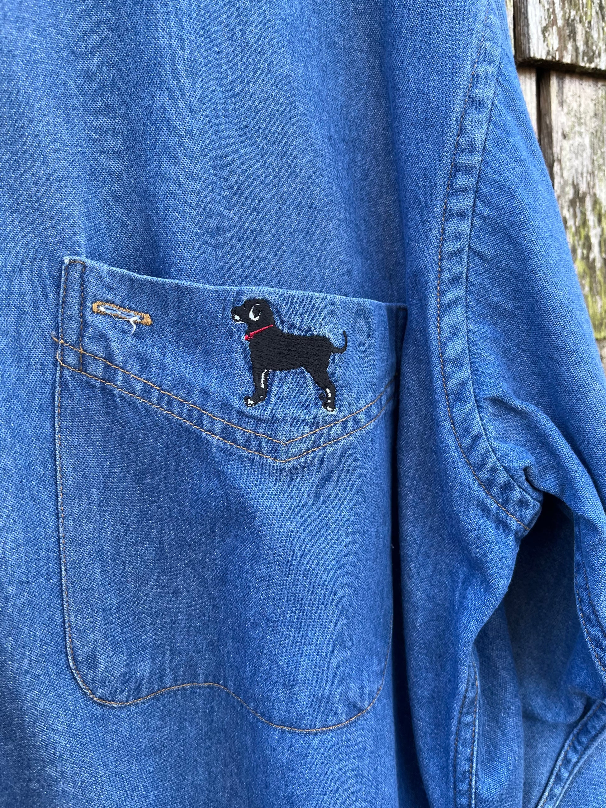 1990s The Black Dog Martha's Vineyard Indigo denim button down shirt. Classic indigo blue denim with black dog embroidery on chest pocket. Button down collar, real collar keeper button.