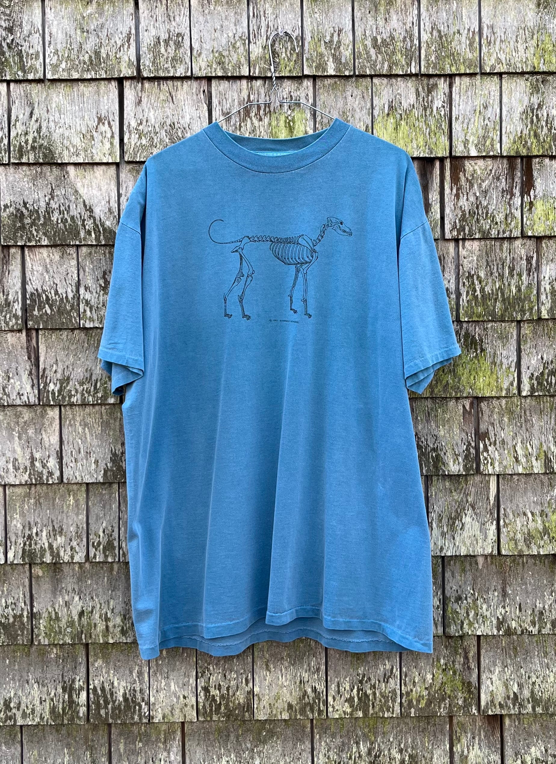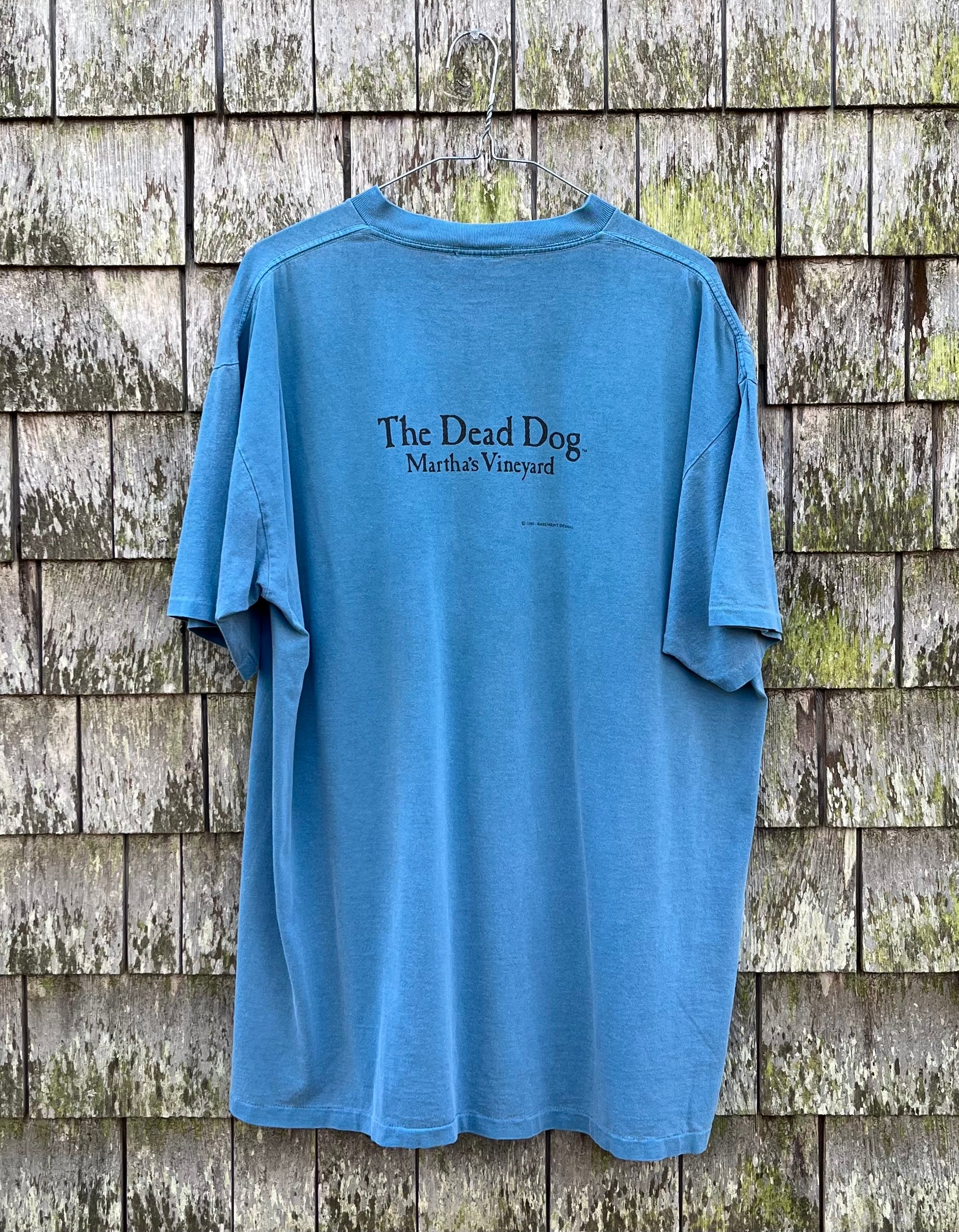 1990s The Dead Dog Martha's Vineyard t-shirt. Pigment overdyed blue with black prints on chest and rear.